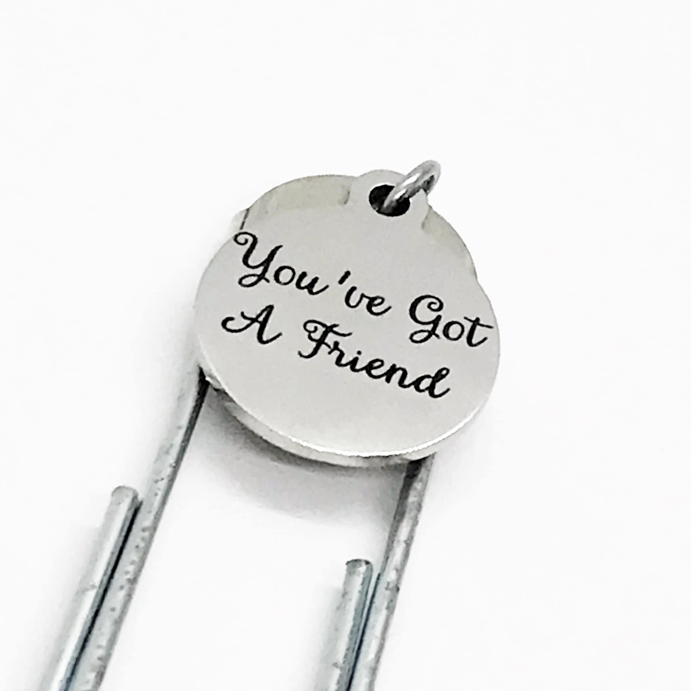 This bookmark has stainless steel laser engraved charm that says, “You’ve got a friend” on it. This charm measures approx. 3/4 inch across.