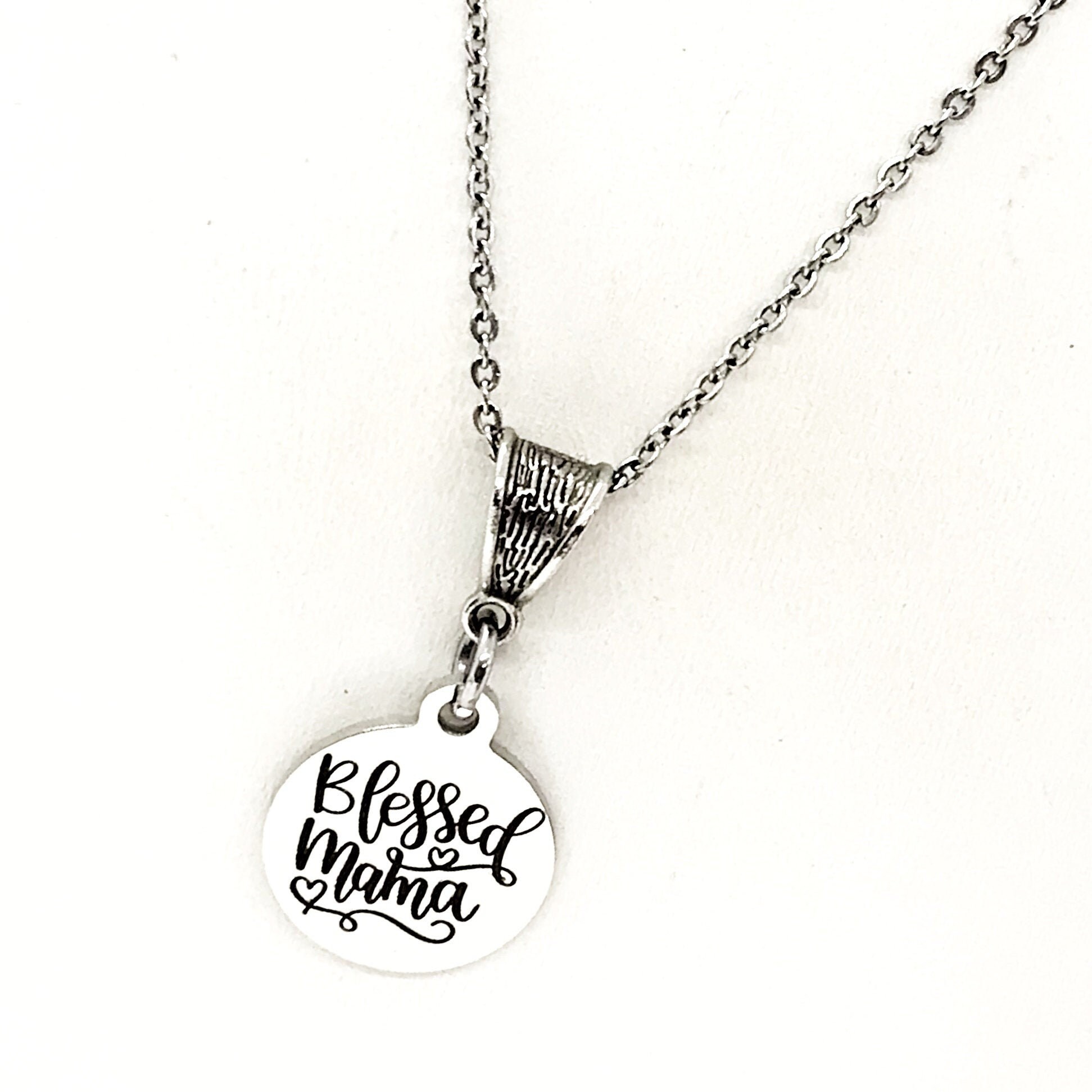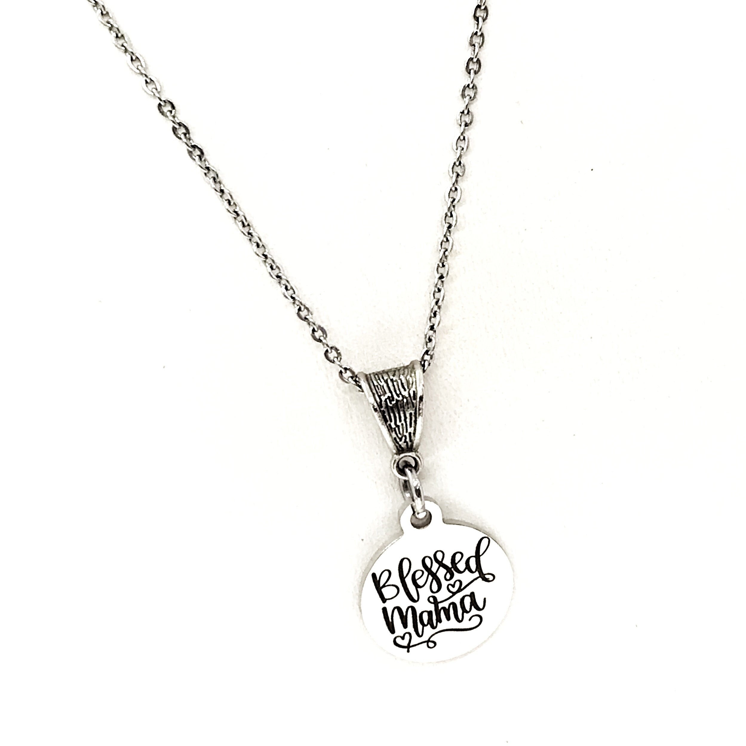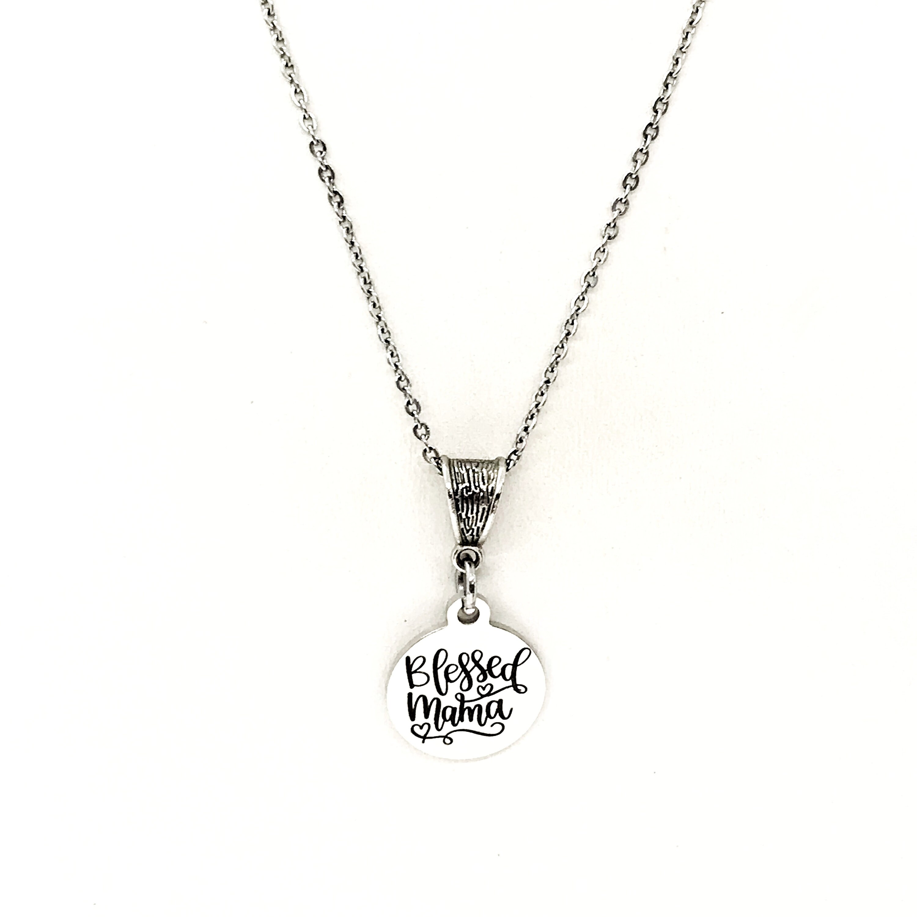 This necklace is a simple but beautiful gift for a loved one in your life. It is a stainless steel laser engraved charm on a stainless steel link chain with a silver-tone bale. The charm has “Blessed Mama” on it.