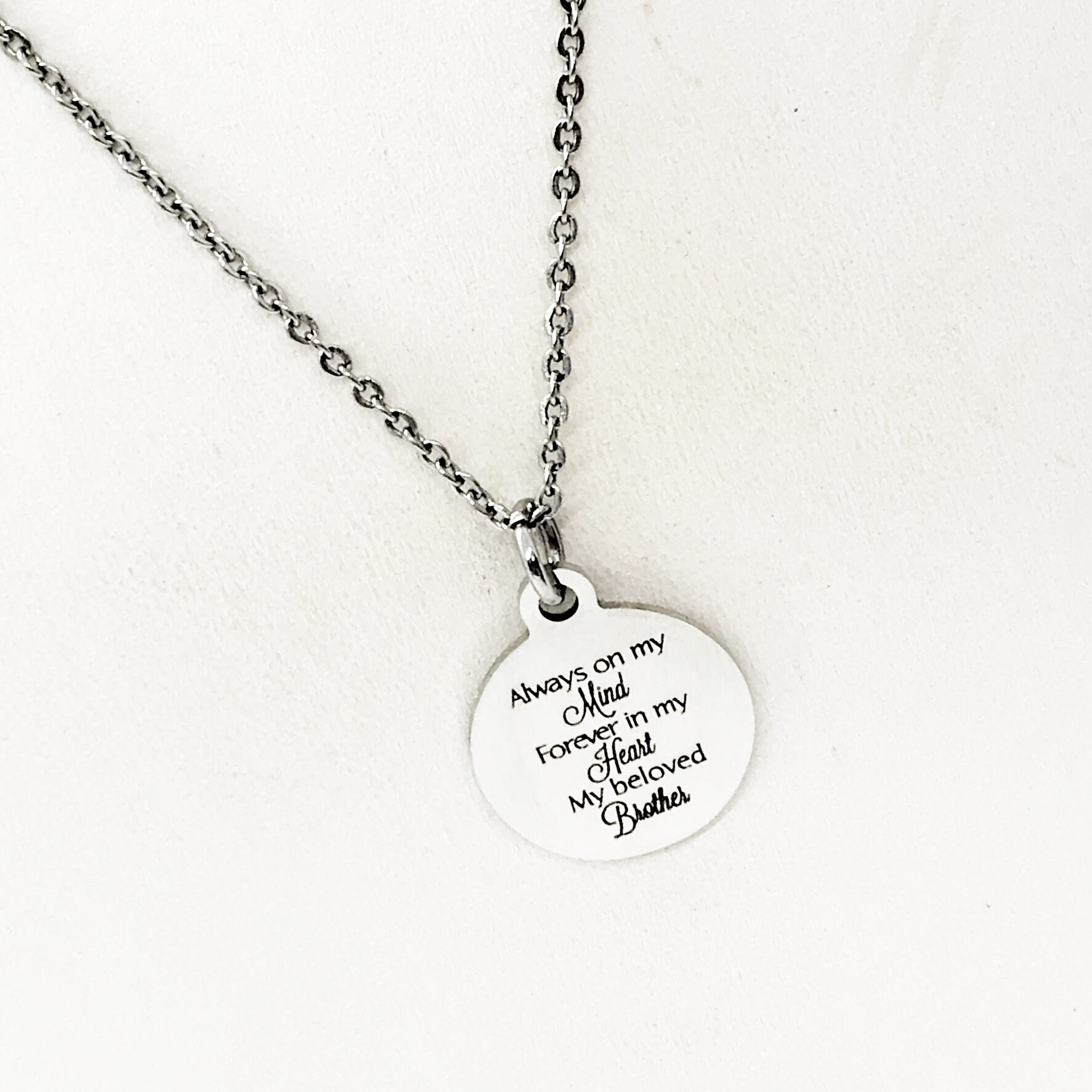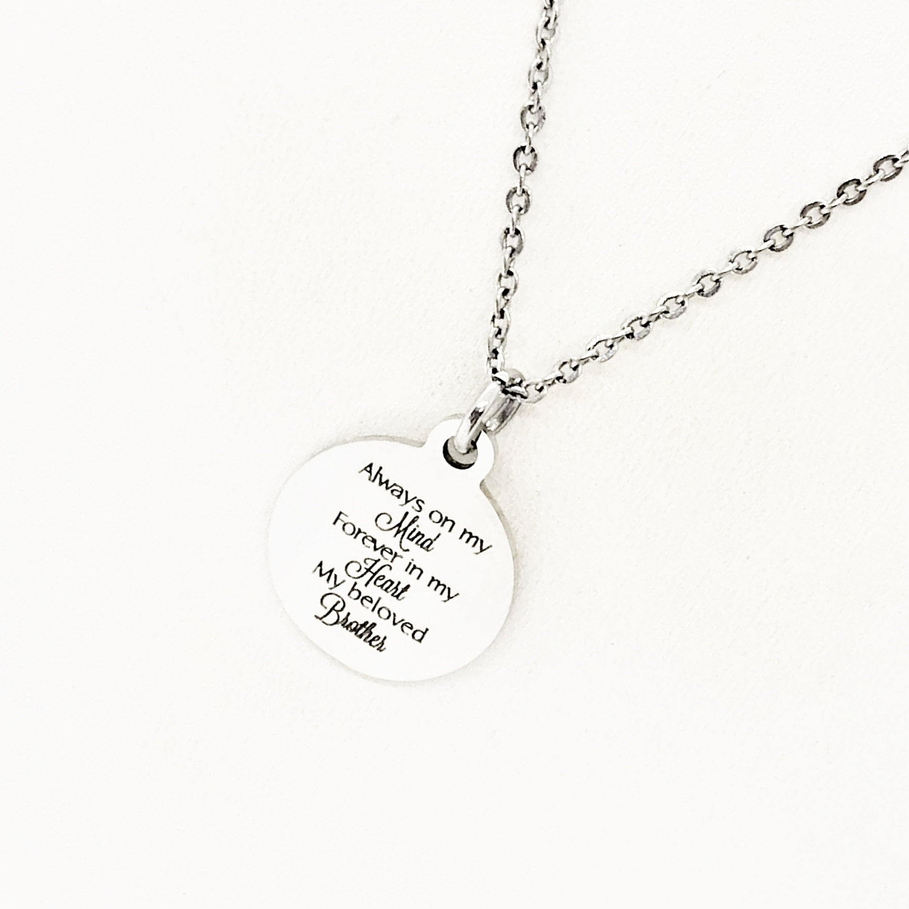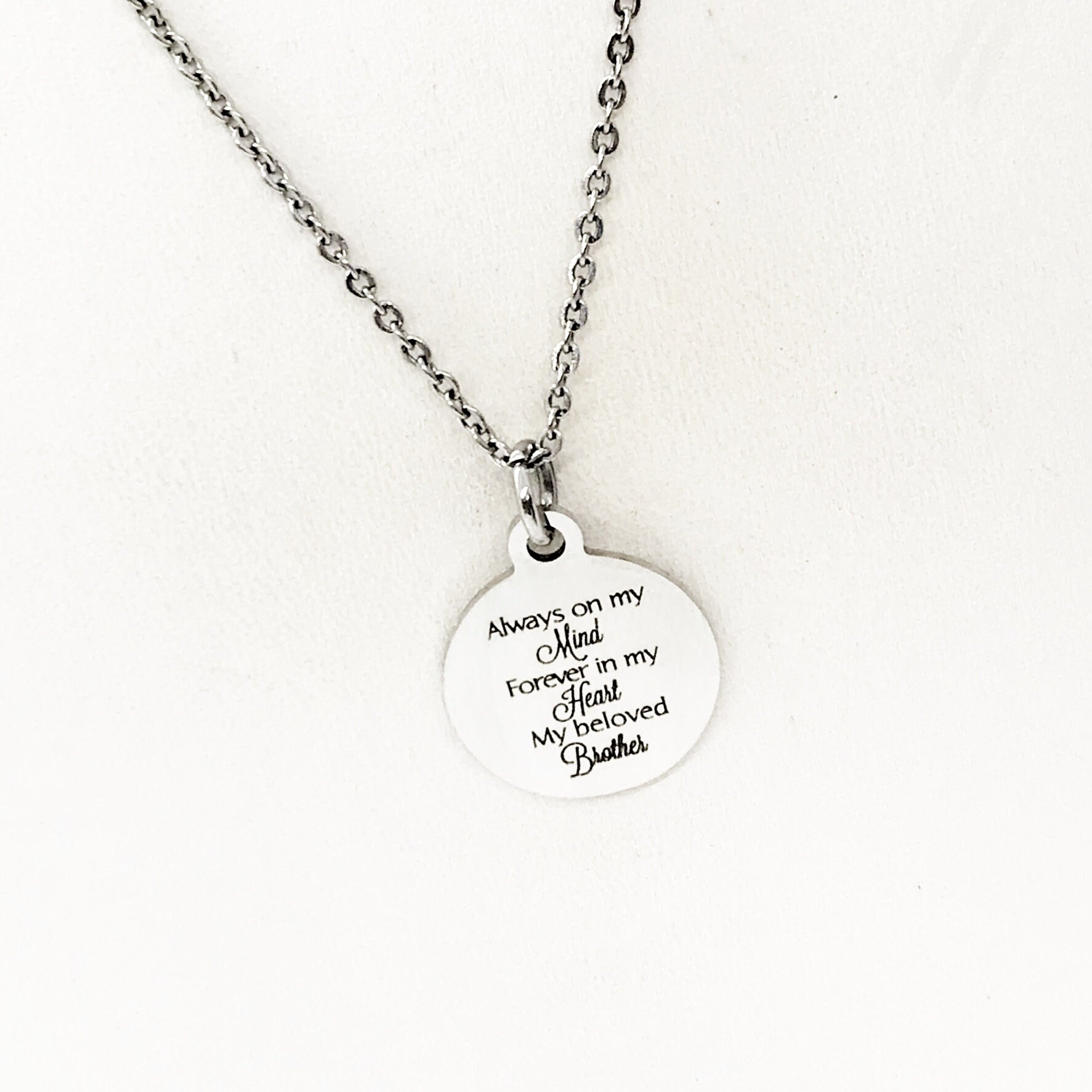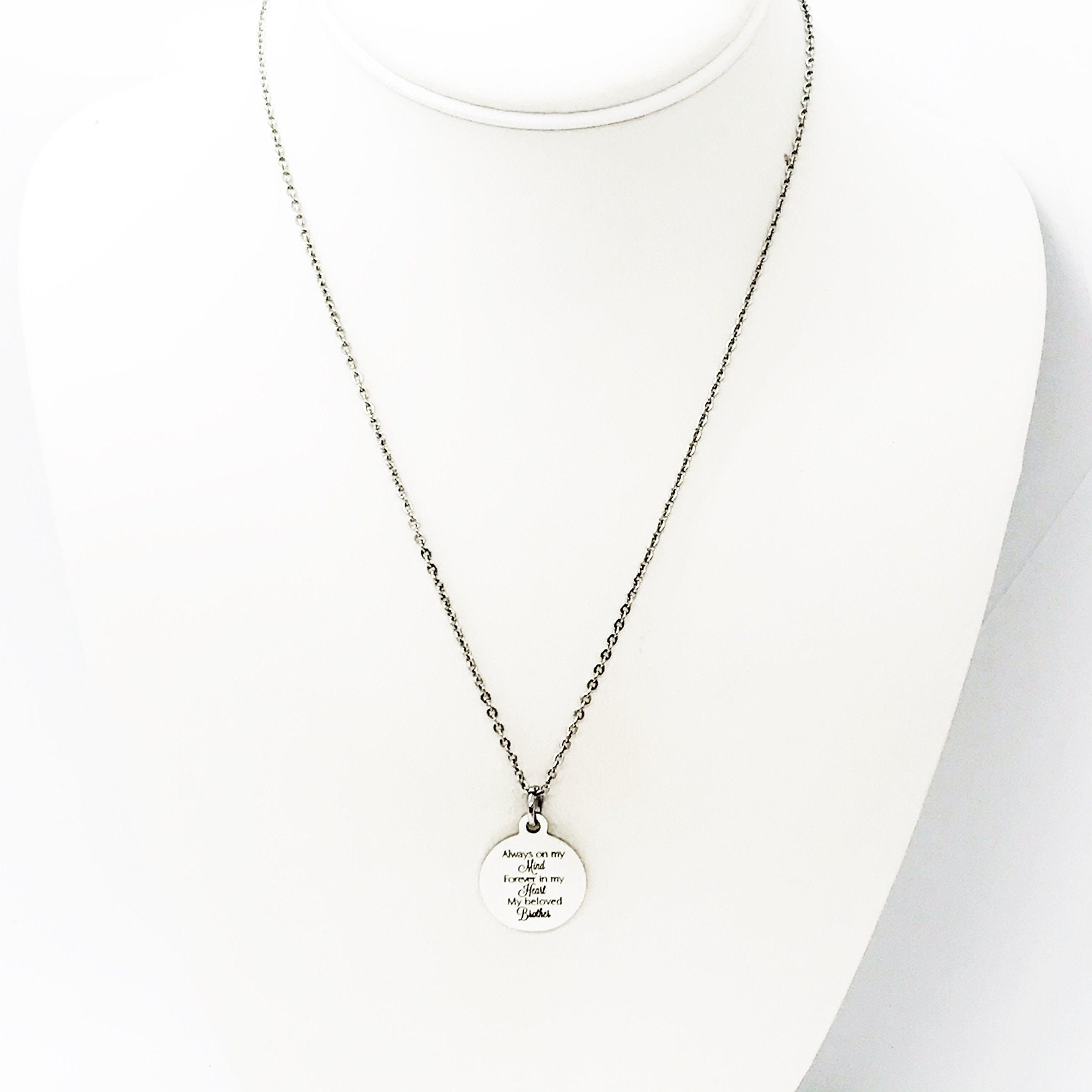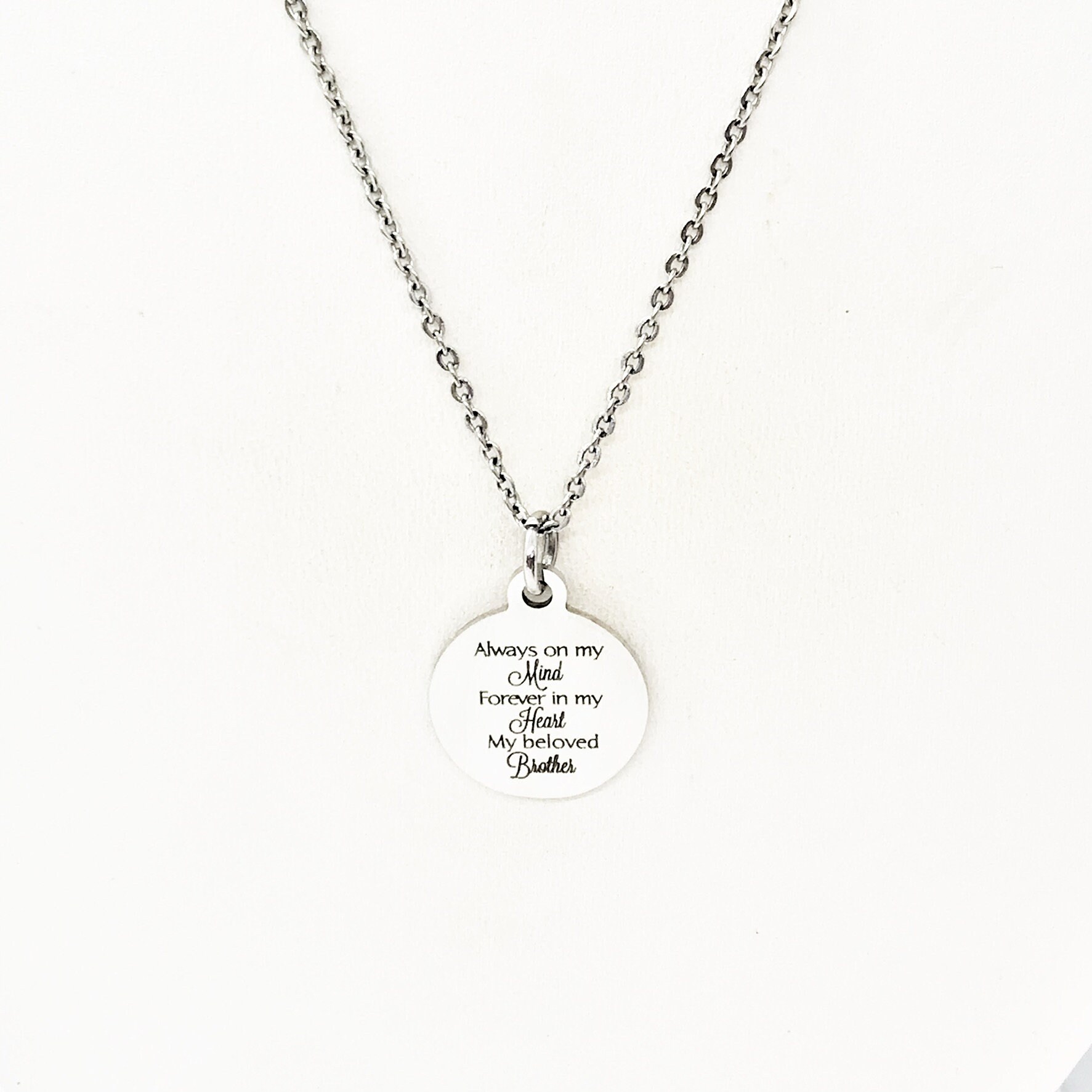 This beautiful necklace would make a wonderful gift. The pendant is a stainless steel laser engraved pendant that has “Always on my mind, Forever in my heart, My beloved brother” on it.