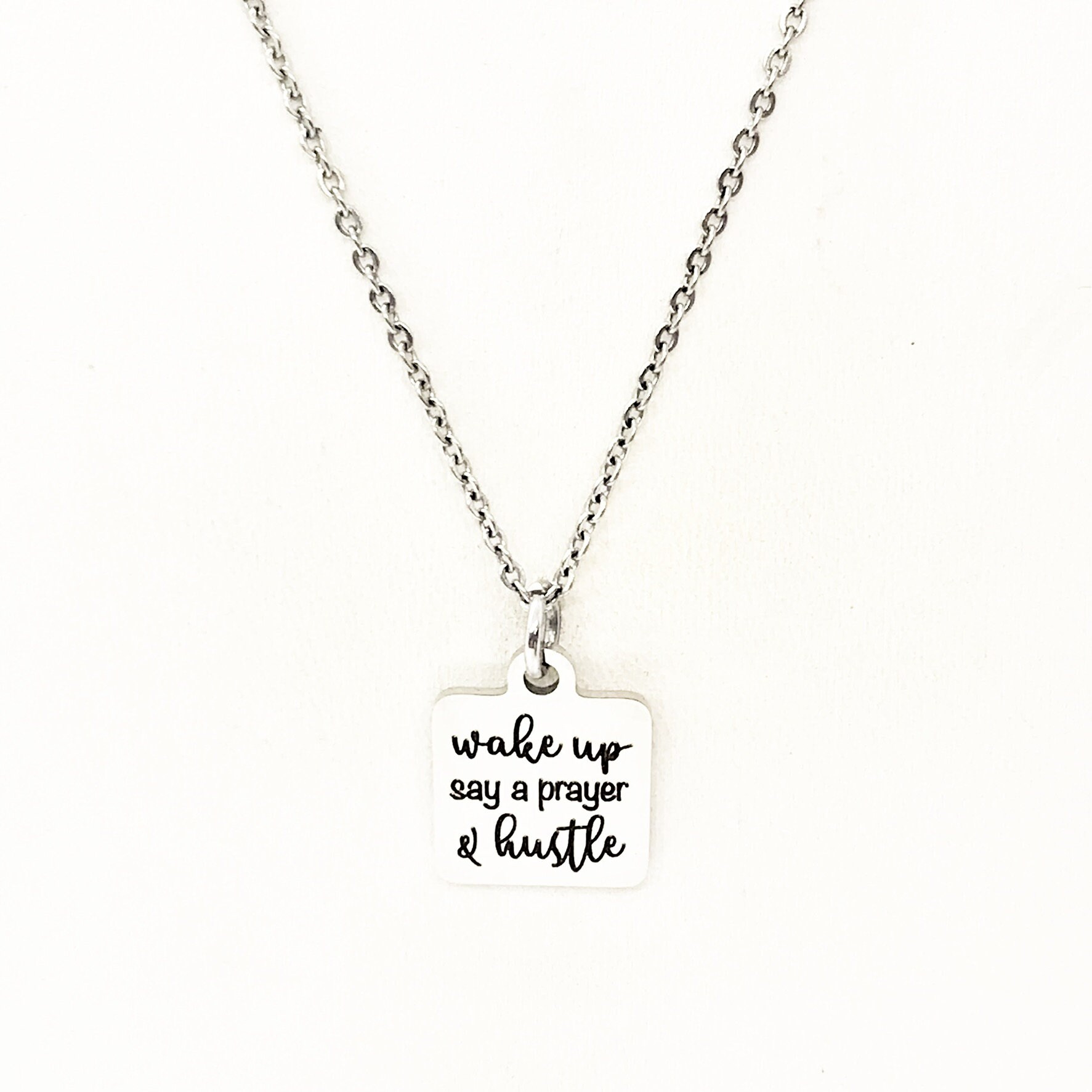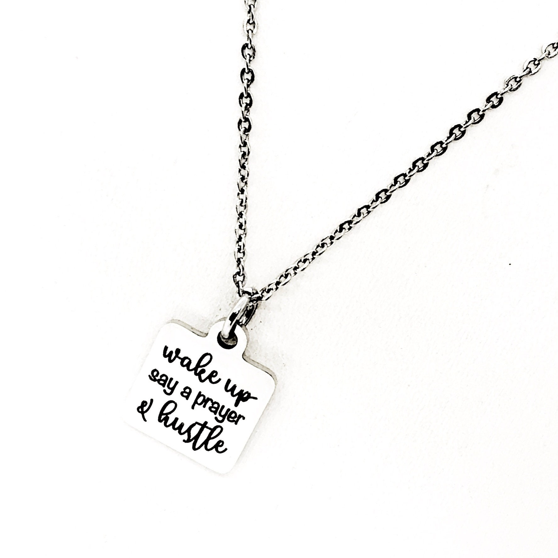 This beautiful necklace would make a wonderful gift. The pendant is a stainless steel laser engraved pendant that has “Wake Up, Say A Prayer & Hustle” on it.