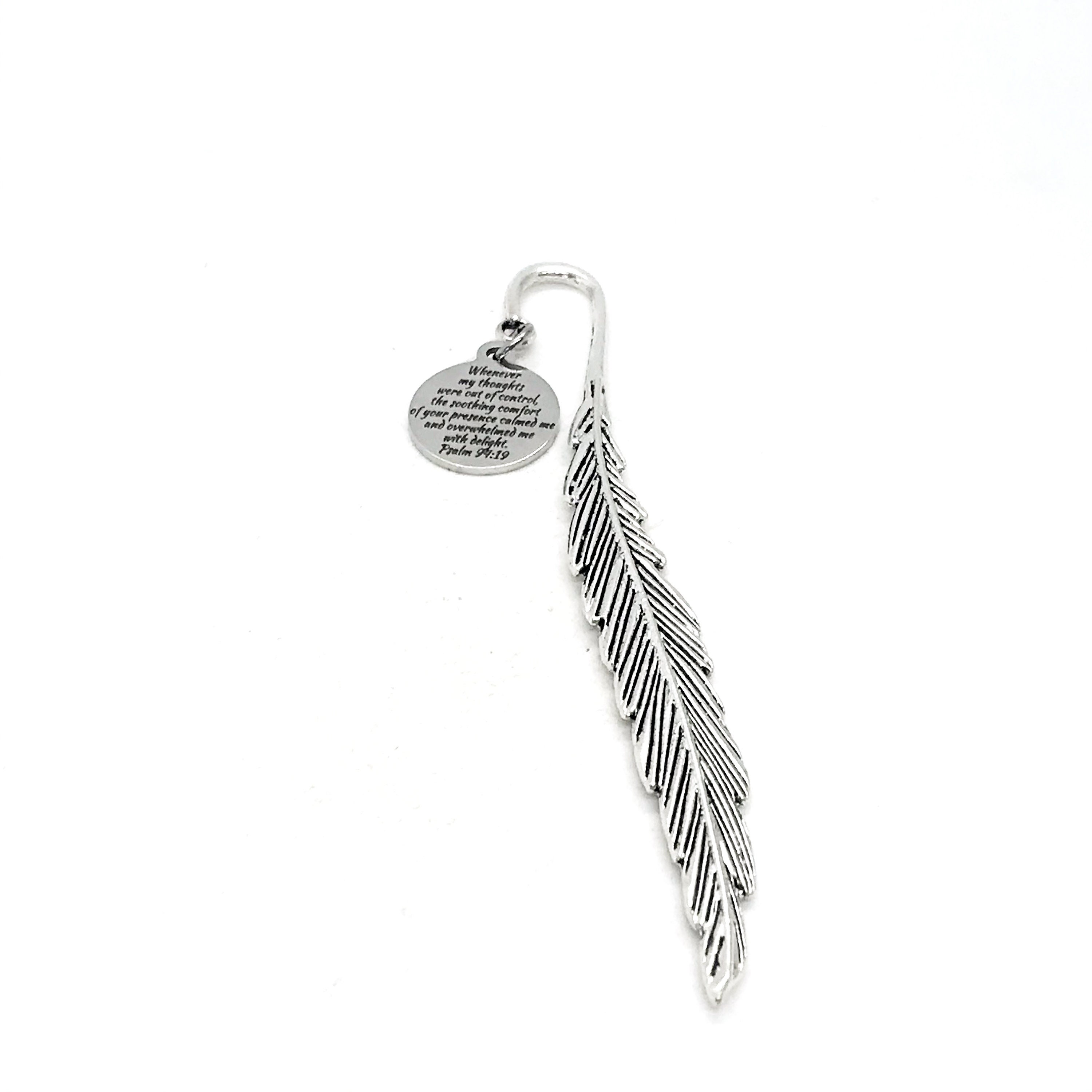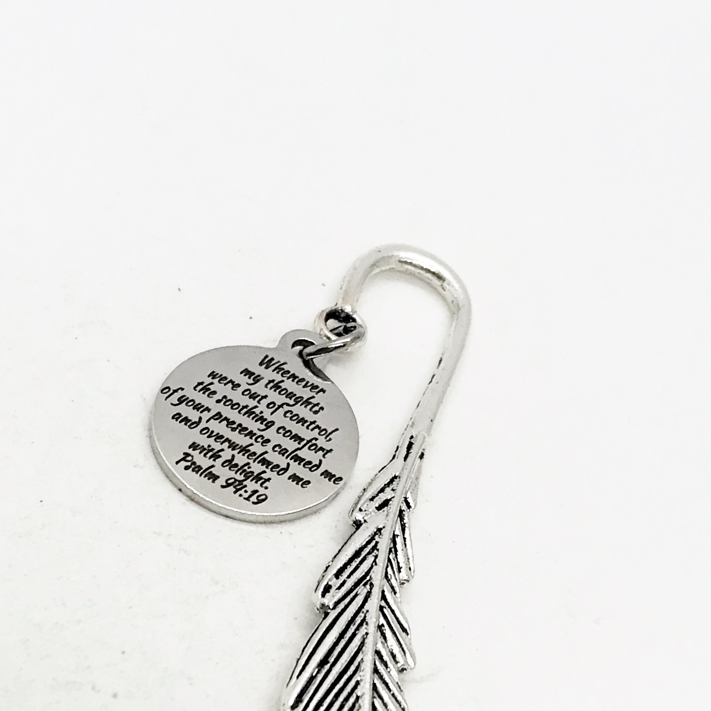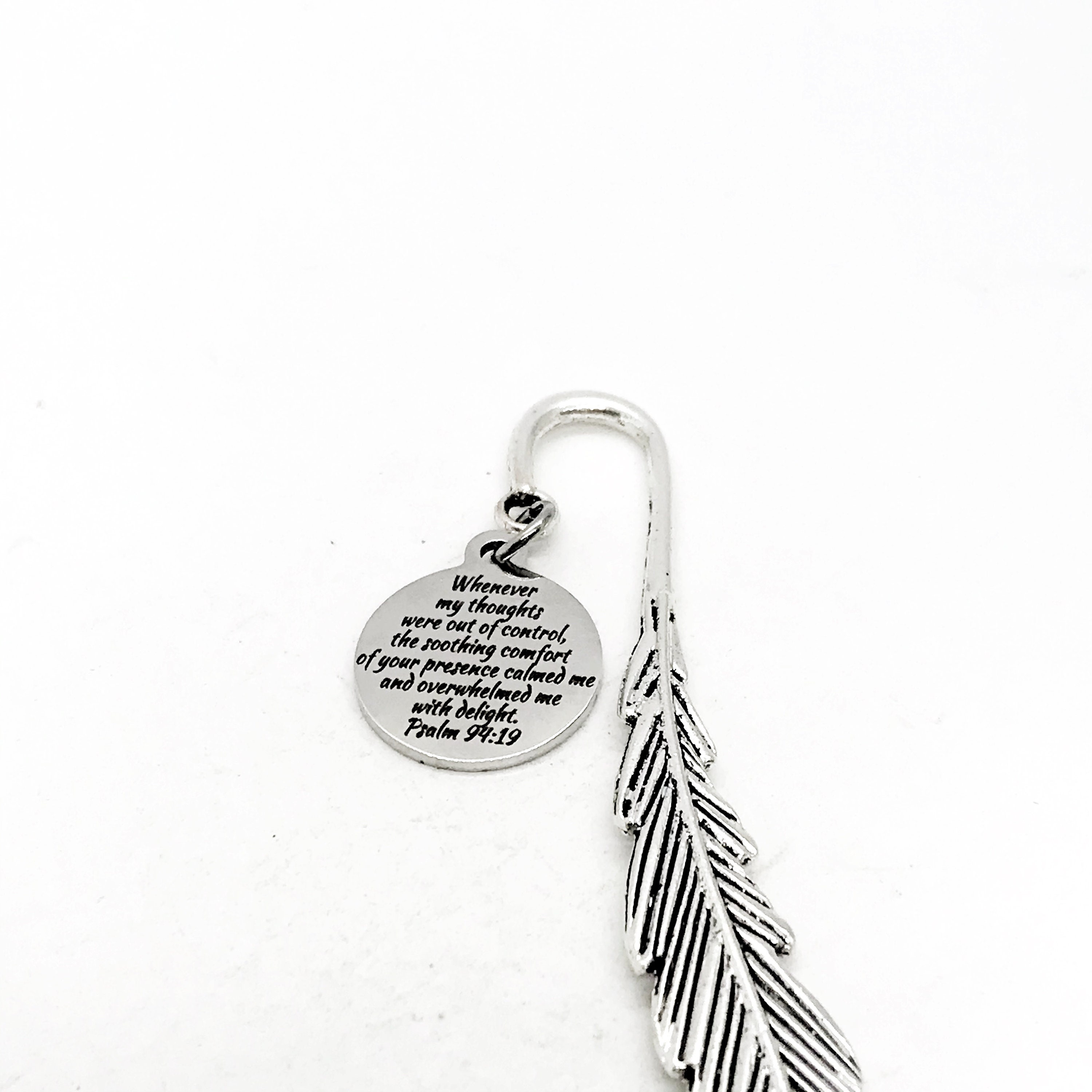 This is a great gift to remind someone that God can calm our thoughts when we are worried. It is a metal bookmark that has an engraved charm that has "When my thoughts were out of control, the soothing comfort of your presence calmed me and overwhelmed me with delight" From Psalm 94:19 on it.