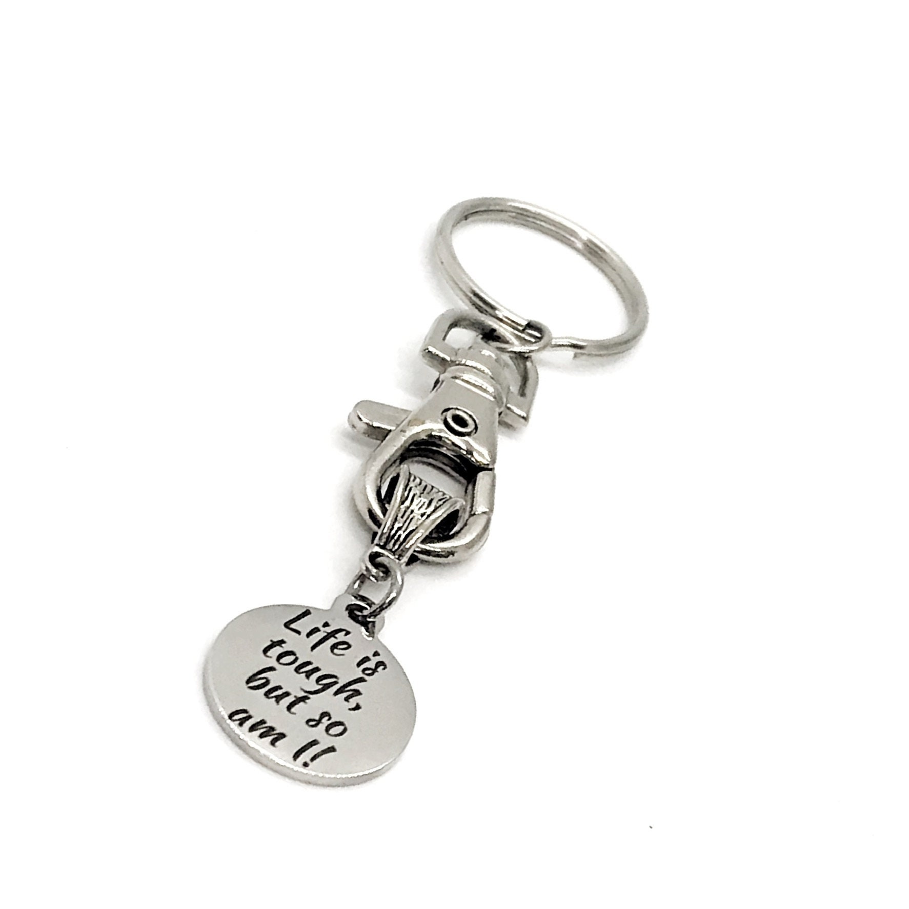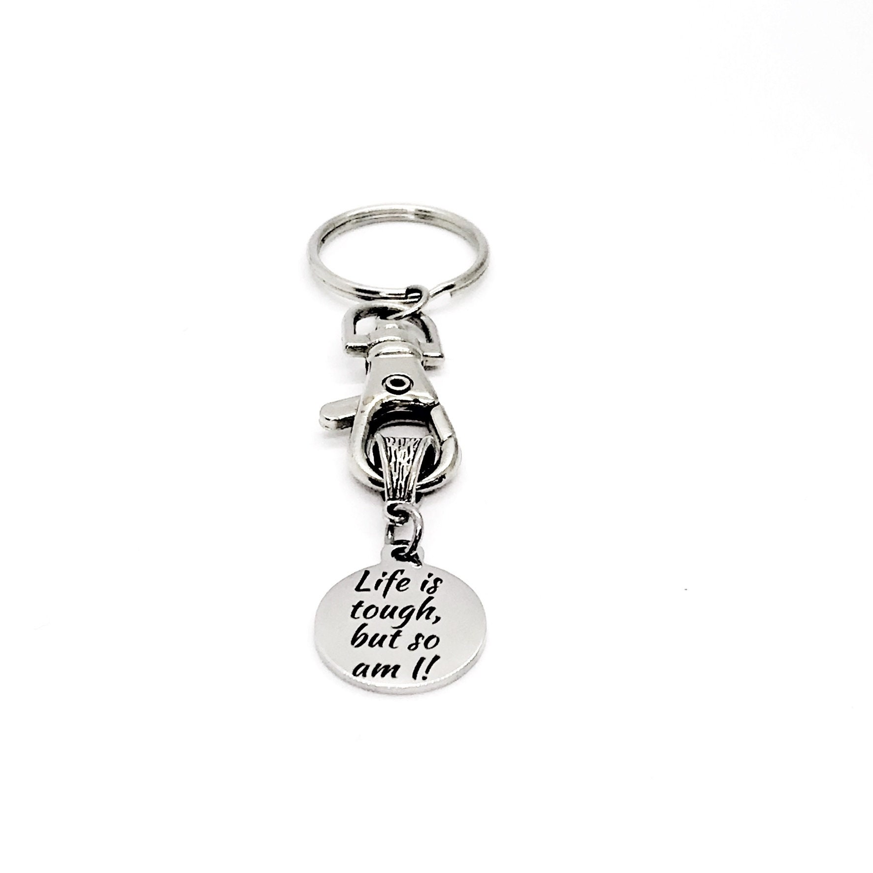 This keychain would make a great gift. It has a stainless steel laser engraved charm with “Life is tough but so am I!” on it.