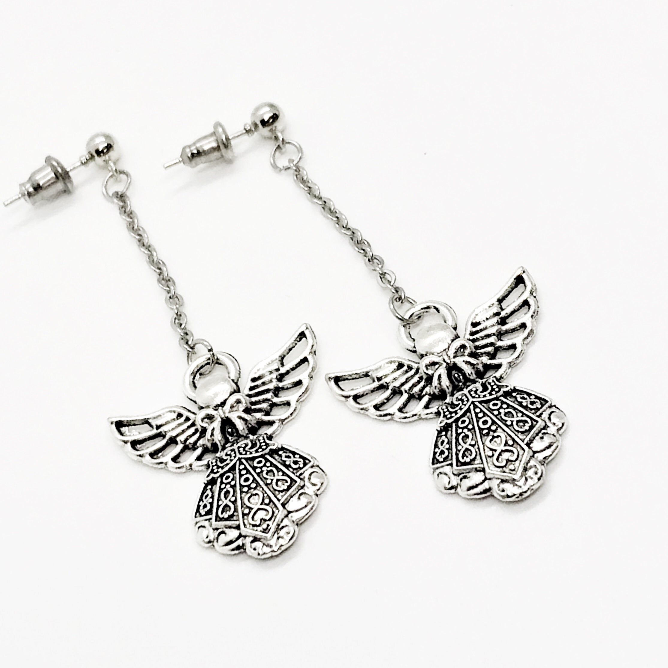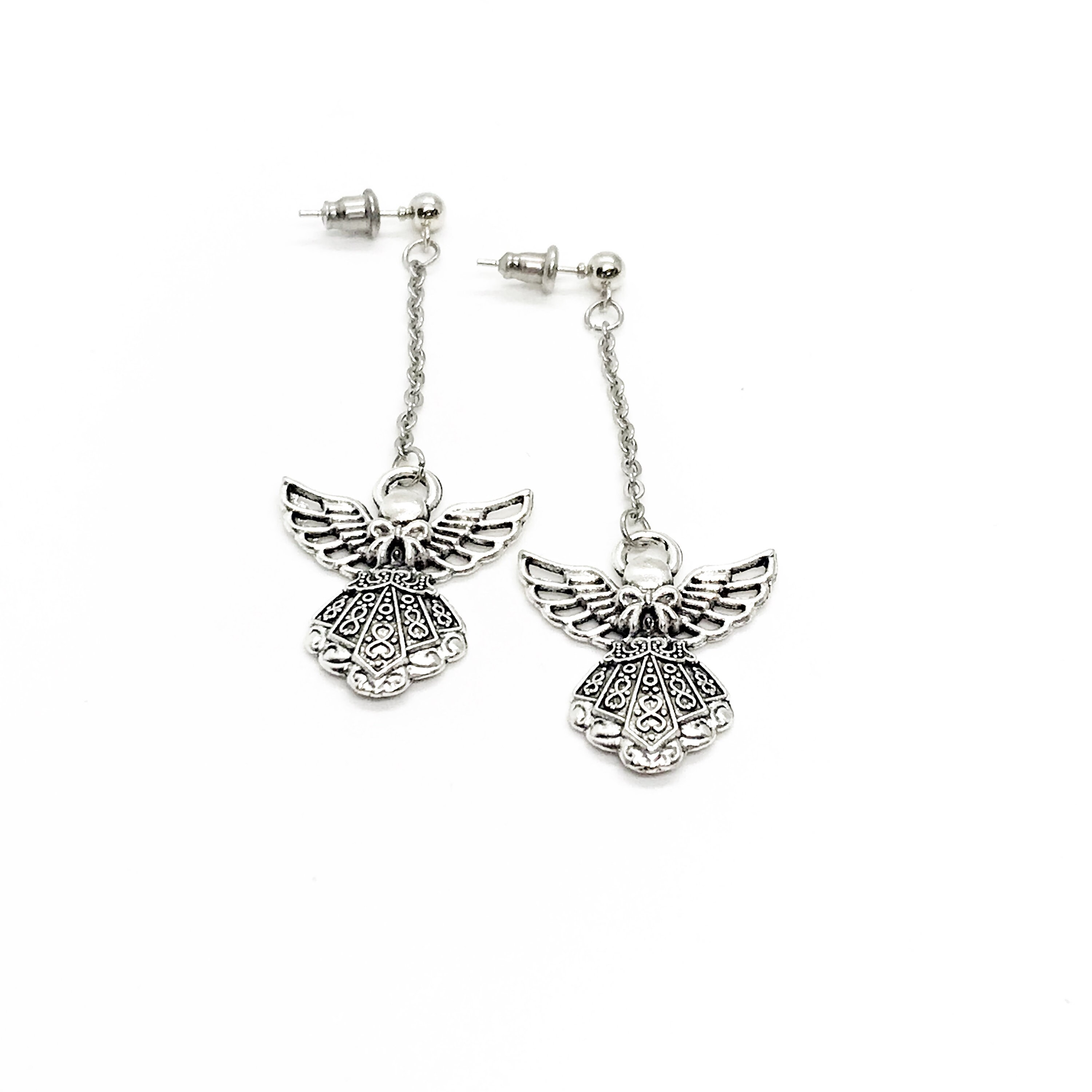 This is a unique and great set of statement earrings. The drop is a silvertone metal and are placed on stainless steel posts. The angel charm measures approx. 1 inch. There are multiple drop length options.