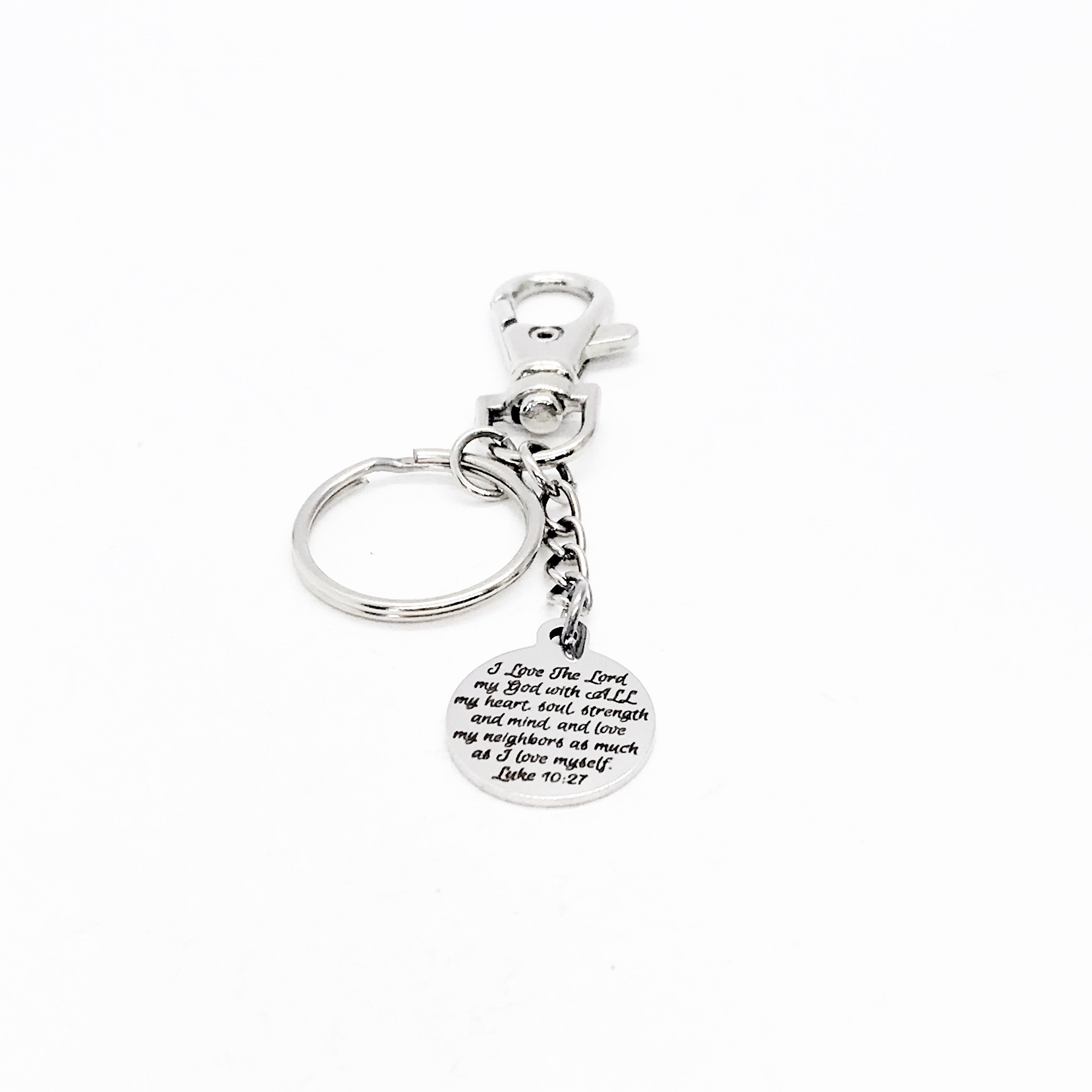 This is a great Christian keychain gift . The keyring can be clipped onto your bag to make it easy to access without digging to the bottom of the bag. It has a stainless steel laser engraved charm with “I love the Lord my God with ALL my heart, soul, strength, and mind, and love my neighbors as much as I love myself” from Luke 10:27 on it.