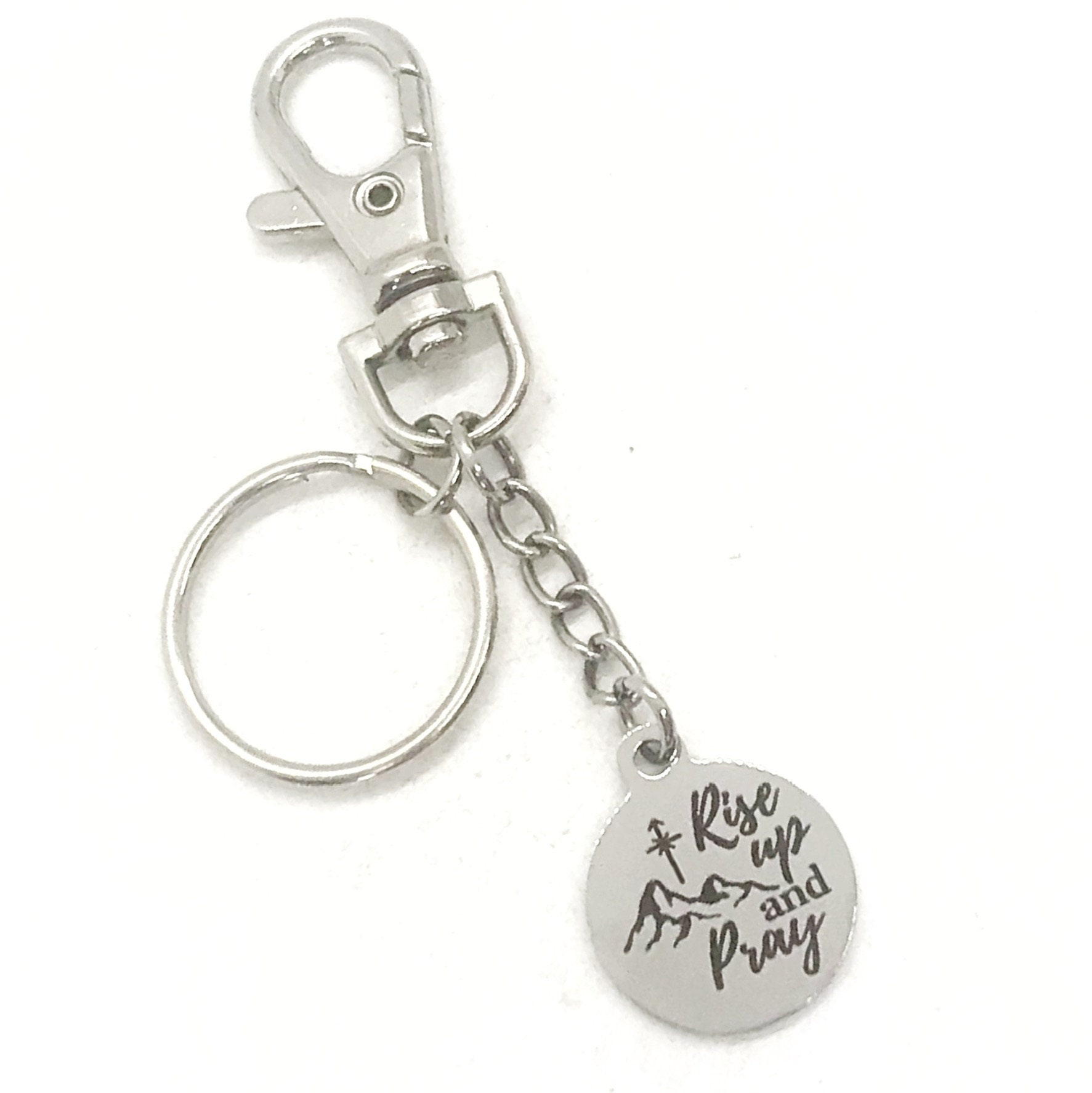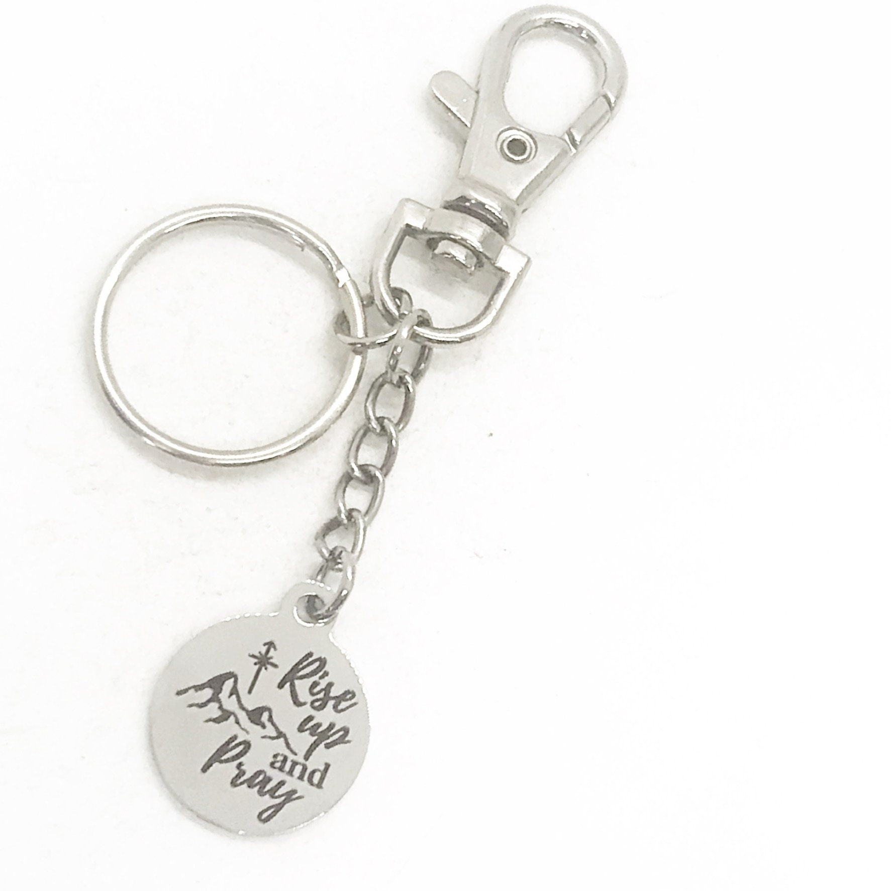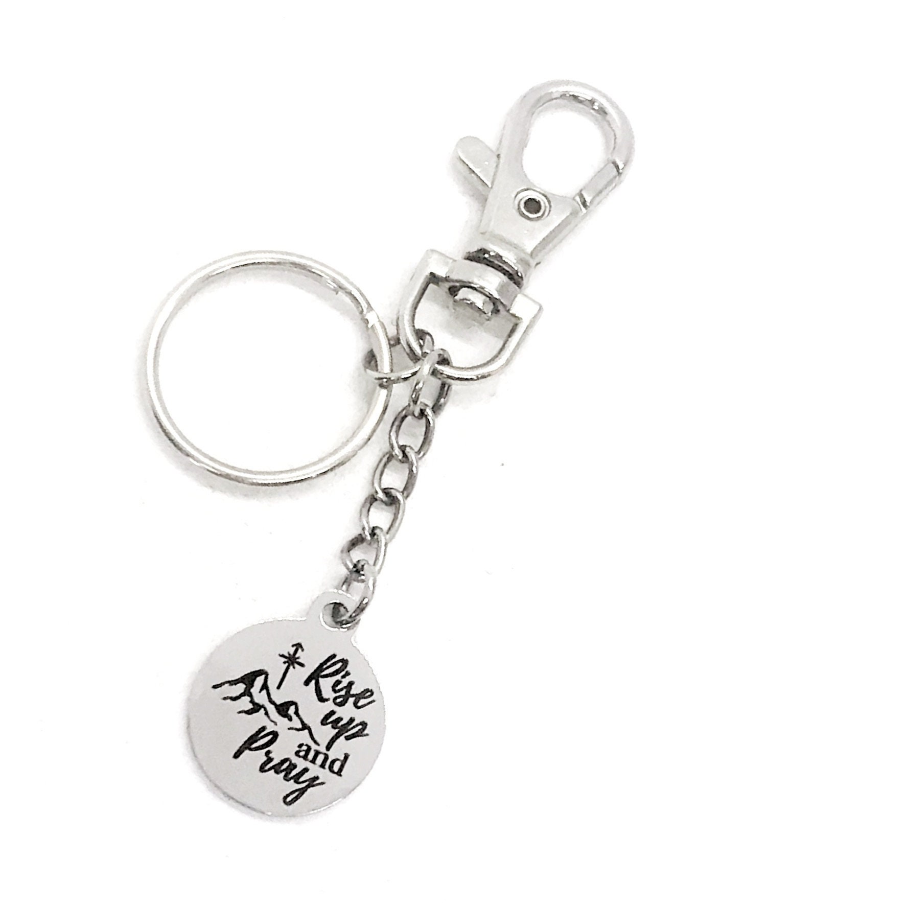 This is a great keychain for encouraging someone. It has a stainless steel laser engraved charm with “Rise Up and Pray” on it. The keyring can be clipped onto your bag to make it easy to access without digging to the bottom of the bag.