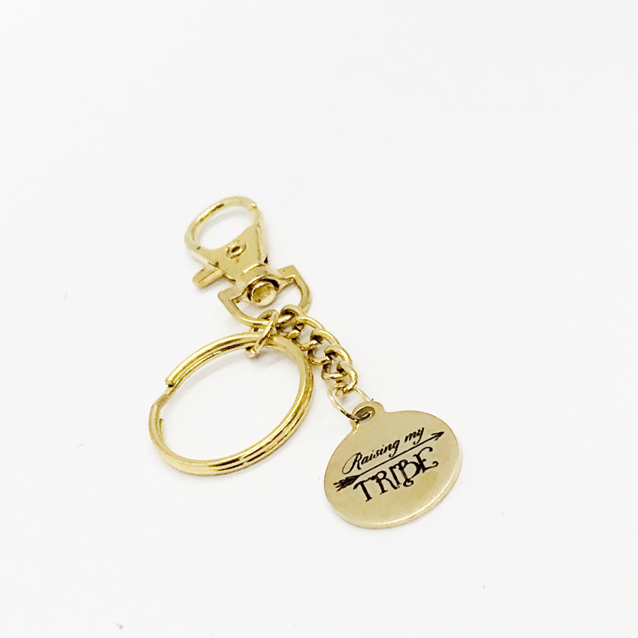 This is a great goldtone keychain gift . The keyring can be clipped onto your bag to make it easy to access without digging to the bottom of the bag. It has a goldtone stainless steel “Raising my Tribe” charm on it.