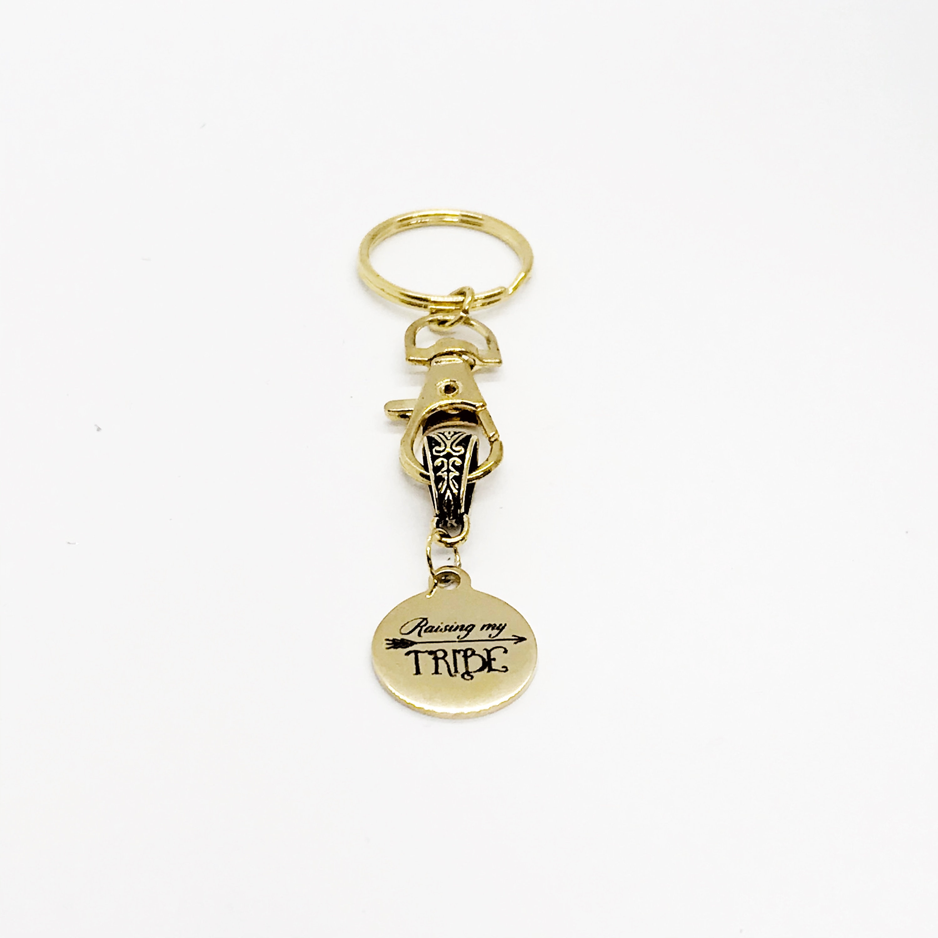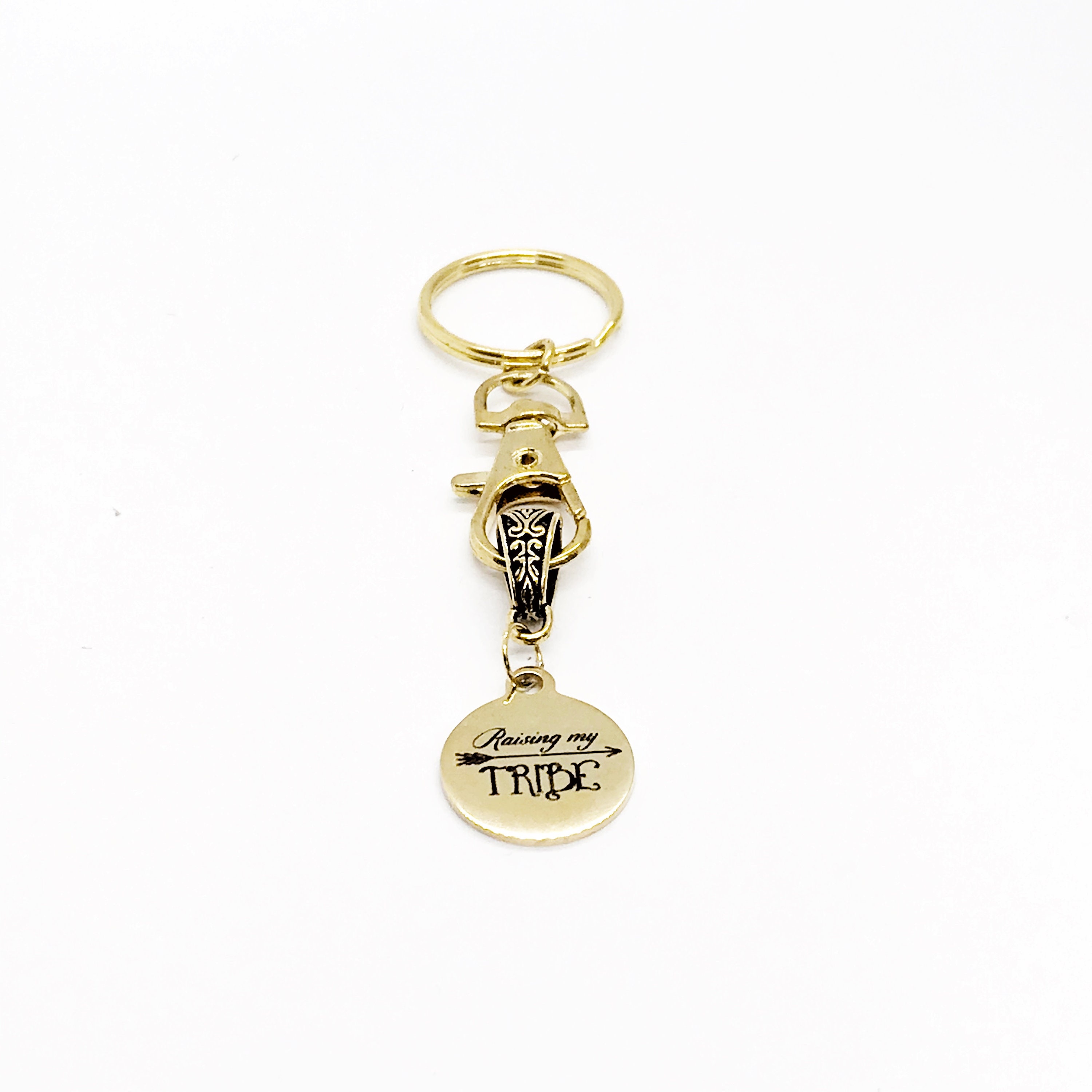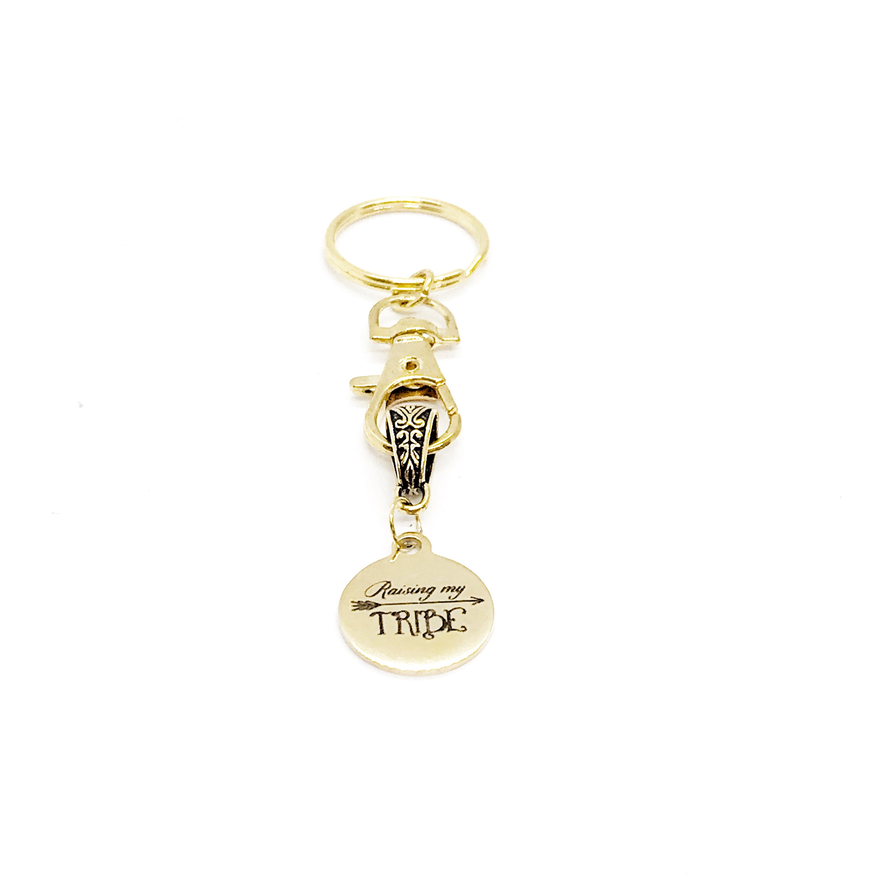 This is a great keychain that has a goldtone stainless steel laser engraved charm which says, “Raising my tribe" on it.