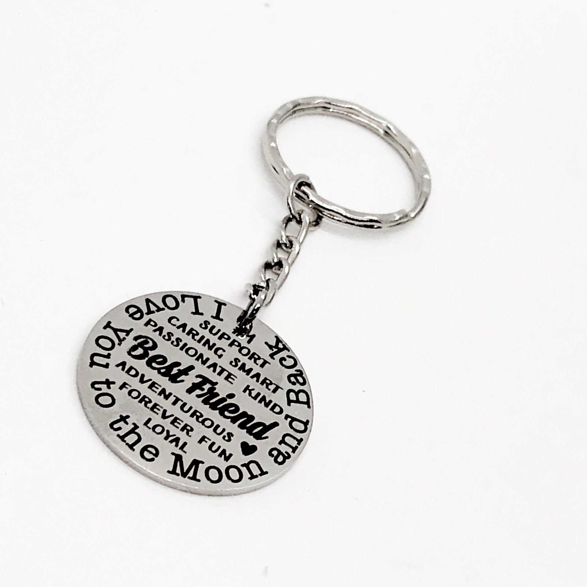 This is a fun keychain gift! It has a stainless steel laser engraved charm with “I Love you to the moon and back, Best Friend, Support, Caring, Smart, Passionate, Kind, Adventurous, Forever, Fun, Loyal” on it.