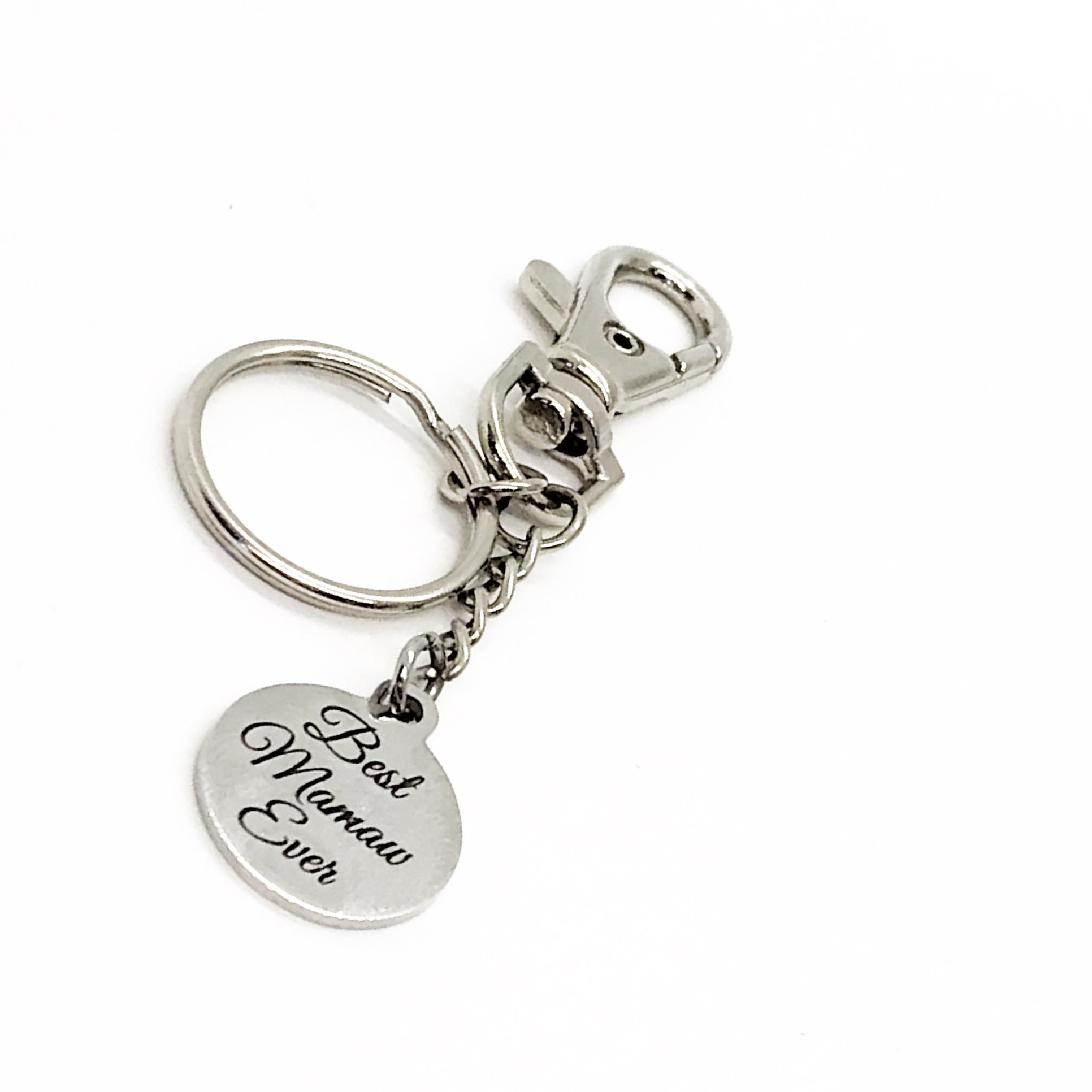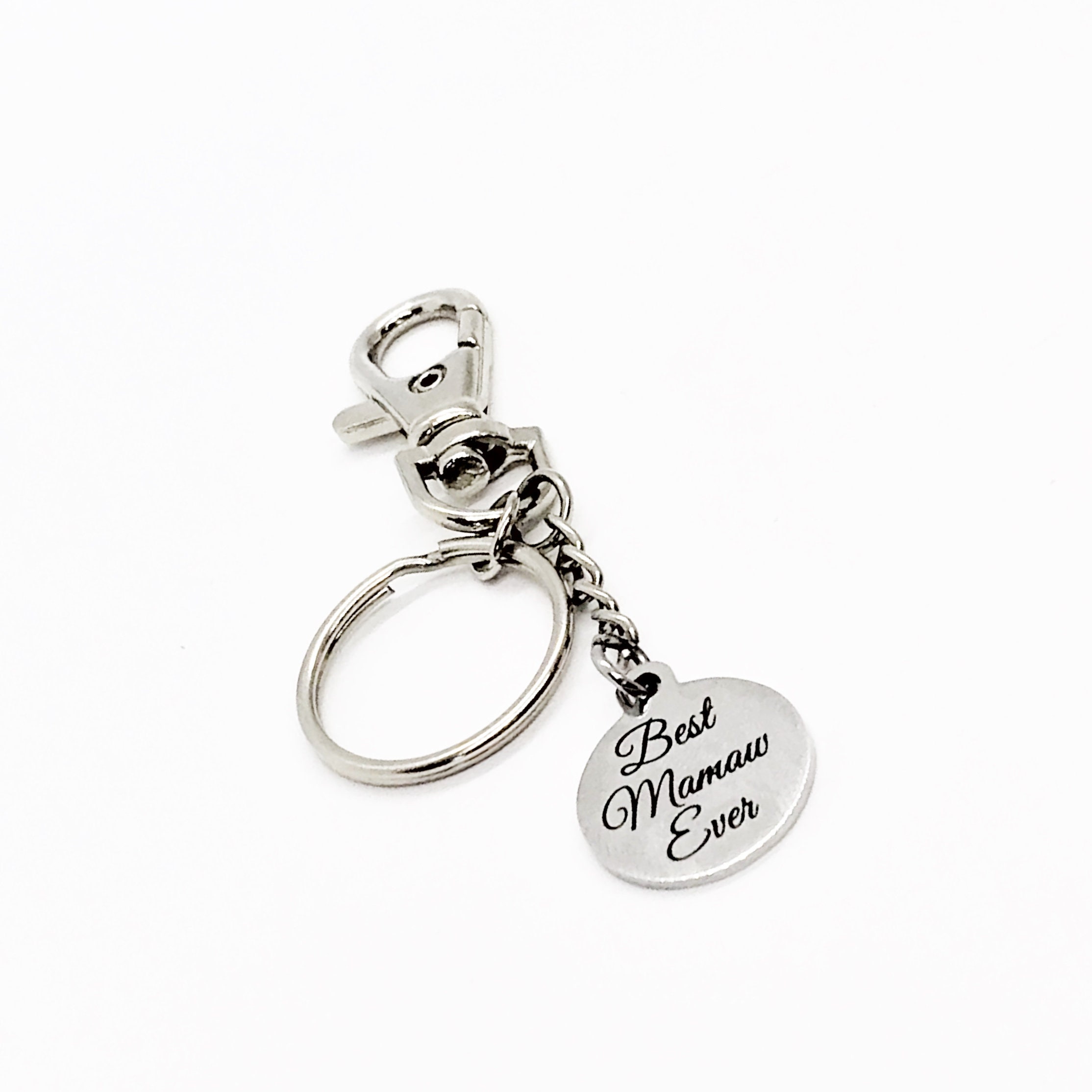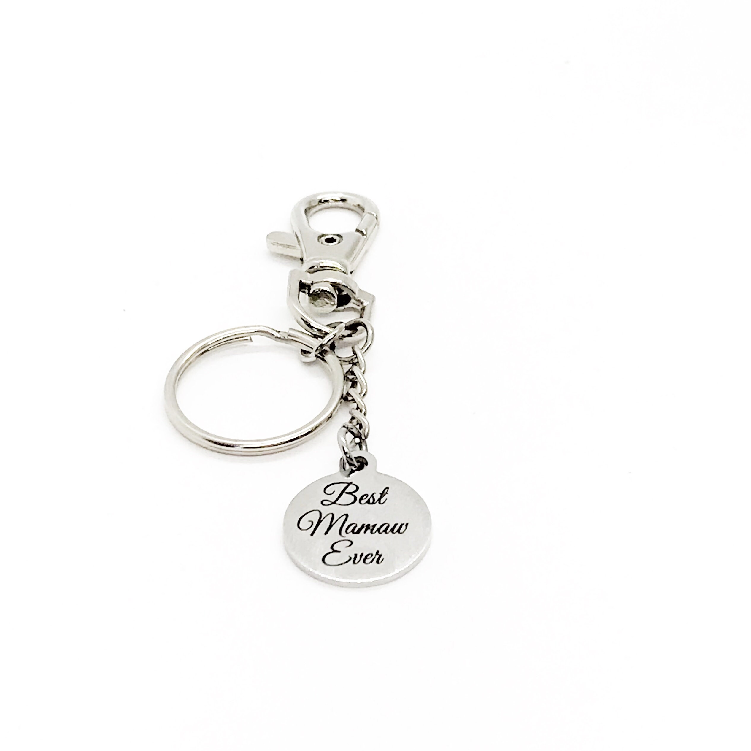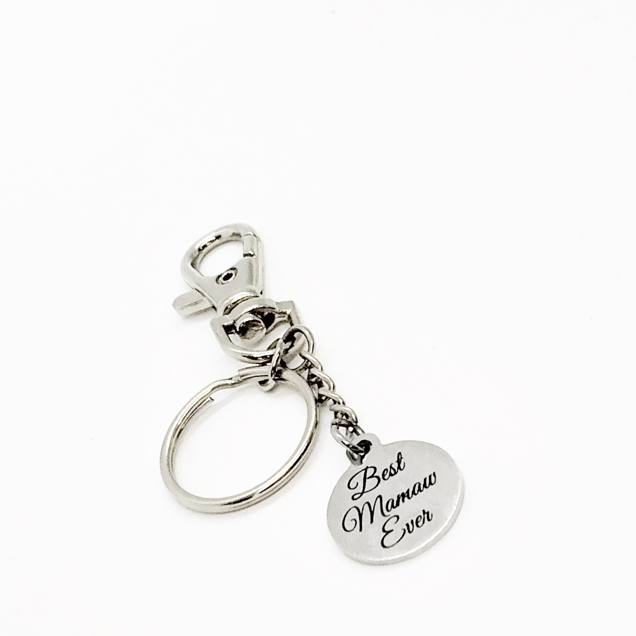 This is a great keychain gift . The keyring can be clipped onto your bag to make it easy to access without digging to the bottom of the bag. It has a stainless steel laser engraved charm with the following on it: