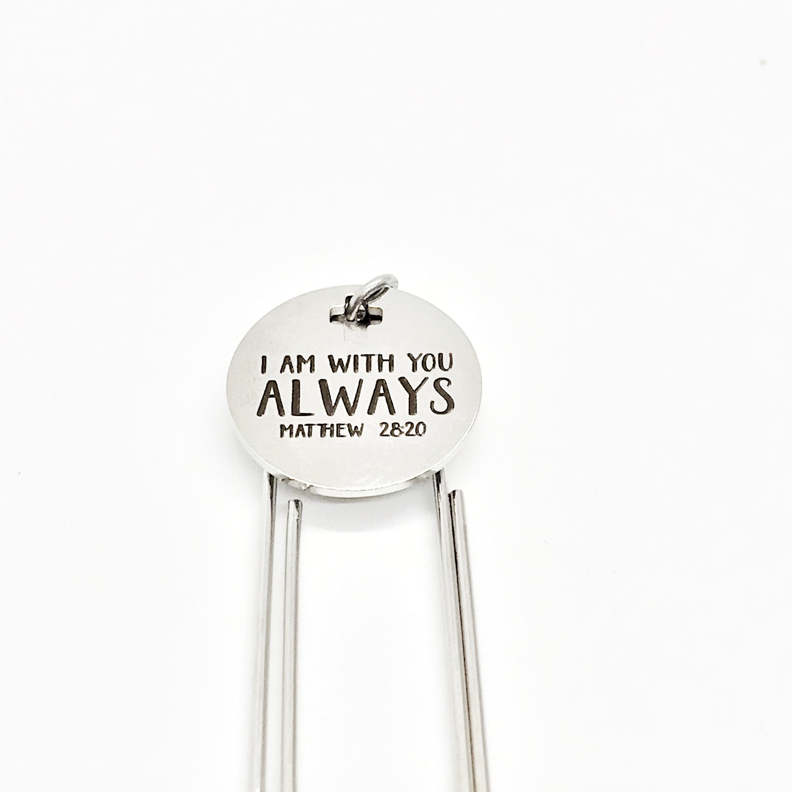 This bookmark has a stainless steel laser engraved charm with “I am with you always” Matthew 28:20 on it. It can be used as a bookmark, page marker, or planner book mark.