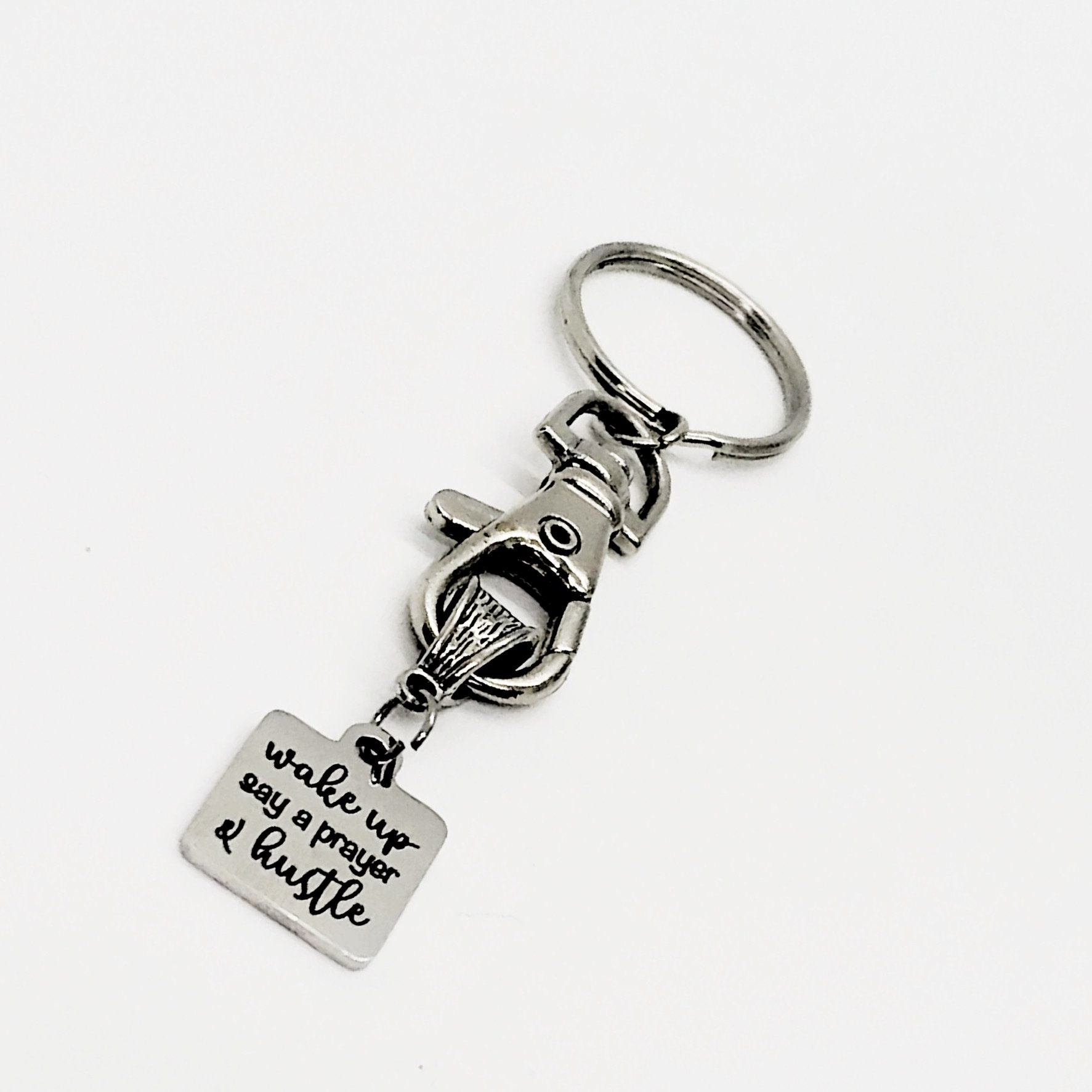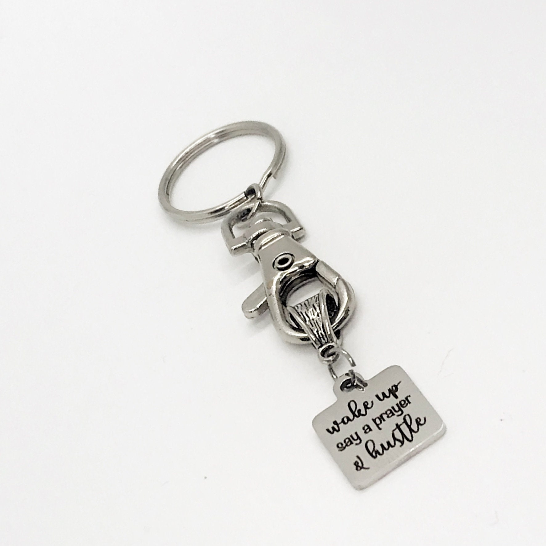 This keychain would make a great gift. It has a stainless steel laser engraved charm with “Wake Up, Say a prayer, and Hustle” on it.