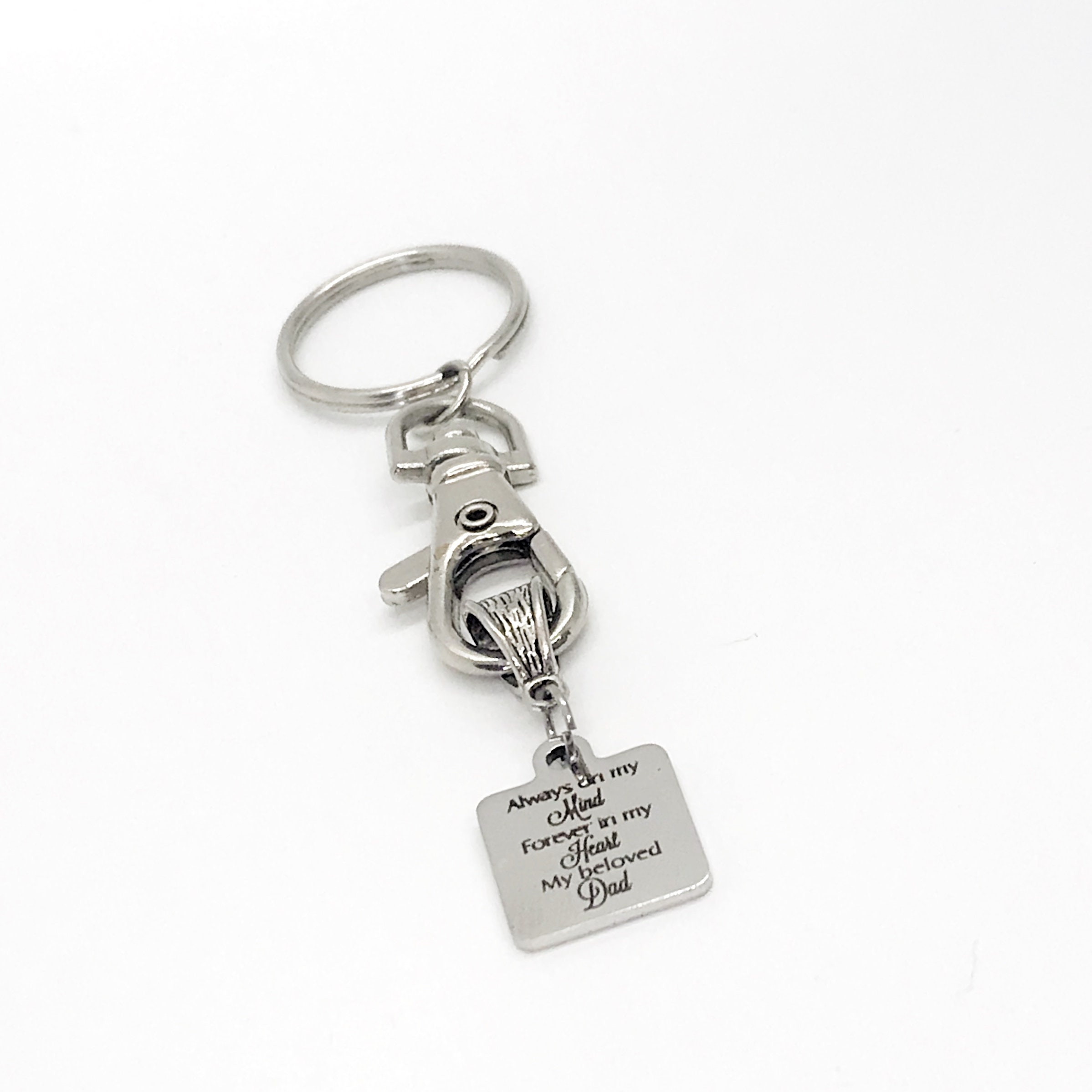 This keychain would make a great gift. It has a stainless steel laser engraved charm with “Always on my mind, Forever in my Heart, My Beloved Dad” on it.