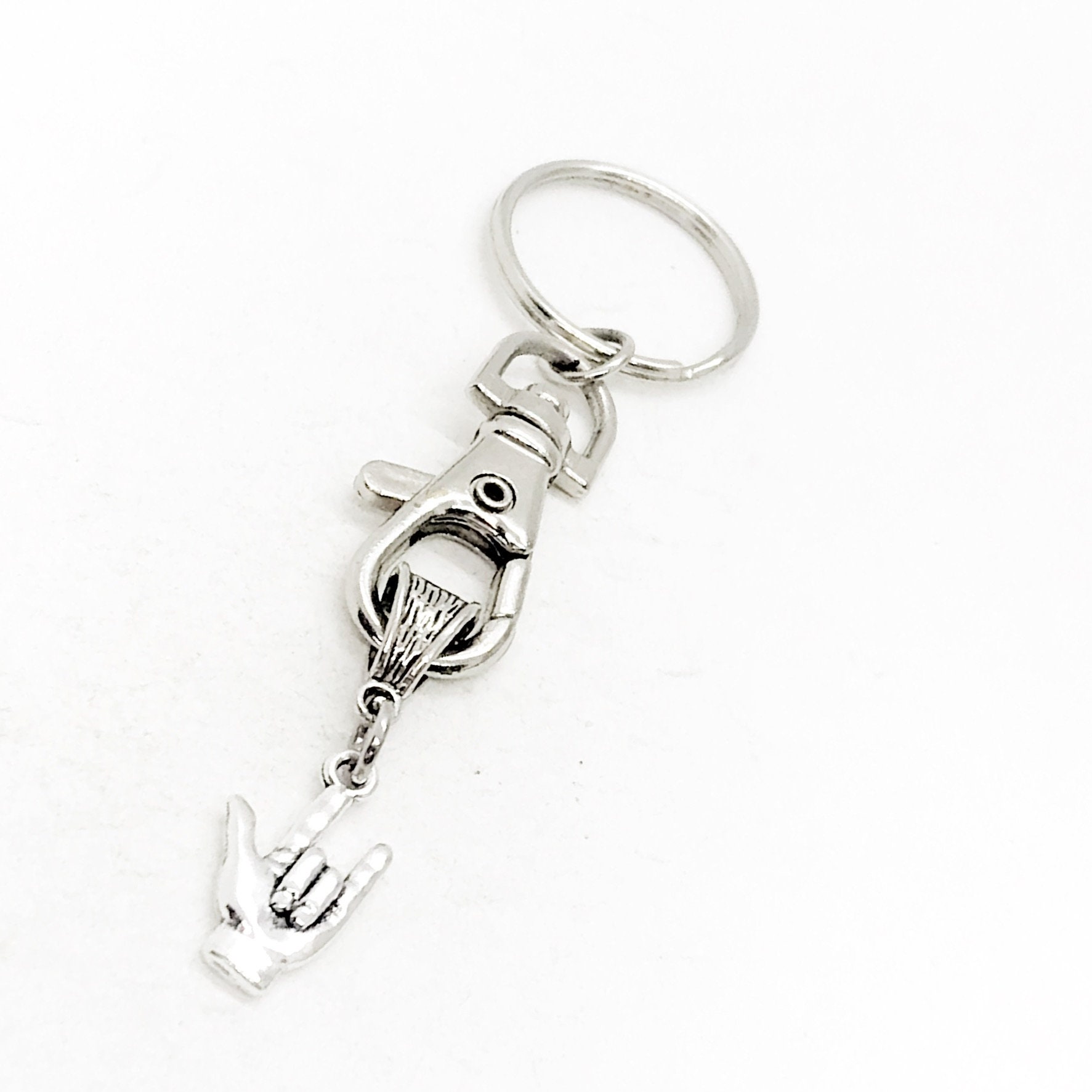 This keychain includes a silver-tone I Love You sign language charm.