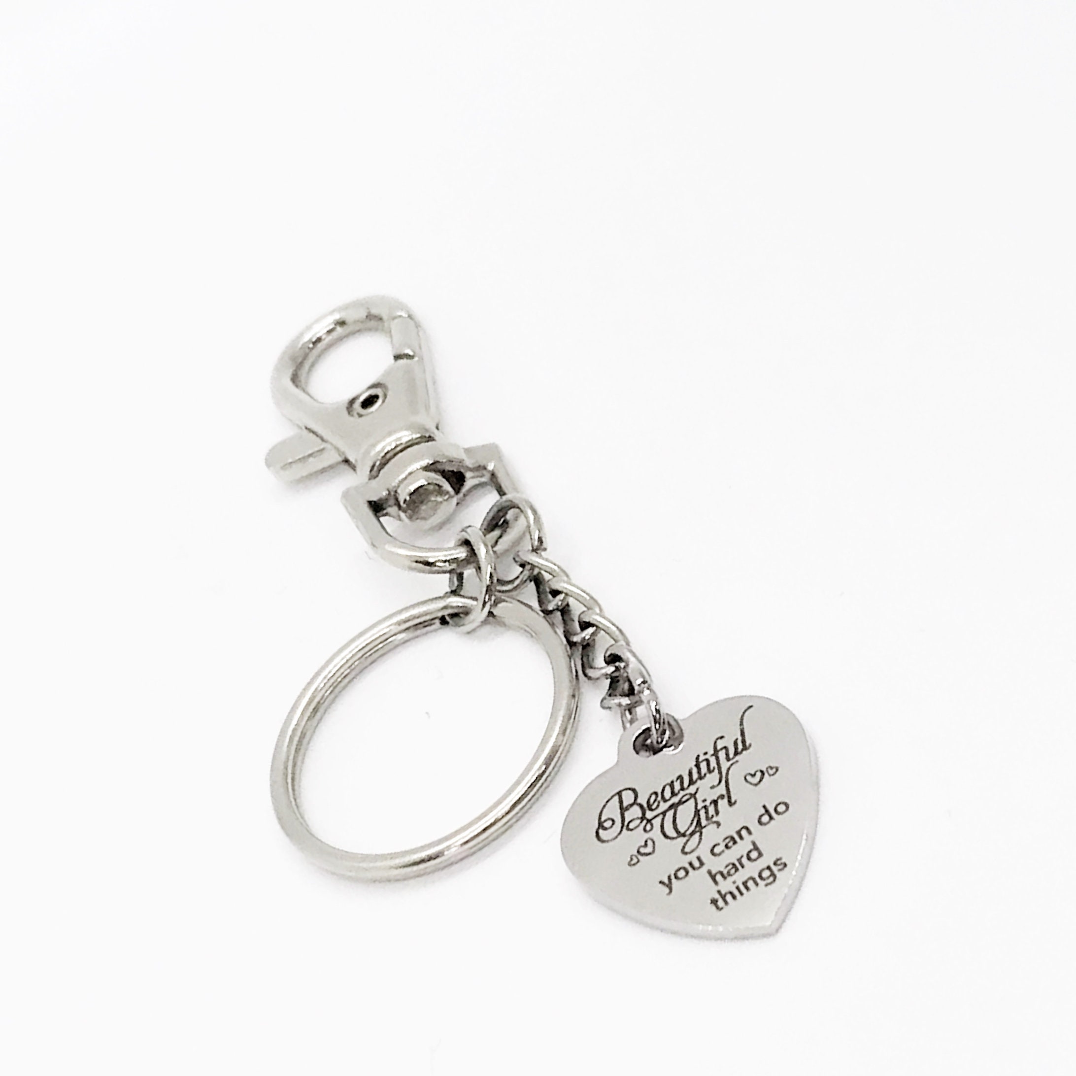 This is a great keychain gift . The keyring can be clipped onto your bag to make it easy to access without digging to the bottom of the bag. It has a stainless steel laser engraved charm with “Beautiful Girl, you can do hard things” on it.