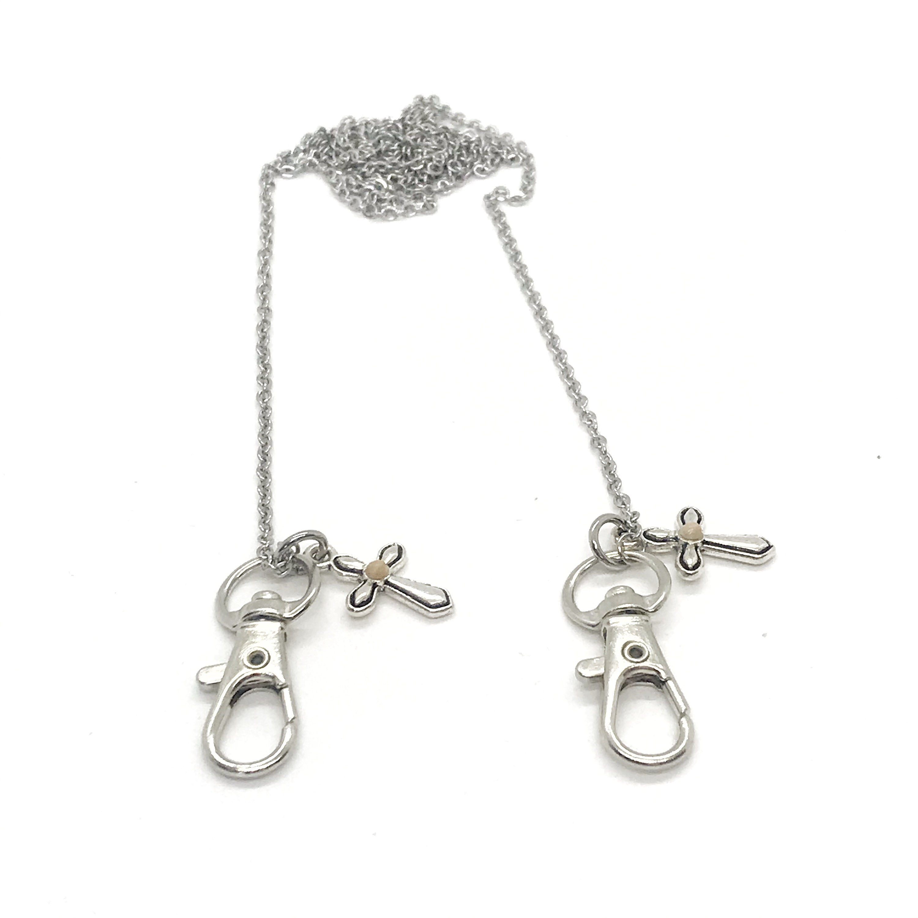 This is a stainless steel chain to connect to your mask so that it can be kept safely around your neck while not being worn. At each connector is a single small cross with a mustard seed at the center that reminds us of the scripture of Matthew 17:20 that tells us that with just a small amount of faith, we can move mountains. The chain is 30 iInches in length.