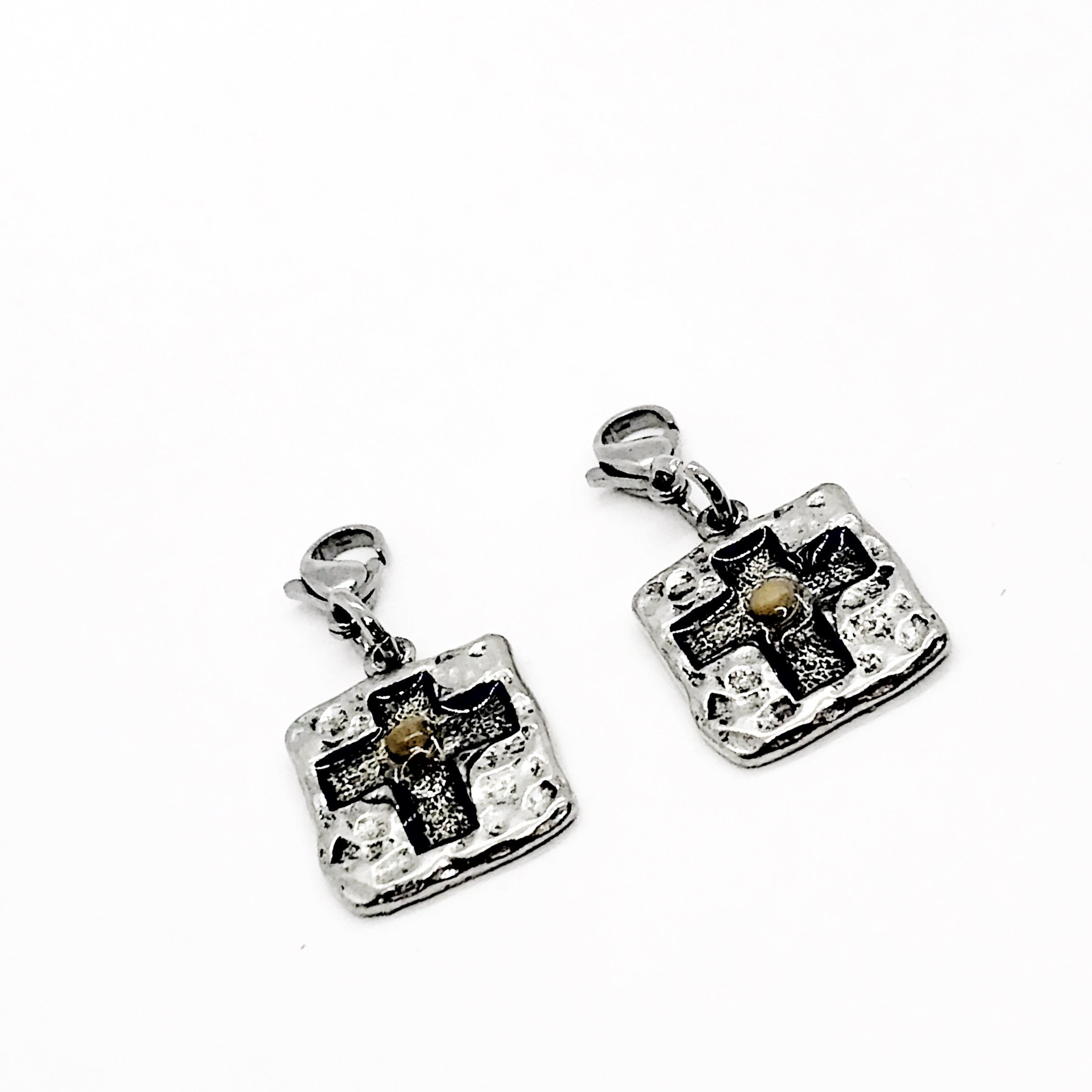 This is s clip on charm that can be purchased as a single charm or set of two charms. This charm is a square silvertone charm with a recessed cross with a single mustard seed at the center to remind the wearer of the scripture of Matthew 17:20 that tells us that with just a small amount of faith, we can move mountains! The charm measures approx. 3/4 inch across.