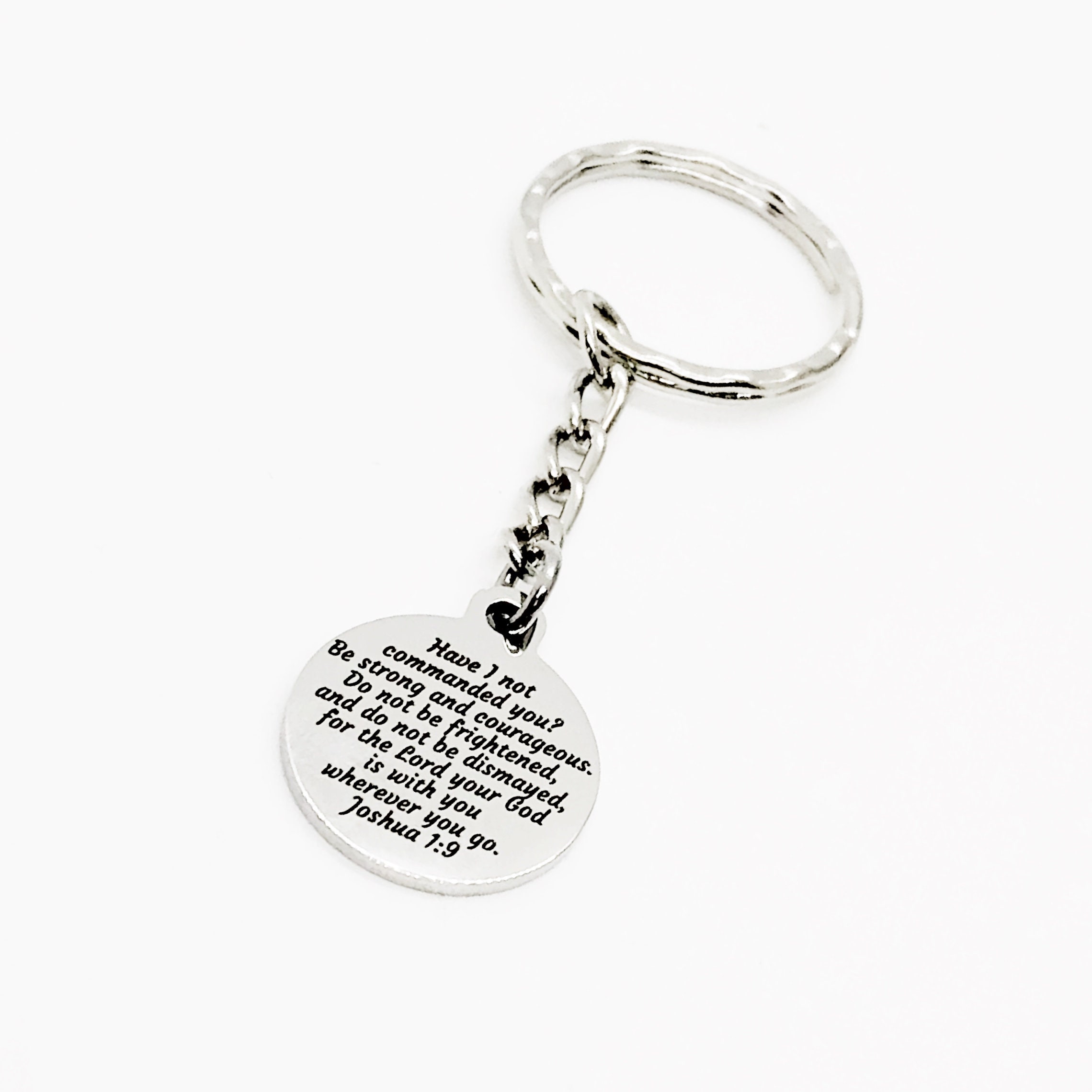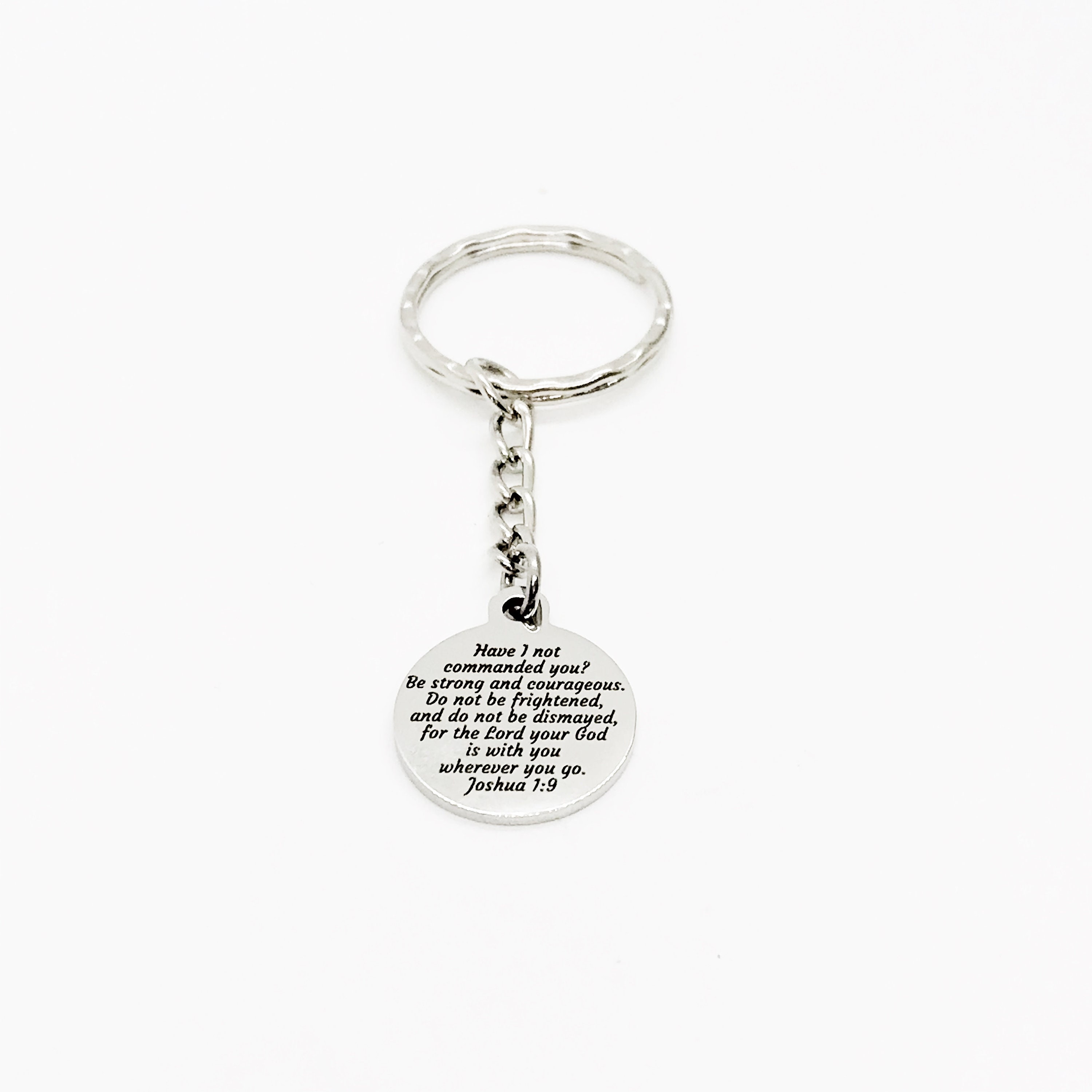 This is a wonderful keychain gift! It has a stainless steel laser engraved charm with “Have I not commanded you? Be strong and courageous. Do not be frightened, and do not be dismayed, for the Lord your God is with you wherever you go” from Joshua 1:9 on it.