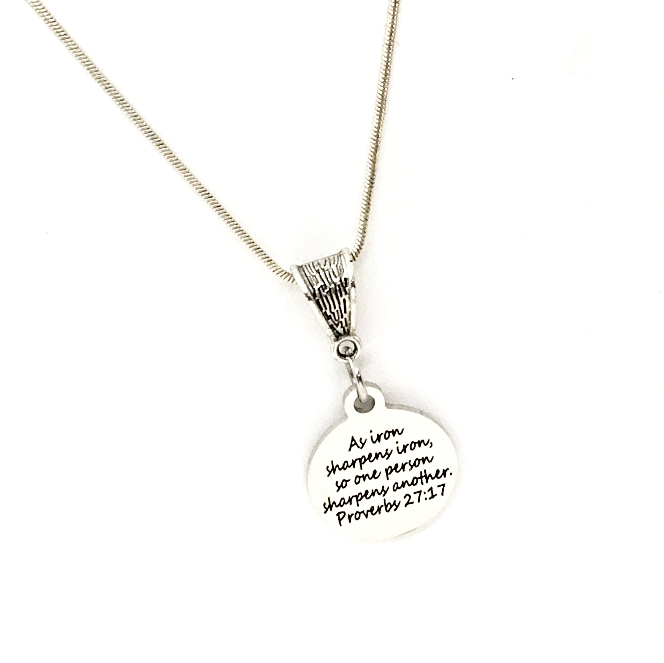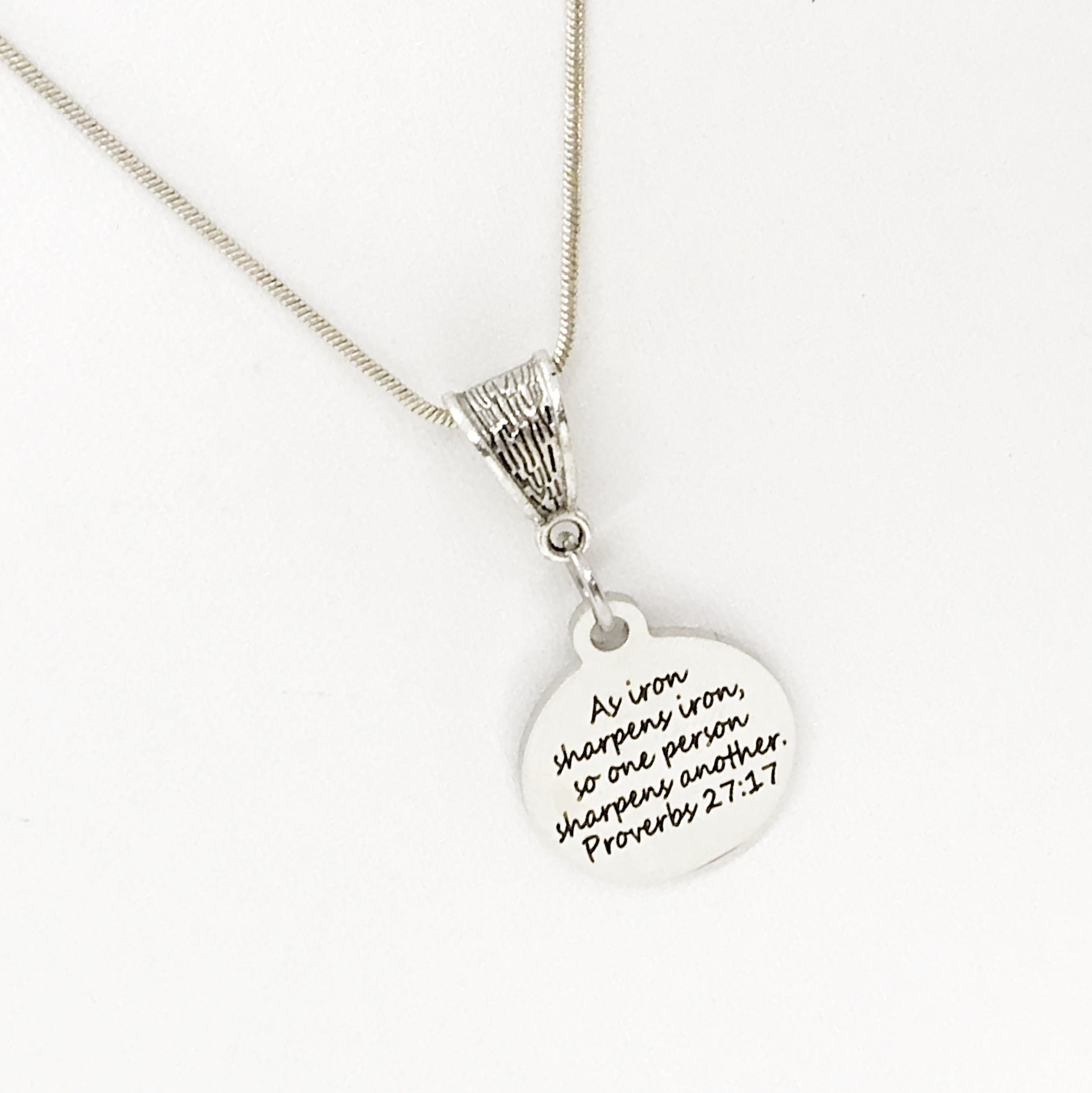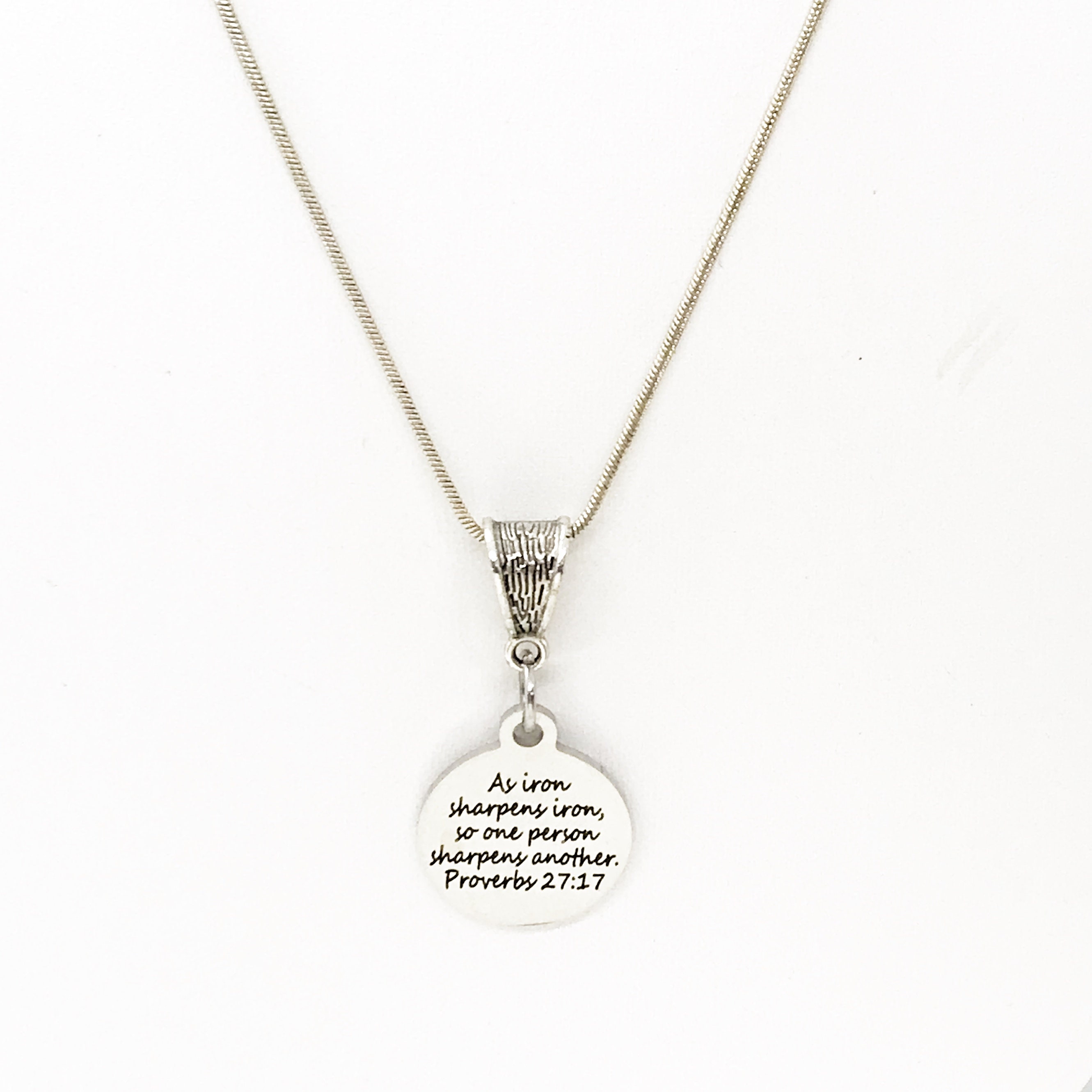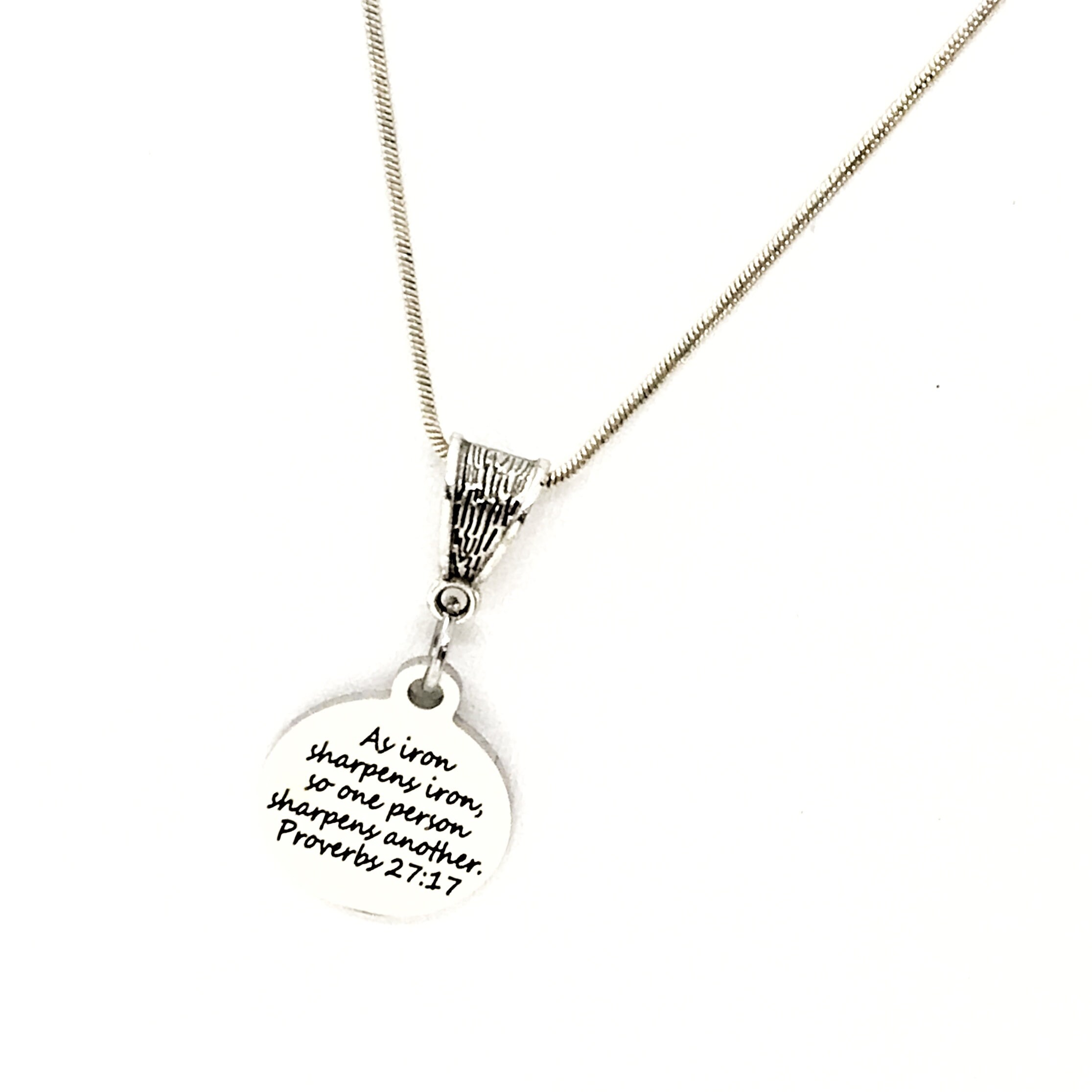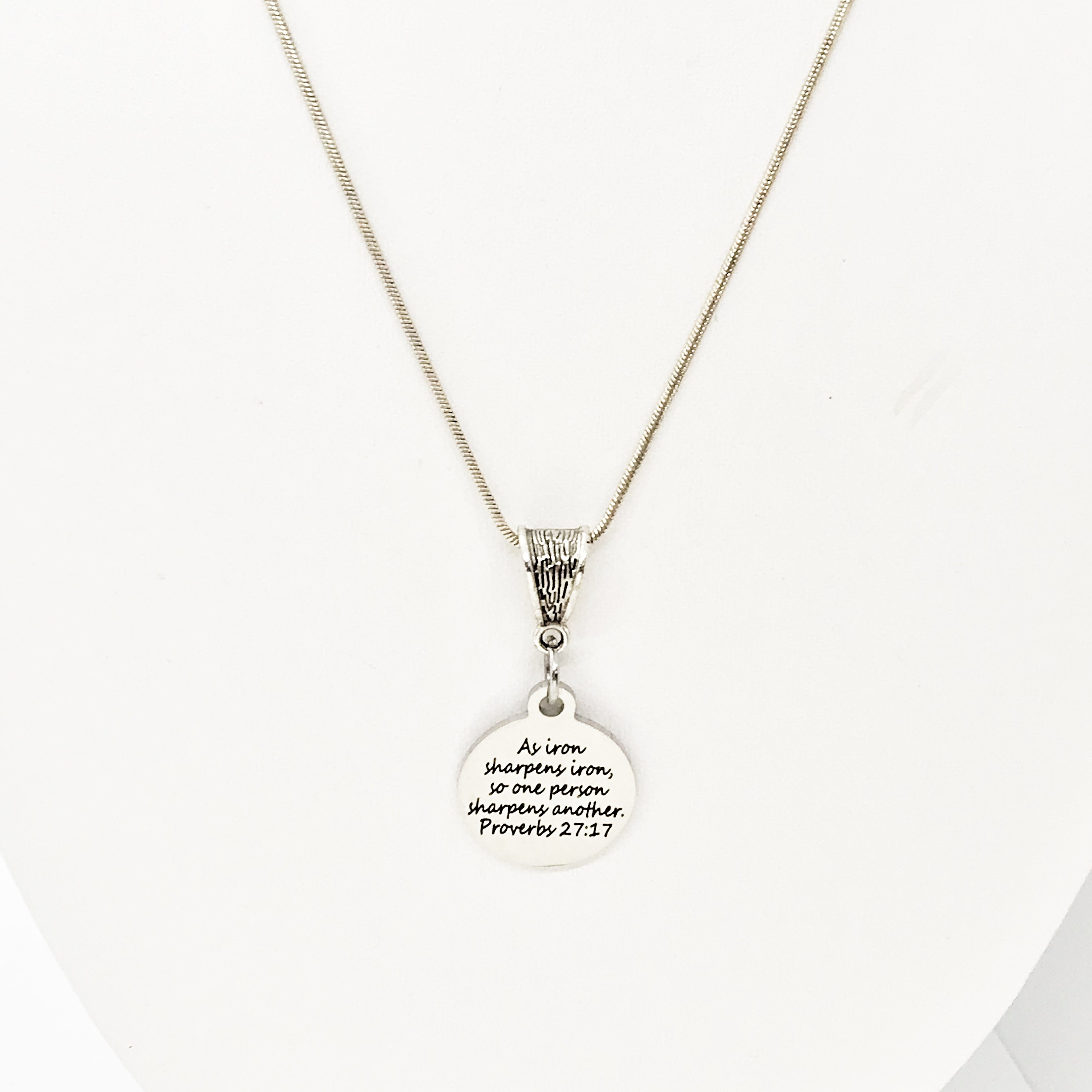 This is a laser engraved stainless steel pendant on a silver-plated snake chain. The pendant has the phrase "As iron sharpens iron so one person sharpens another" from Proverbs 27:17. This pendant is available on your choice of 16, 18, 20, 22, 24, 26, 28 or 30 inch chain. The pendant is also available for individual purchase if you have another chain on which you would like to wear it. The charm measures approx. 3/4 inch across.