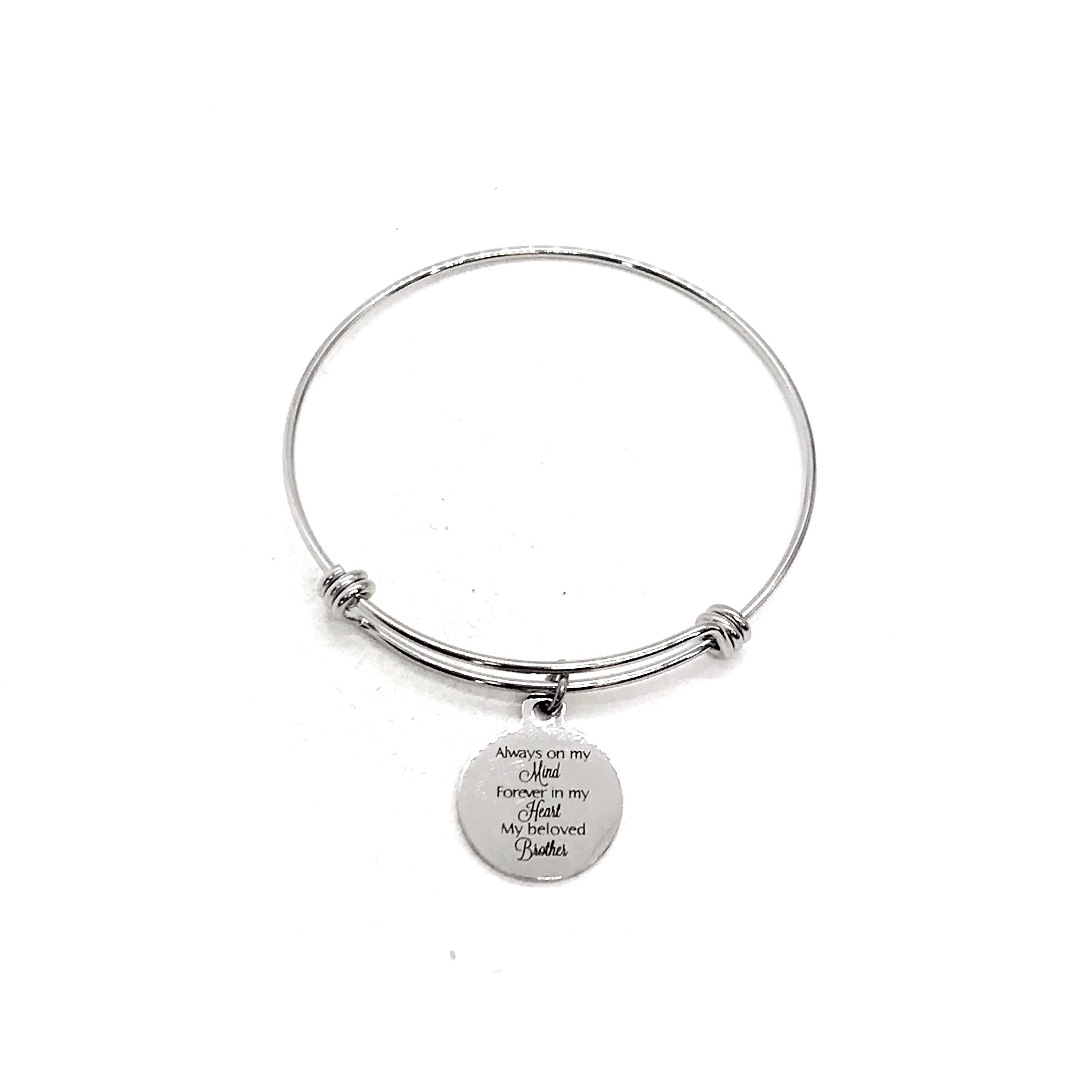 This is a beautiful bangle bracelet with a laser engraved stainless steel charm that has "Always on my mind, forever in my heart, my beloved brother" on it.