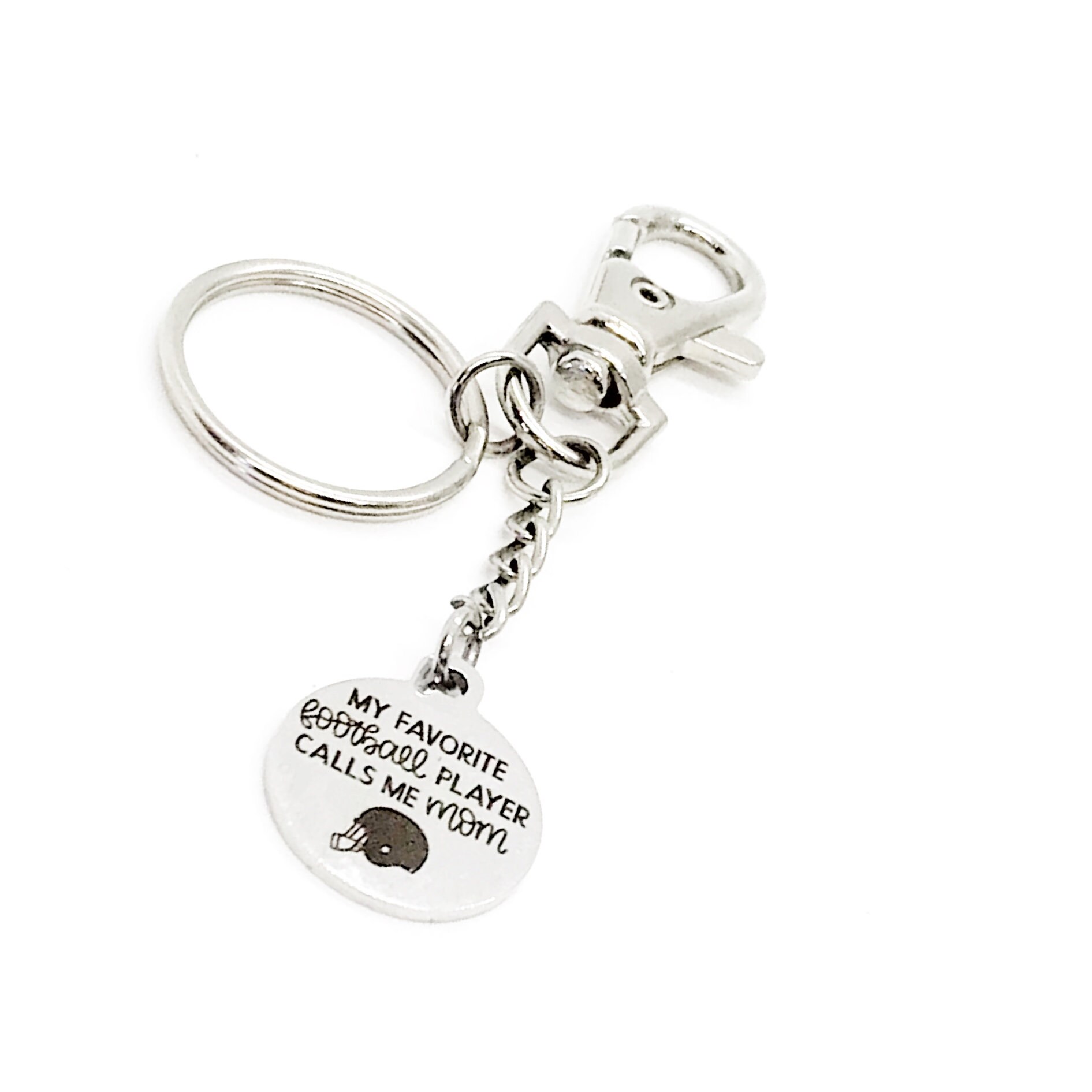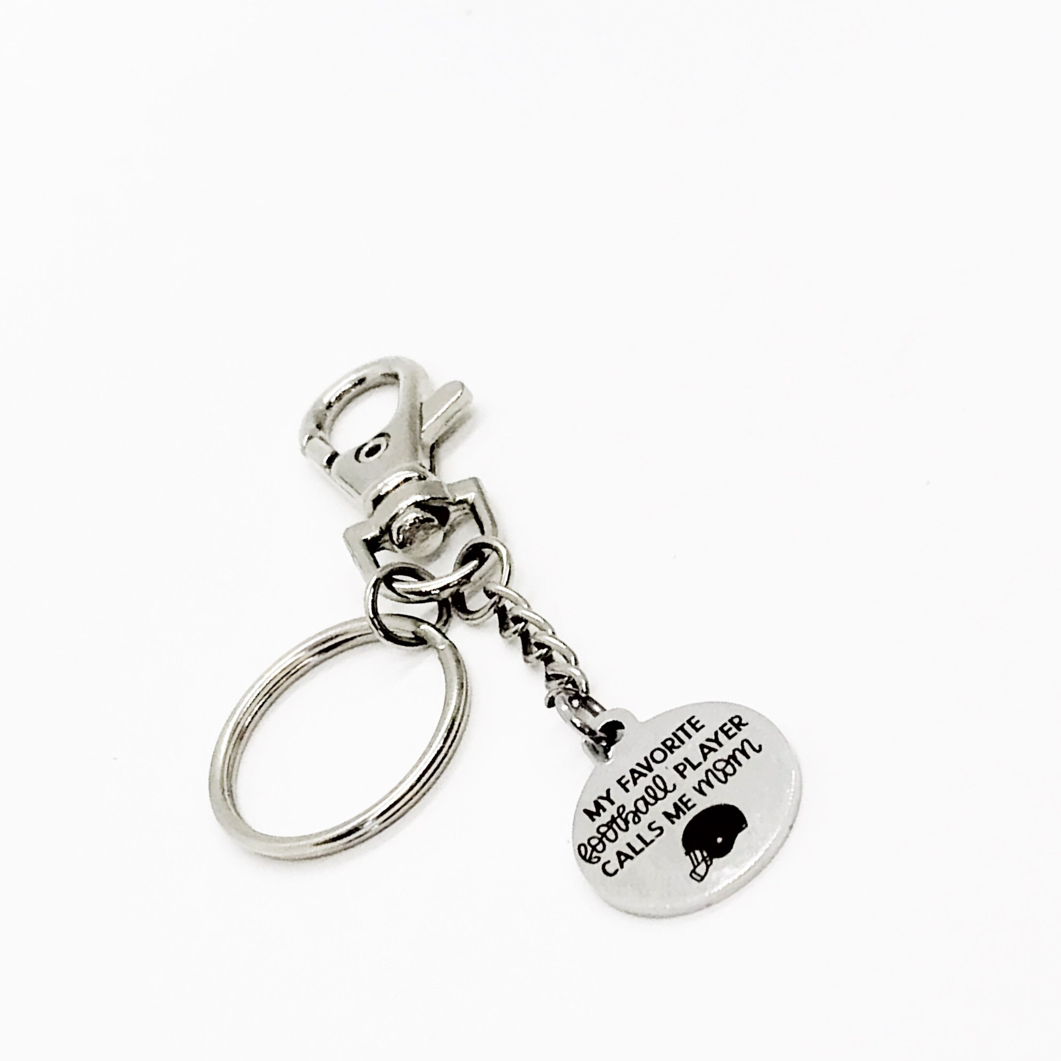 This is a great keychain gift . The keyring can be clipped onto your bag to make it easy to access without digging to the bottom of the bag. It has a stainless steel laser engraved charm with “My favorite football player calls me Mom” on it.