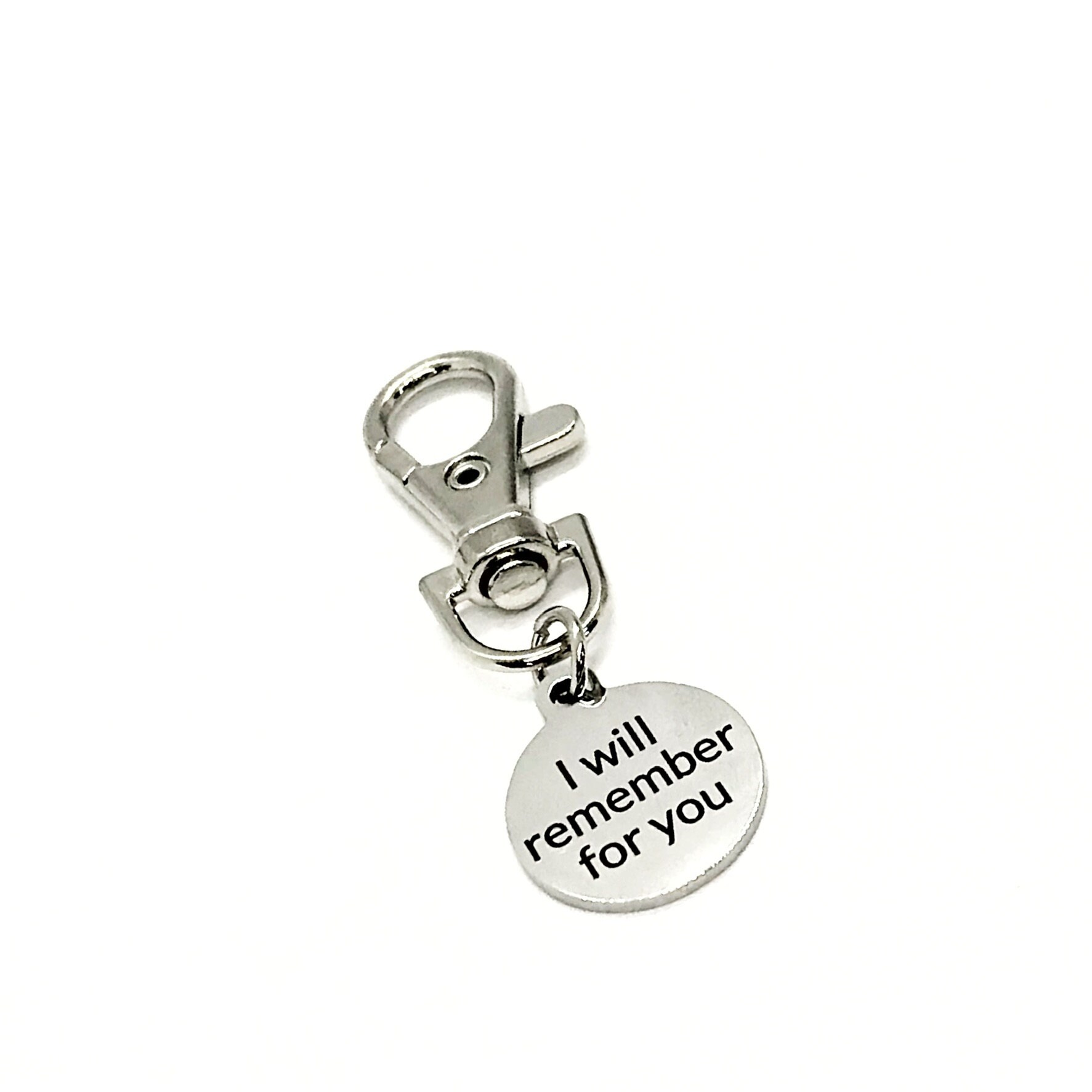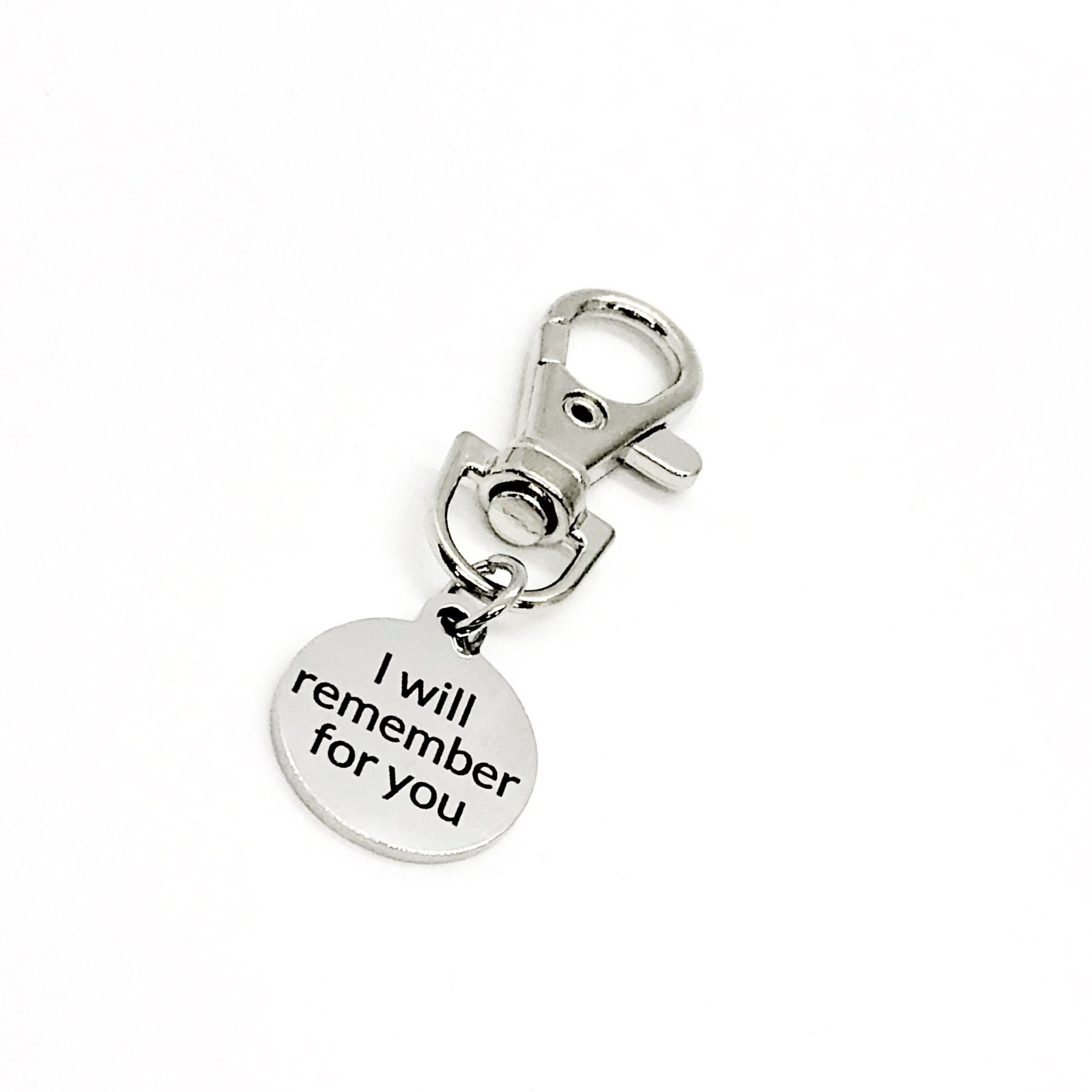 This is a great zipper pull or bag charm or keychain clip-on charm with “I will remember for you” on it.