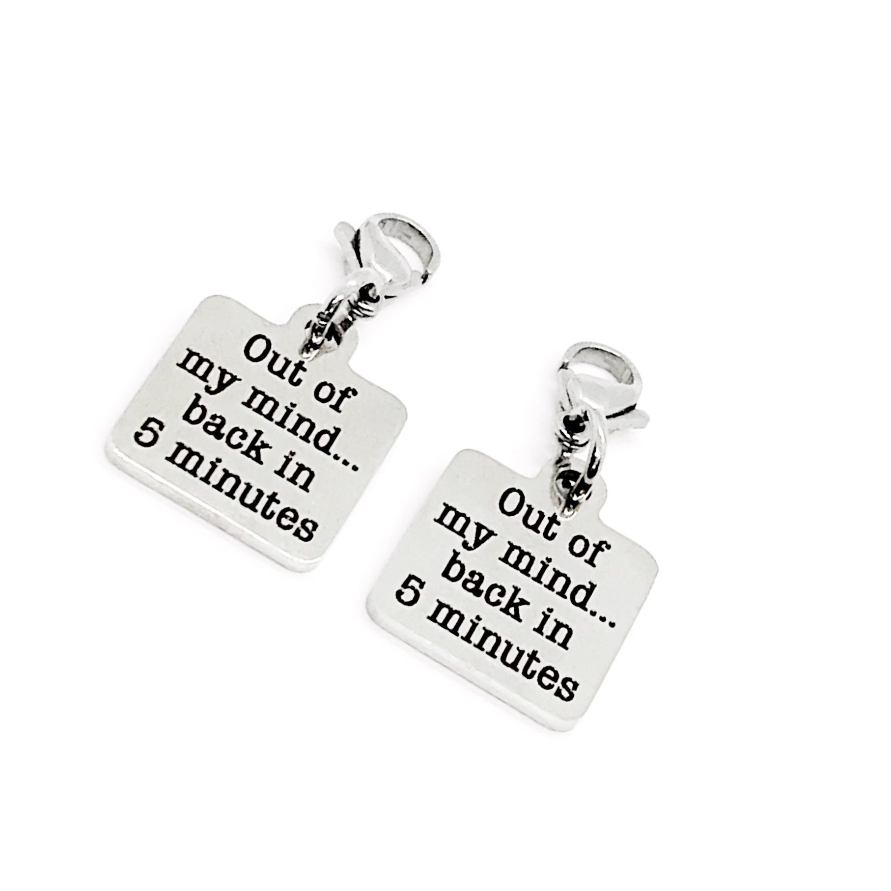 This is a clip on charm that can be purchased as a single charm or set of two charms to be used on our mask chains. This charm is a stainless steel laser engraved charm that says “Out of my mind, back in 5 minutes”.