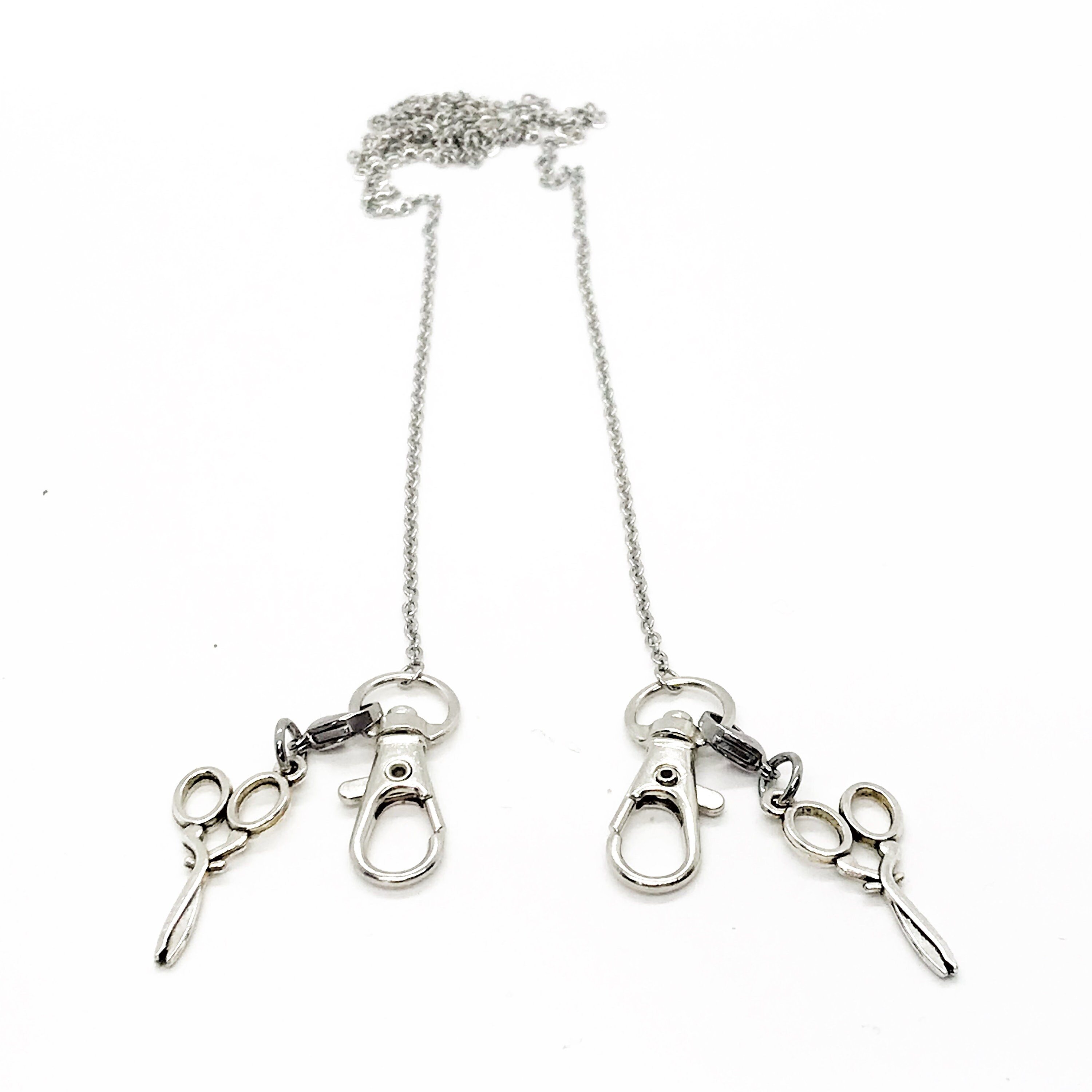 This is a stainless steel chain to connect to your mask so that it can be kept safely around your neck while not being worn. At each connector is set of scissors charm. The charm is clipped on with a small lobster claw clasp so that it can be removed or exchanged for one of our other sets of charms. The chain is 30 iInches in length.