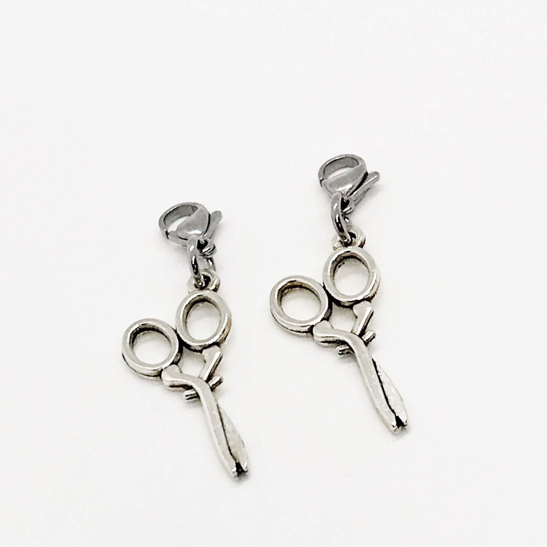 This is s clip on charm that can be purchased as a single charm or set of two charms to be used on our mask chains. This charm is a silvertone set of scissors. It would be a perfect addition for a hair stylist or seamstress!