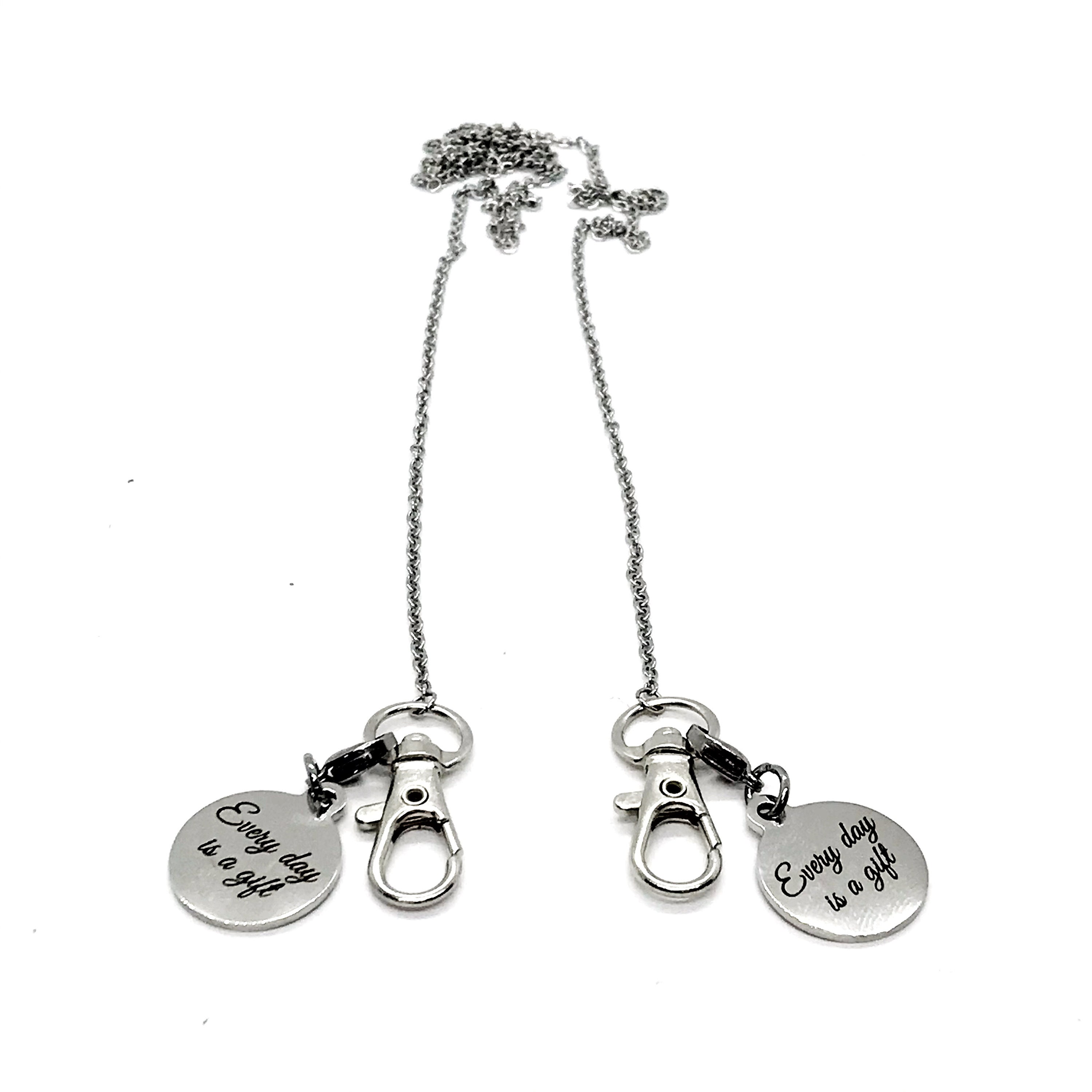 This is a stainless steel chain to connect to your mask so that it can be kept safely around your neck while not being worn. At each connector is a stainless charm that says “Every Day is a Gift”. The charm is clipped on with a small lobster claw clasp so that it can be removed or exchanged for one of our other sets of charms. The chain is 30 iInches in length and the charm is approx. 3/4 inch across.