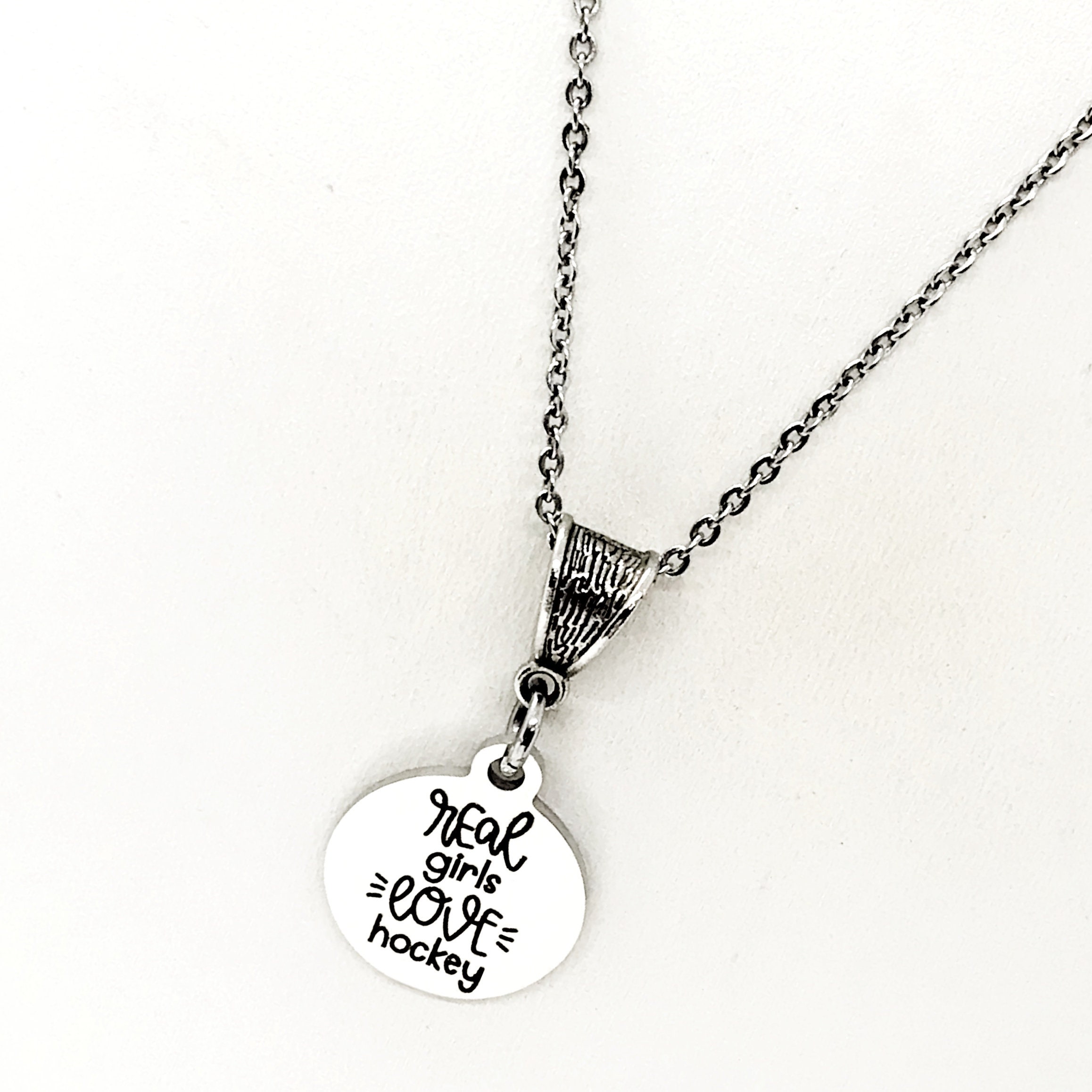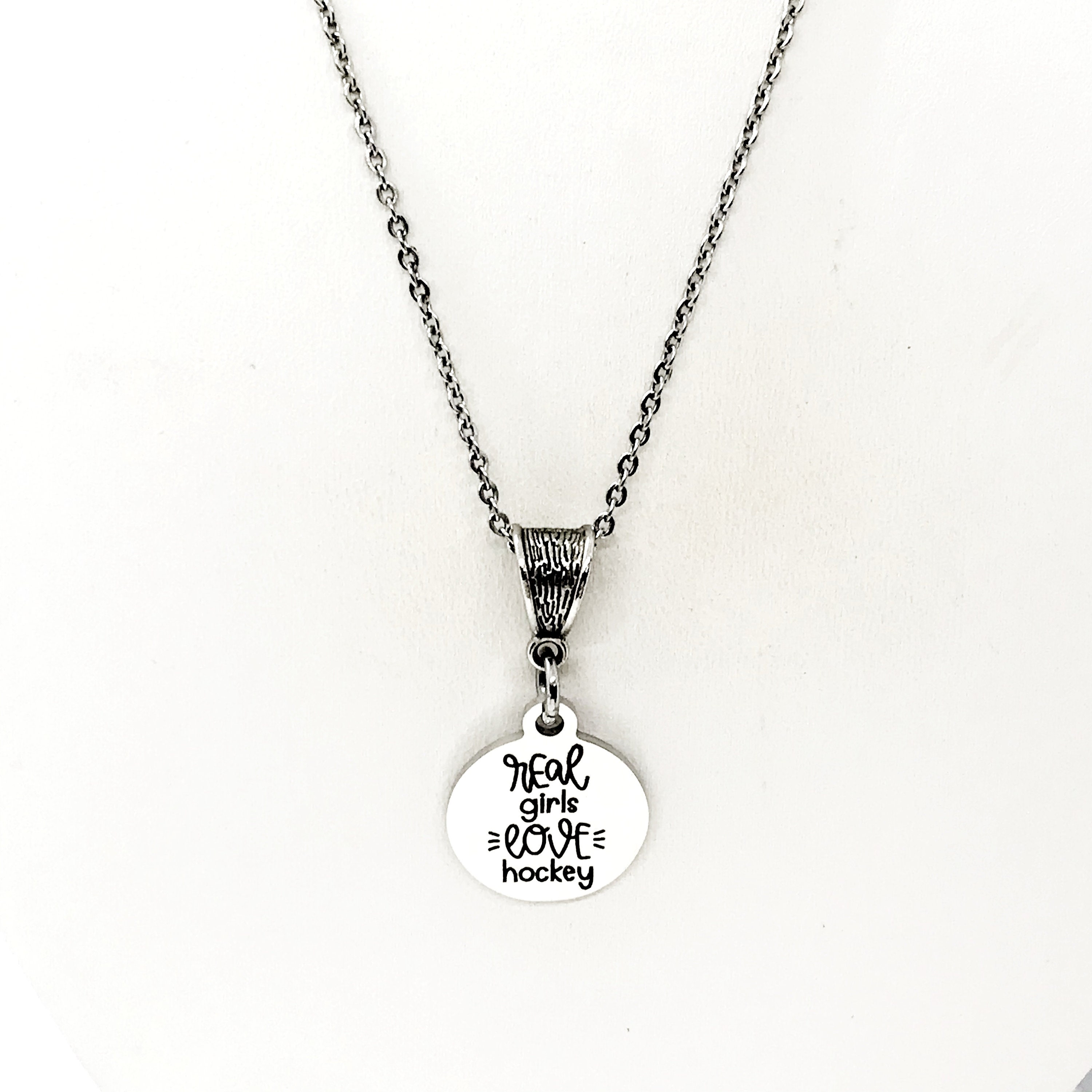 The is a beautiful jewelry piece that has a stainless steel laser engraved charm with “Real girls love hockey” on it. The charm measures approx. 3/4 inch across.