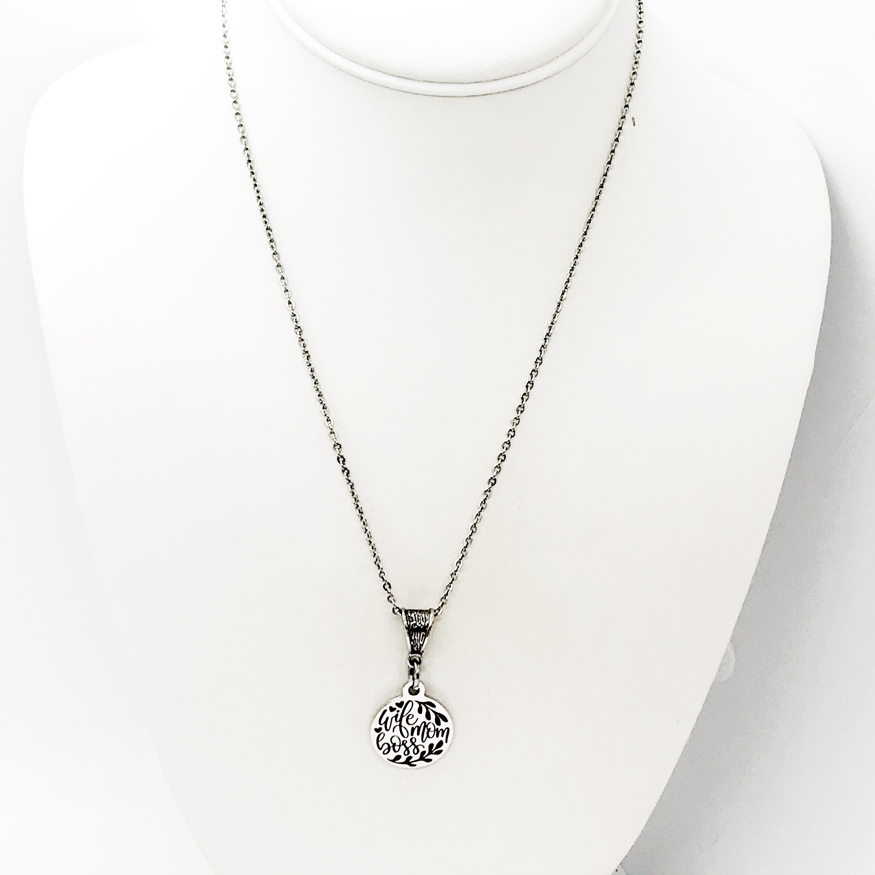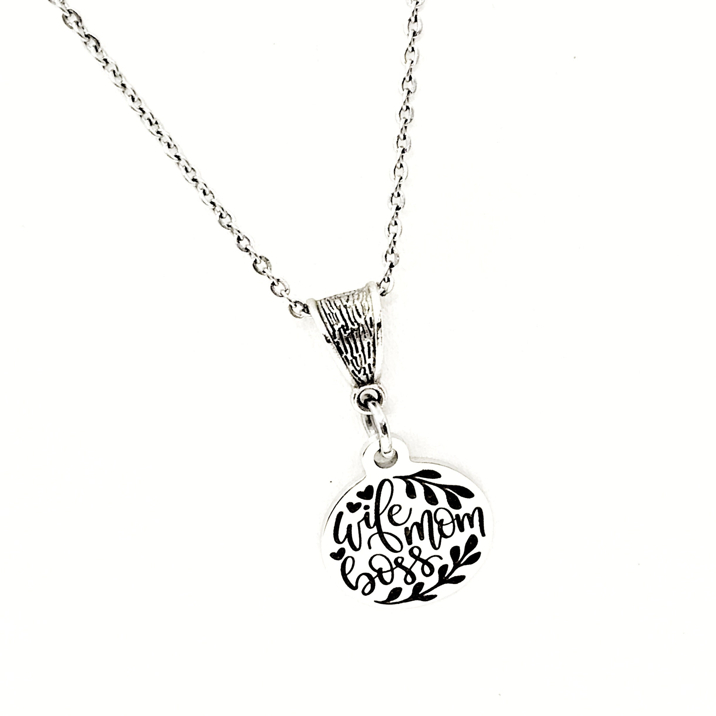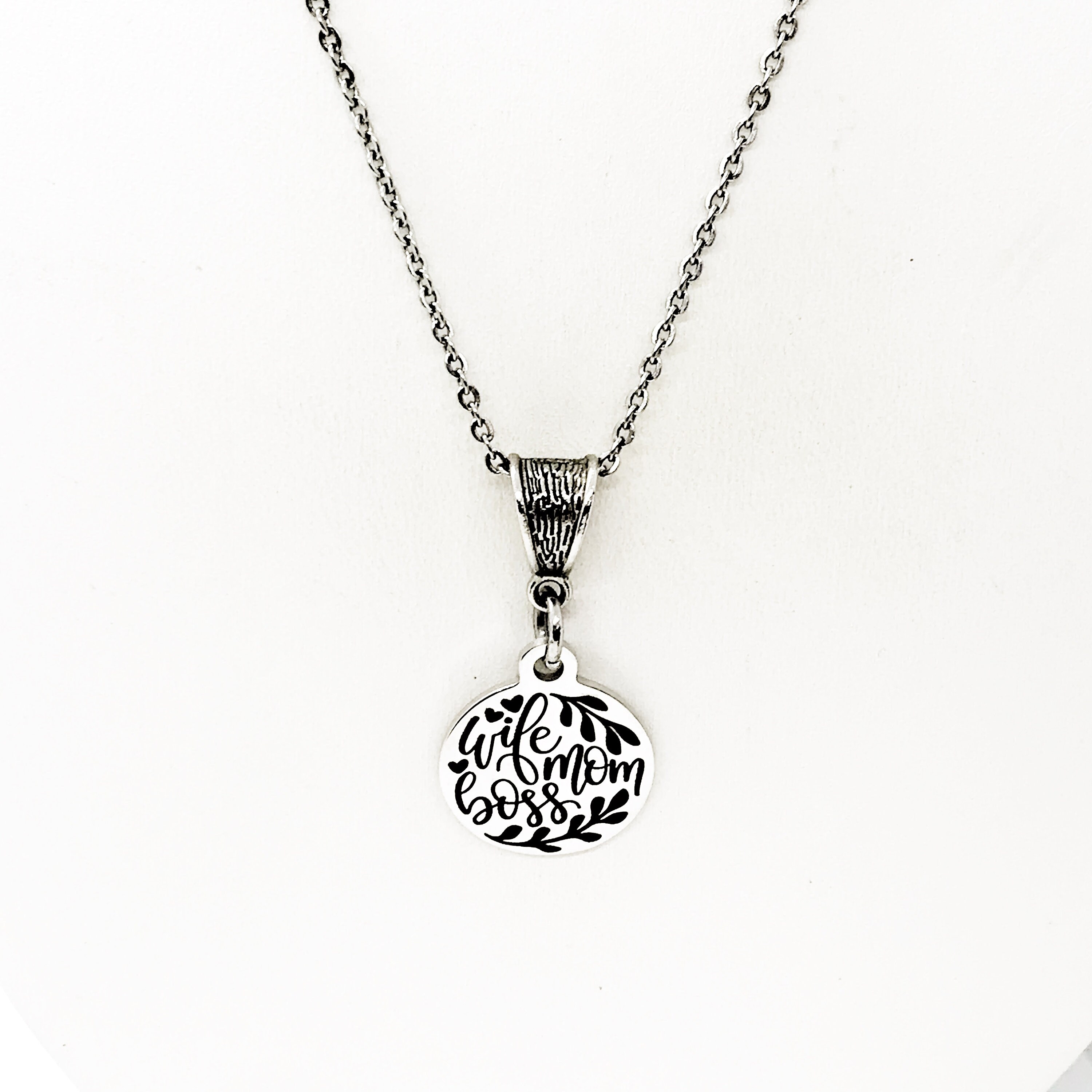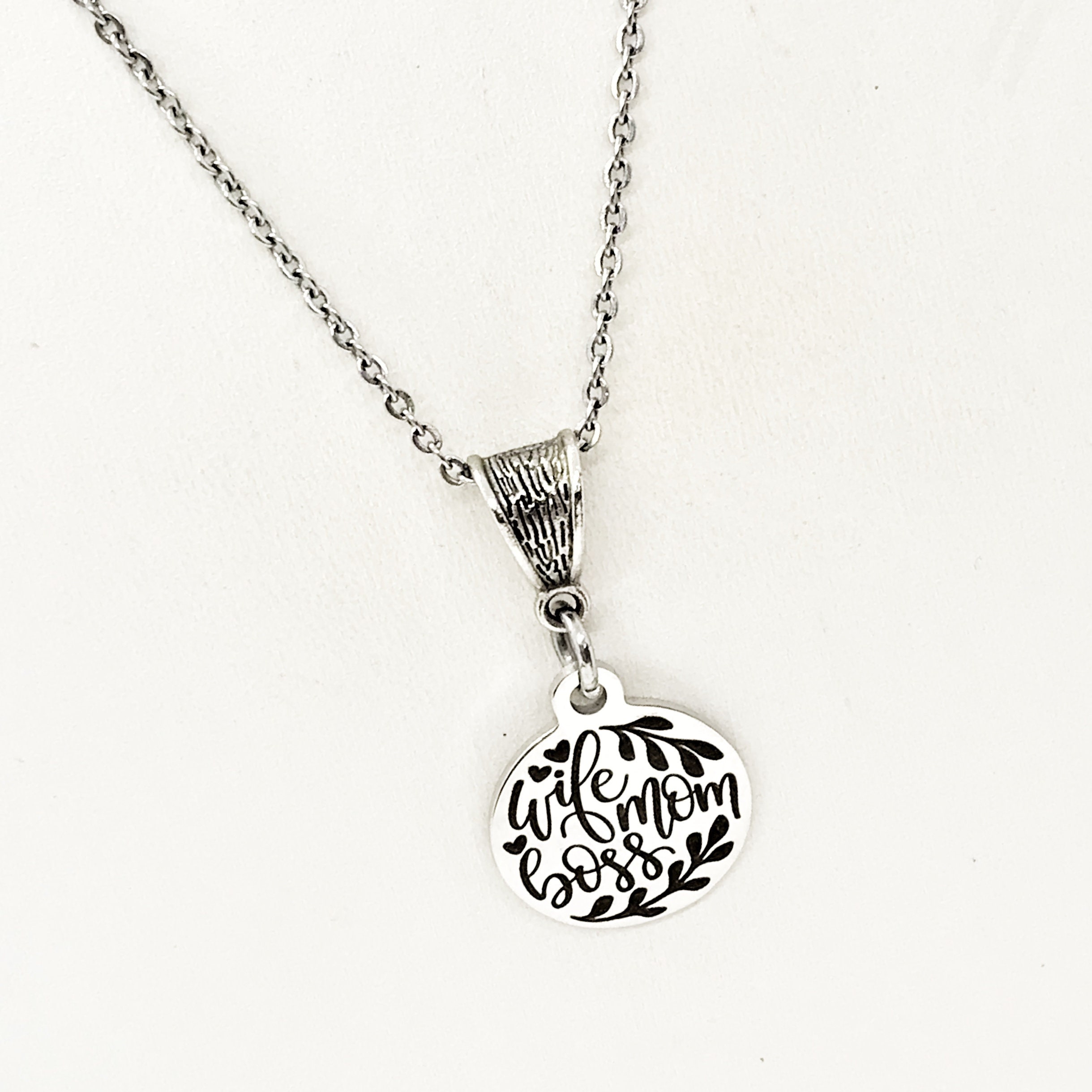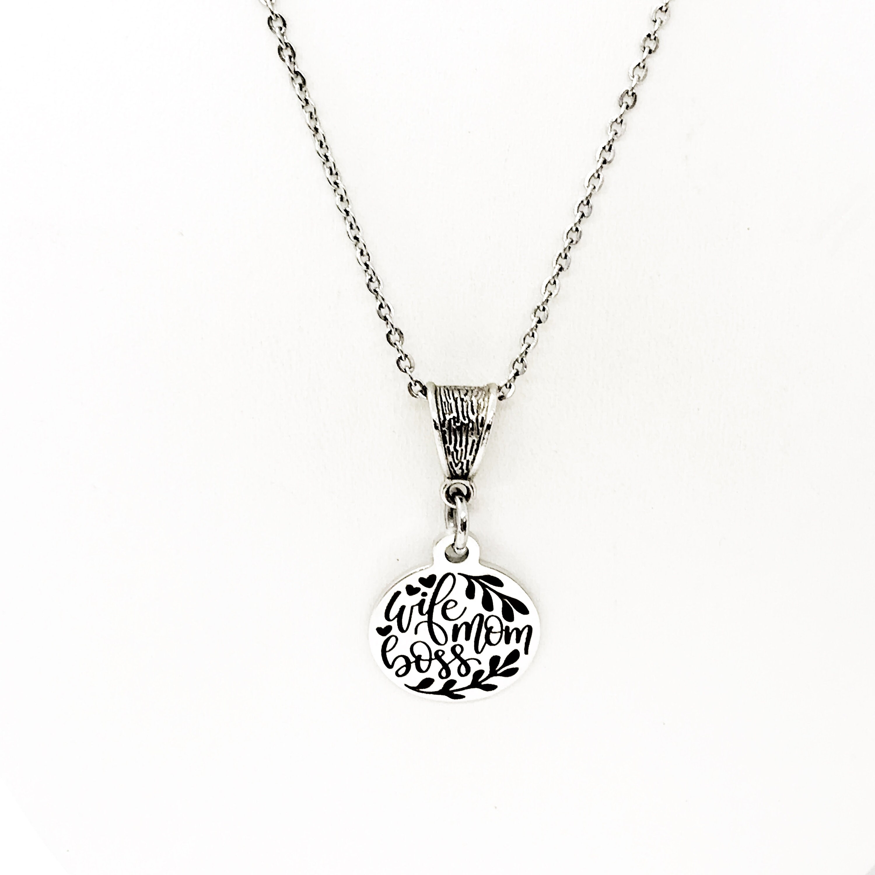 The is a beautiful jewelry piece that has a stainless steel laser engraved charm with “Wife Mom Boss” on it. The charm measures approx. 3/4 inch across.