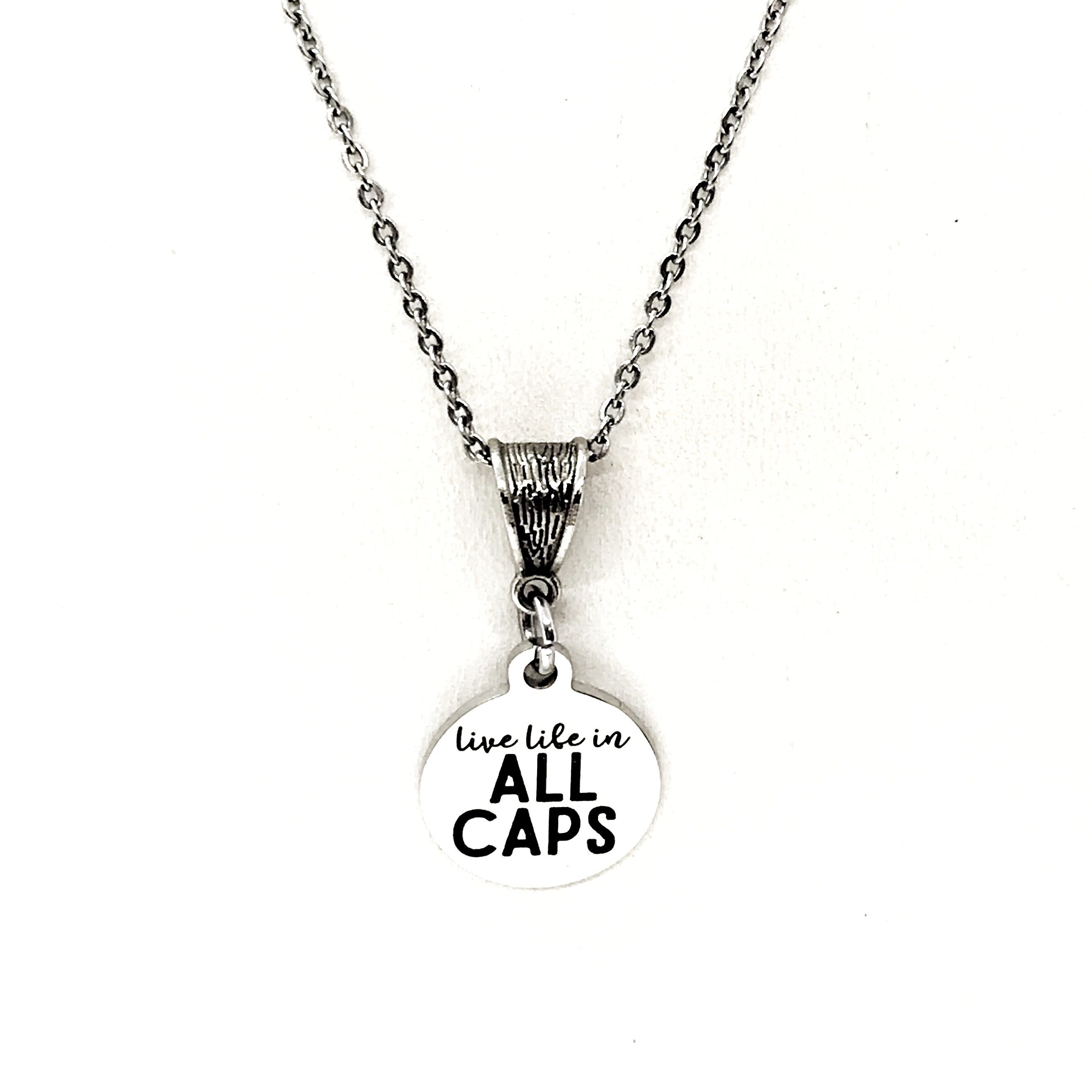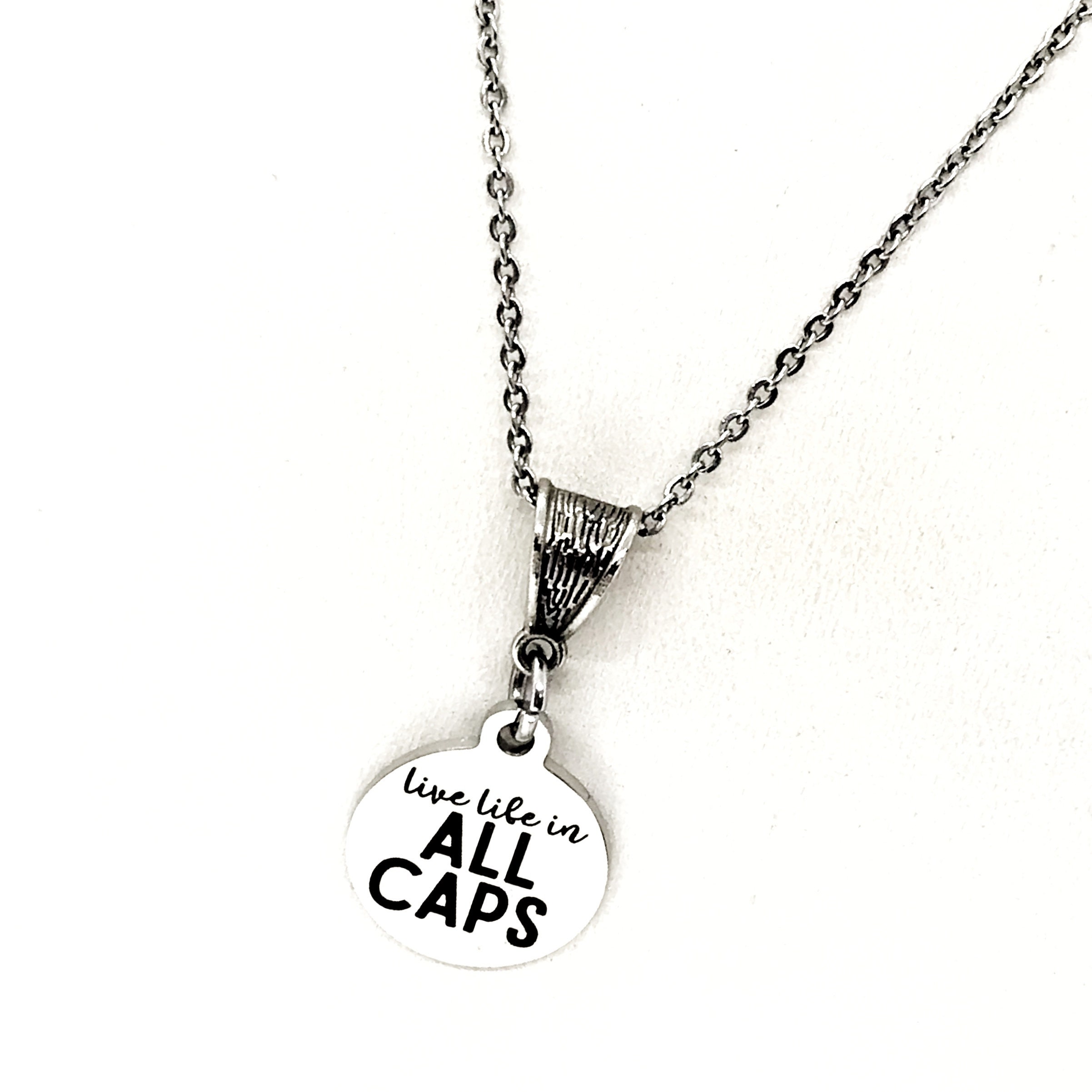The is a beautiful jewelry piece that has a stainless steel laser engraved charm with “Life life in ALL CAPS” on it. The charm measures approx. 3/4 inch across.