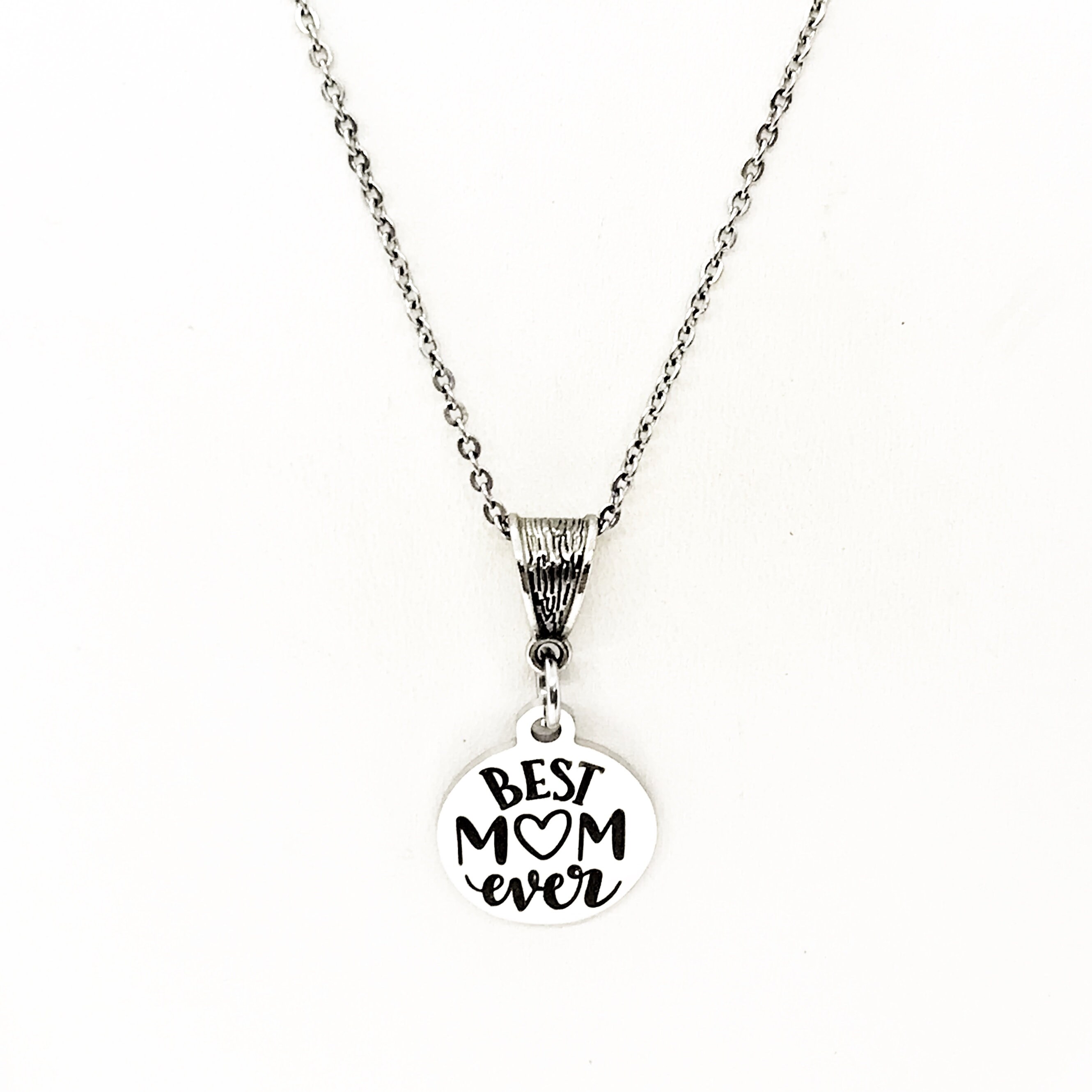 The is a beautiful jewelry piece that has a stainless steel laser engraved charm with “Best Mom Ever” on it. The charm measures approx. 3/4 inch across.