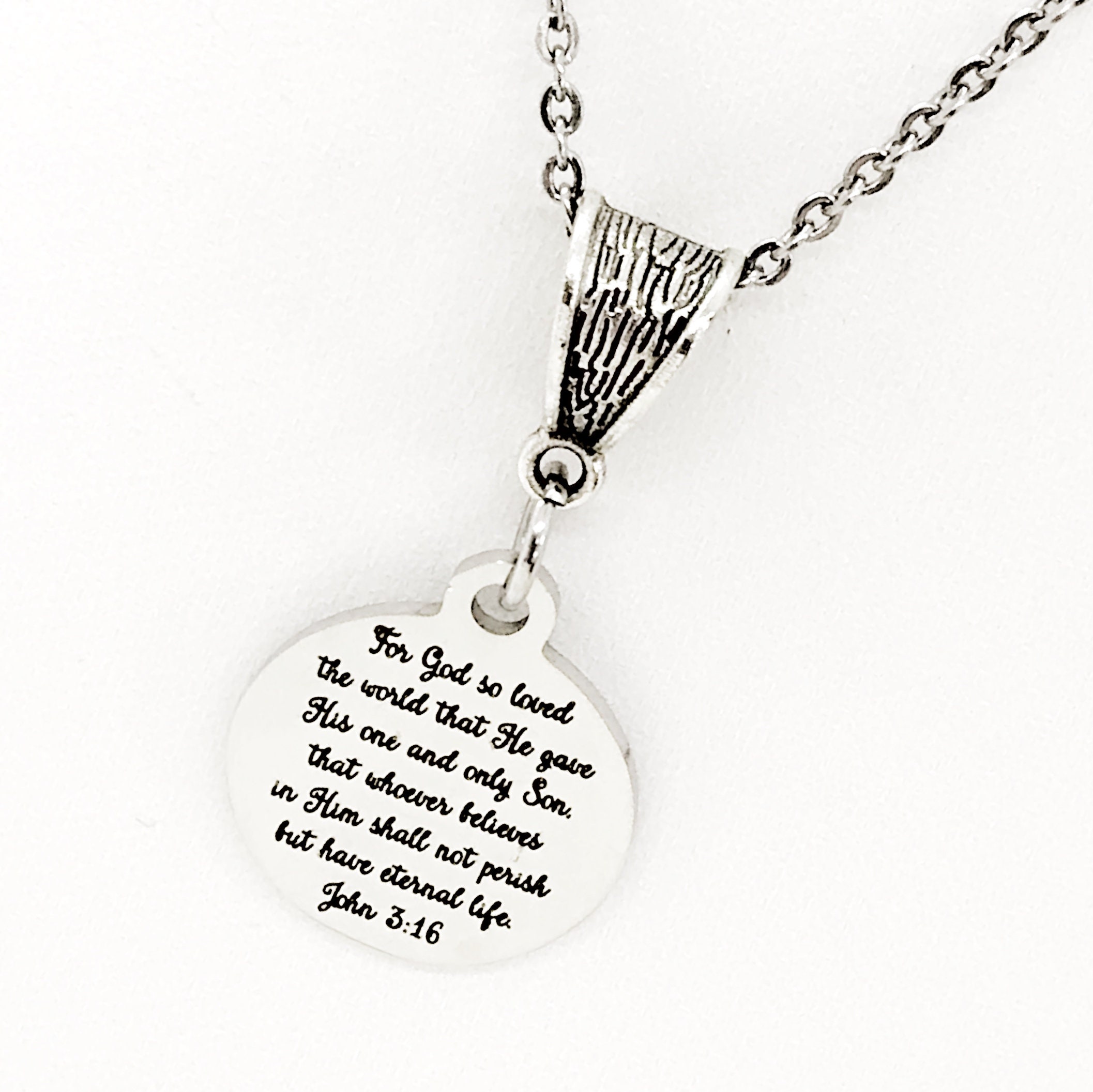 The is a beautiful jewelry piece that has a stainless steel laser engraved charm with “For God so loved the world that he gave his one and only son that whoever believes in him shall not perish but have eternal life.” from John 3:16 on it. The charm measures approx. 3/4 inch across.