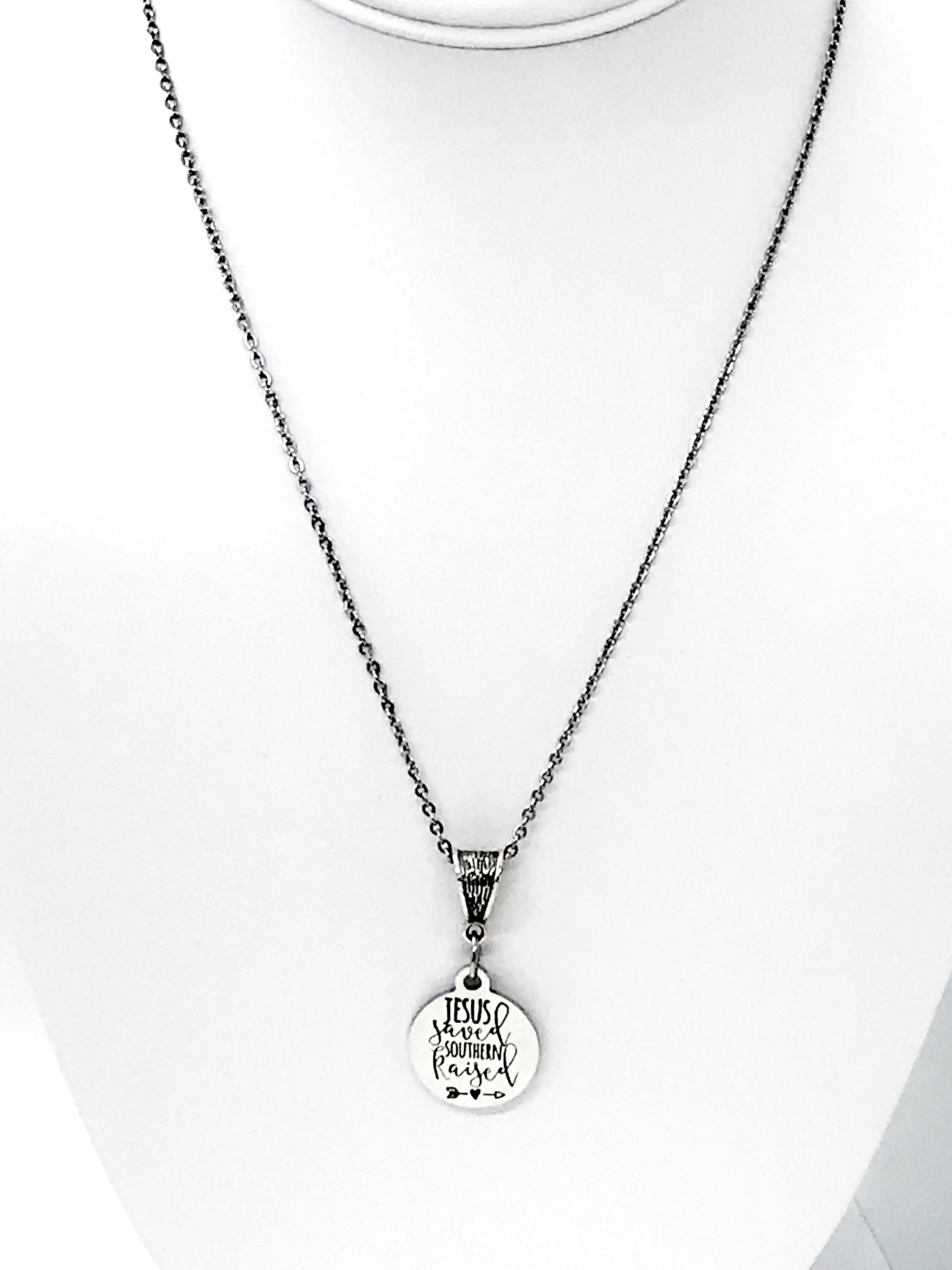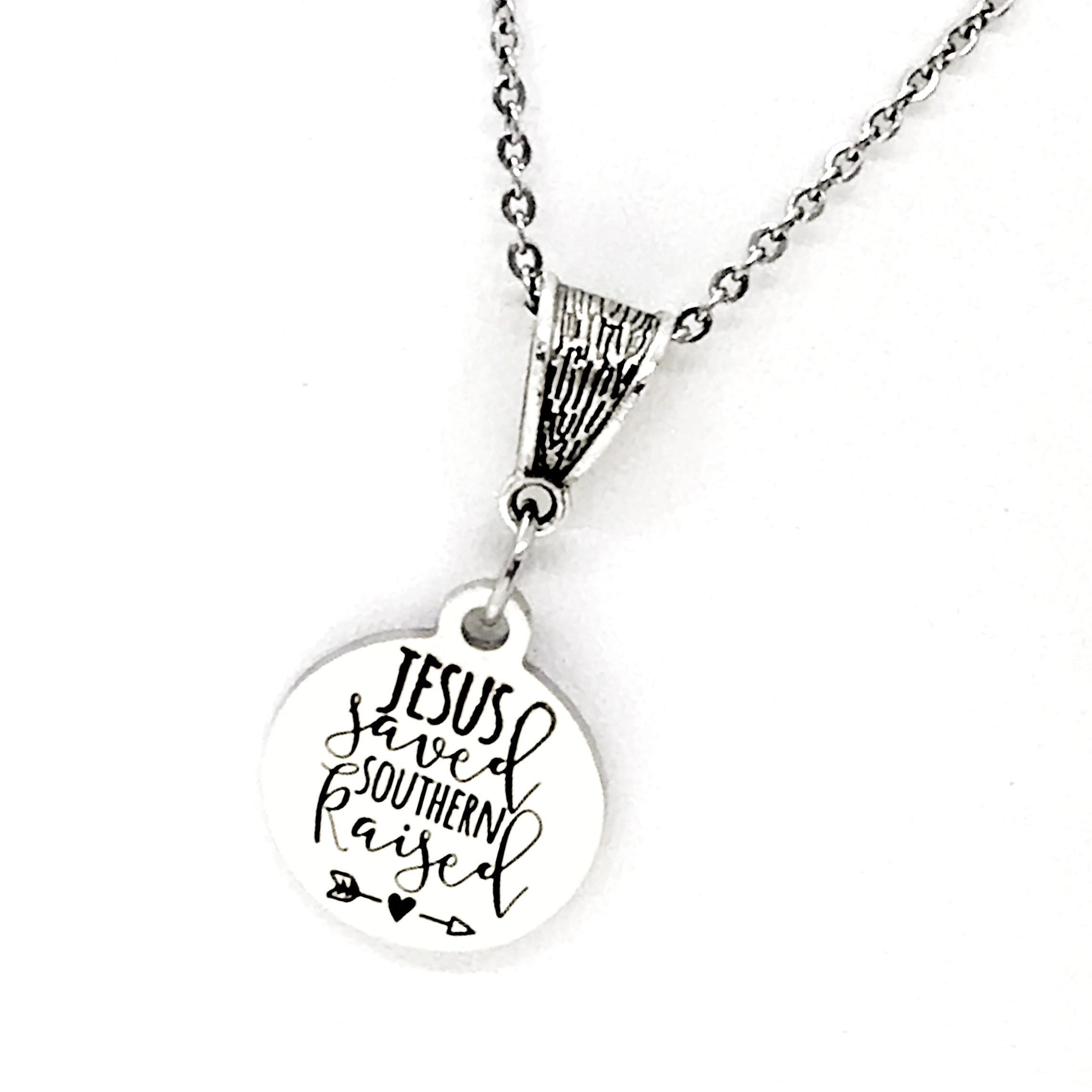 The is a beautiful jewelry piece that has a stainless steel laser engraved charm with “Jesus saved Southern raised” on it. The charm measures approx. 3/4 inch across.