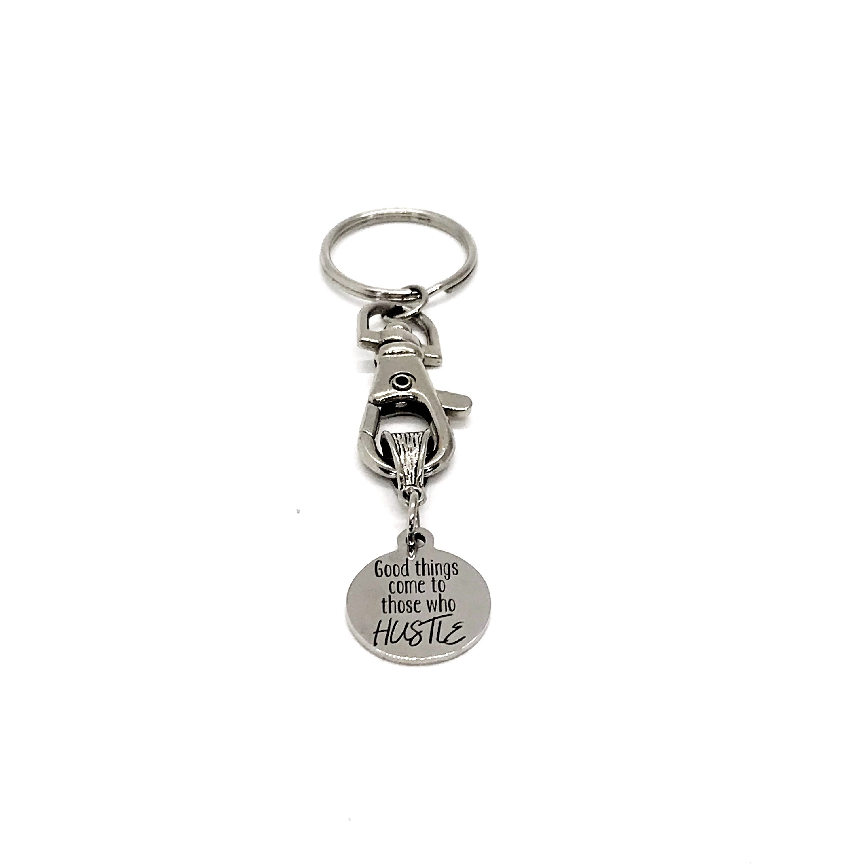 This keychain gift would make a great keychain gift. It has a double-sided stainless steel laser engraved charm with “Good things come to those who hustle” and ‘“Make it happen” on it.