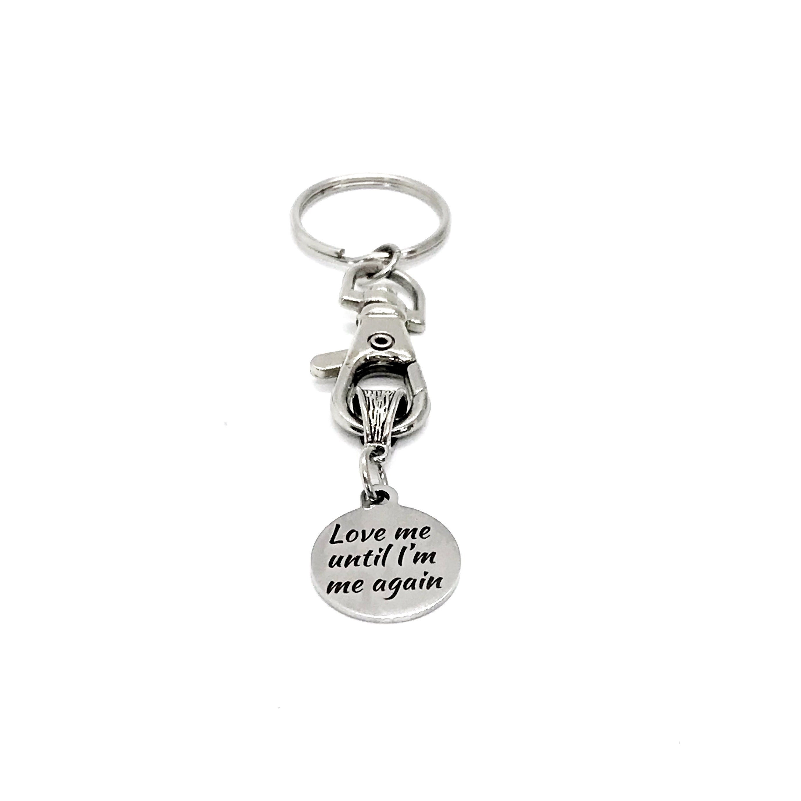 This keychain gift would make a great keychain gift. It has a stainless steel laser engraved charm with “Love me until I’m me again” on it.
