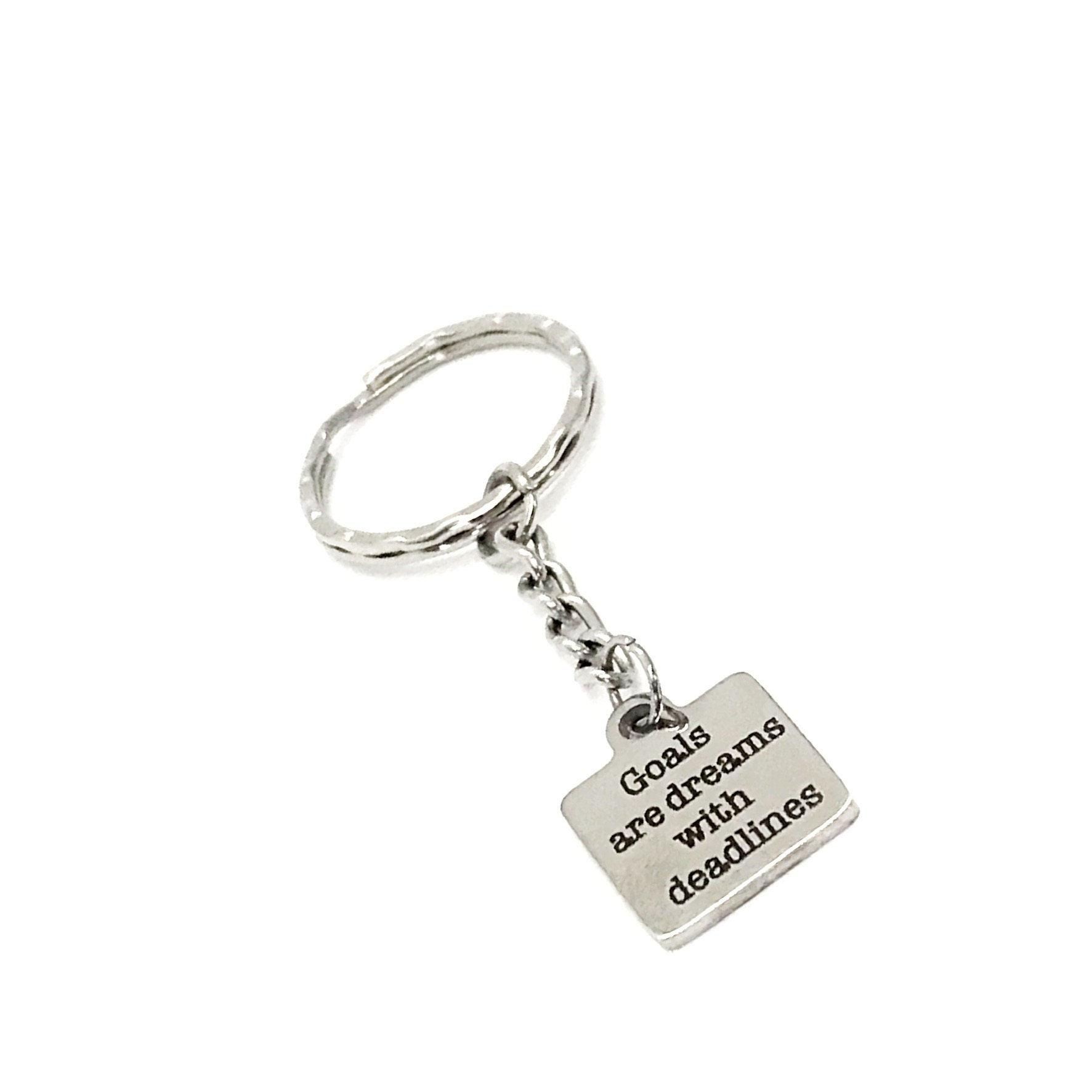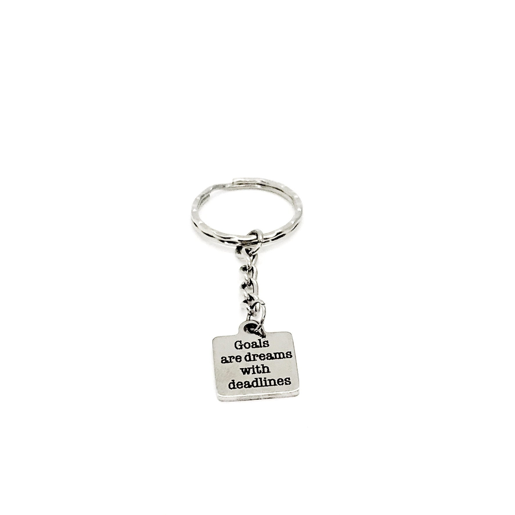 This is a great keychain gift to encourage someone to reach for their goals. It has a stainless steel laser engraved charm with “Goals are dreams with deadlines" on it.
