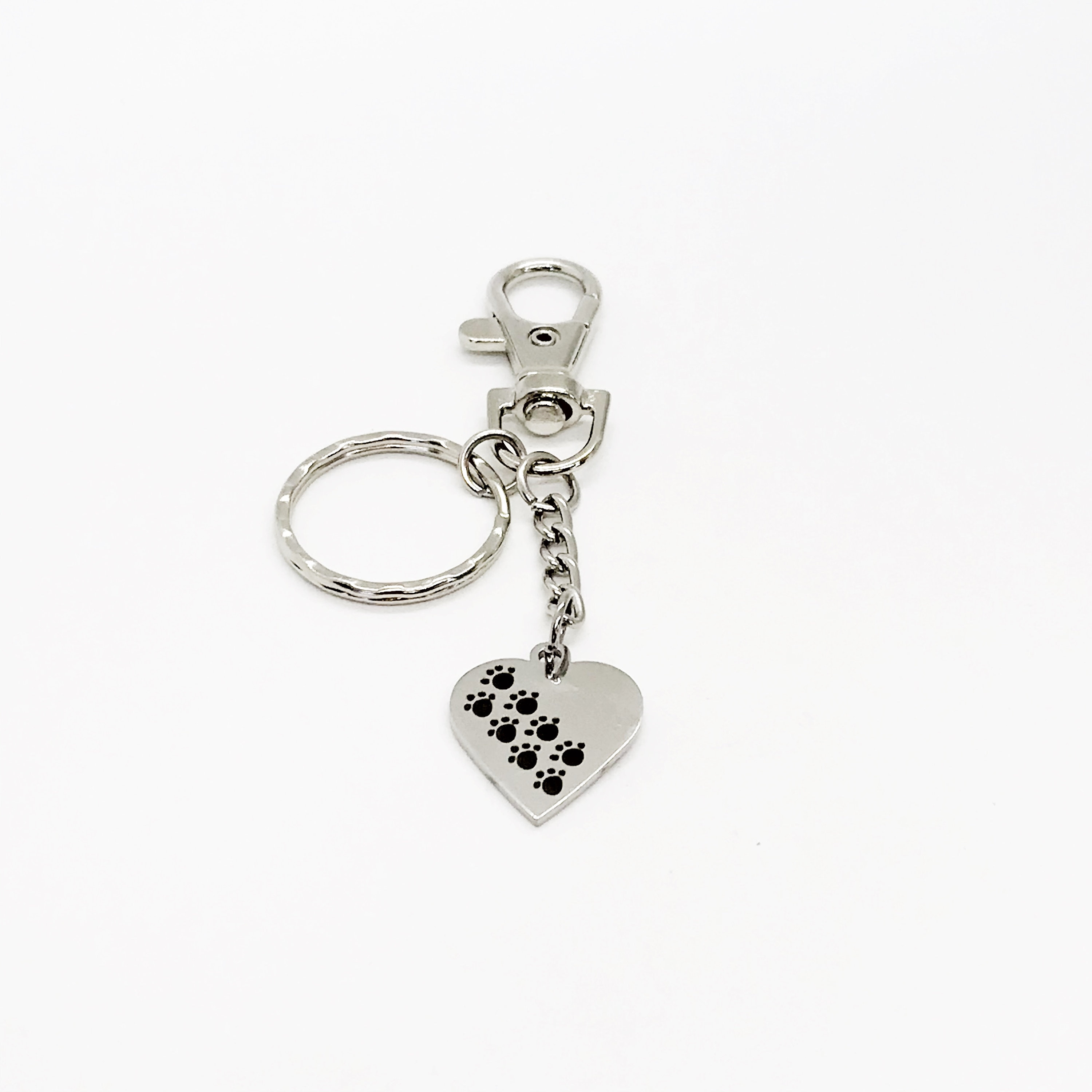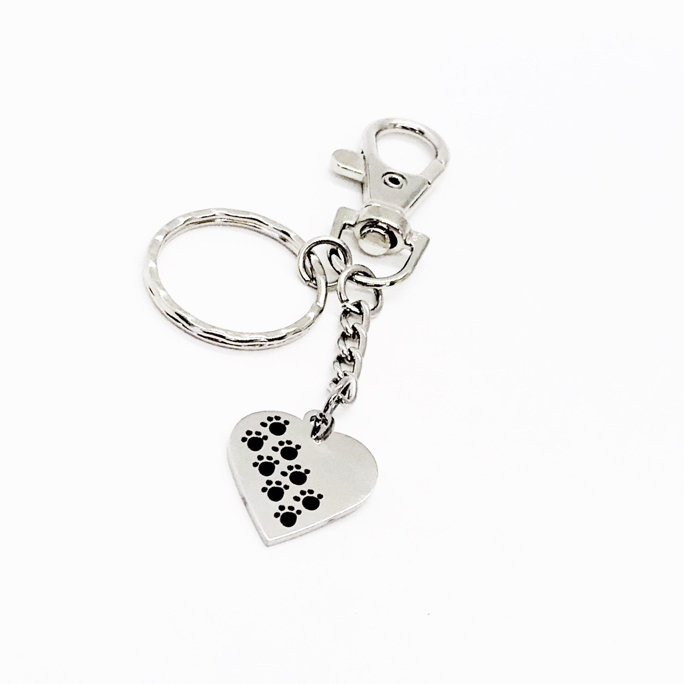 This is a great keychain gift . The keyring can be clipped onto your bag to make it easy to access without digging to the bottom of the bag. It has a stainless steel laser engraved charm with Paw prints on a heart shaped charm. The charm measures approx. 3/4 inch across.