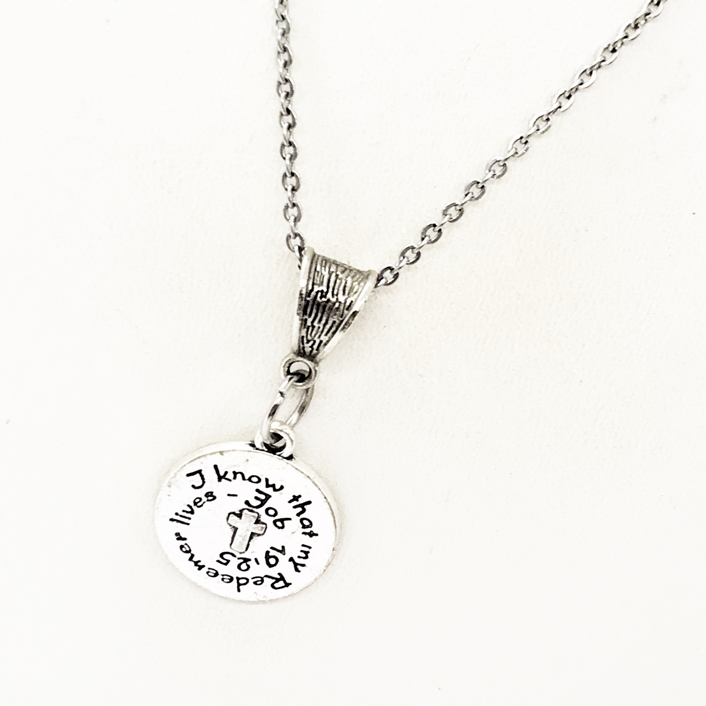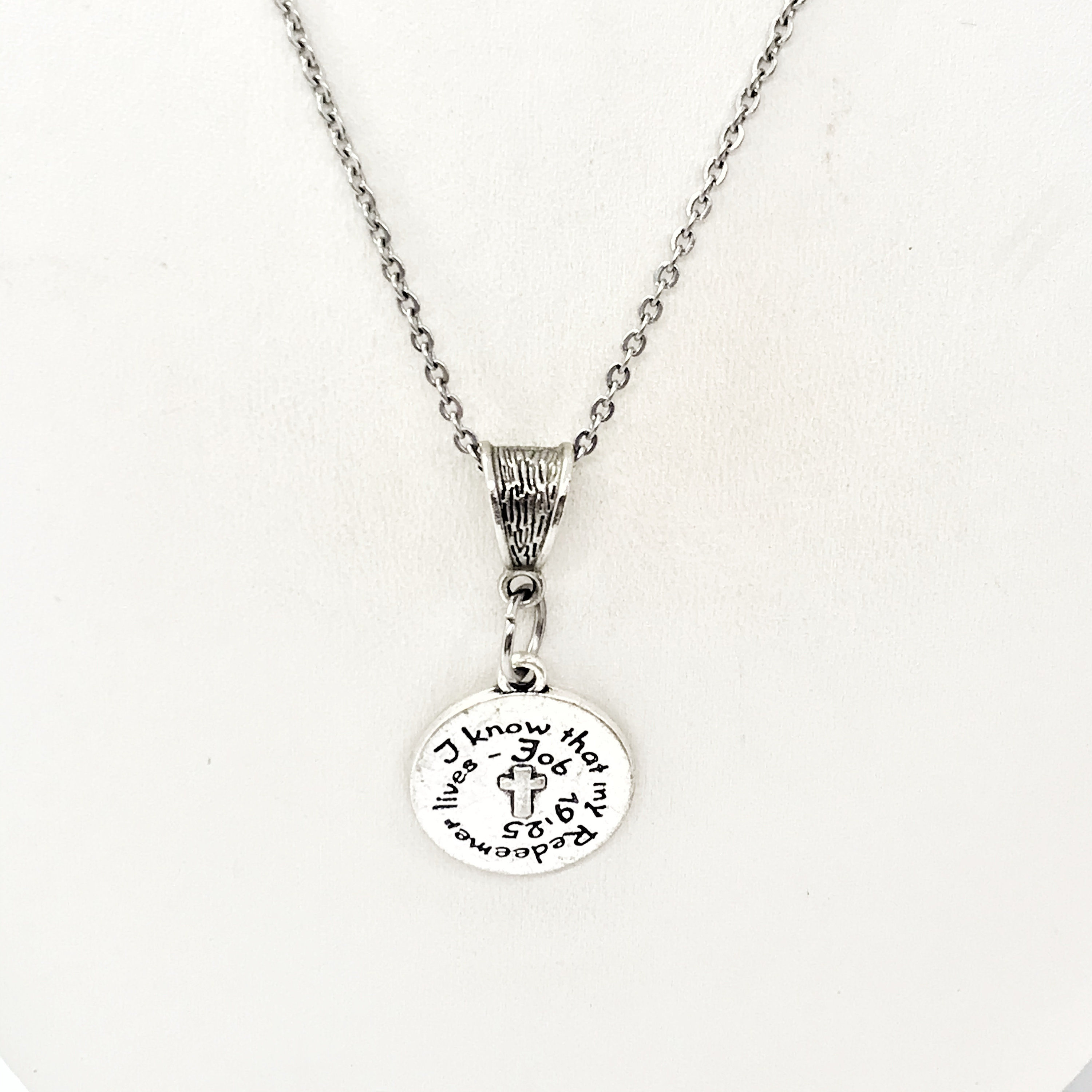 The is a beautiful jewelry piece that has a stainless steel laser engraved charm with “I know that my Redeemer lives” from Job 19:25 on it. The charm measures approx. 3/4 inch across.