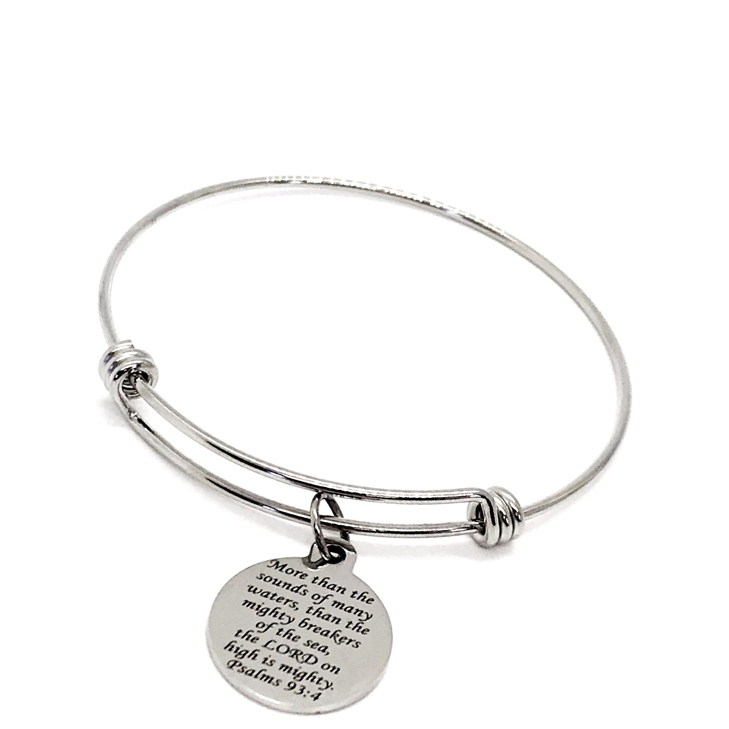 This is a beautiful bangle bracelet with a laser engraved stainless steel charm that has "More than the sounds of many waters, than the mighty breakers of the sea, the Lord is mighty on high" from Psalms 93:4 on it.