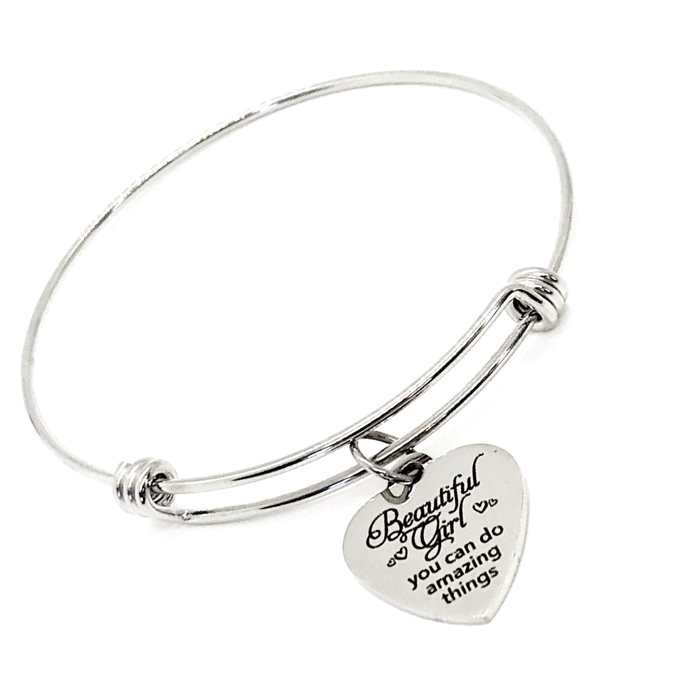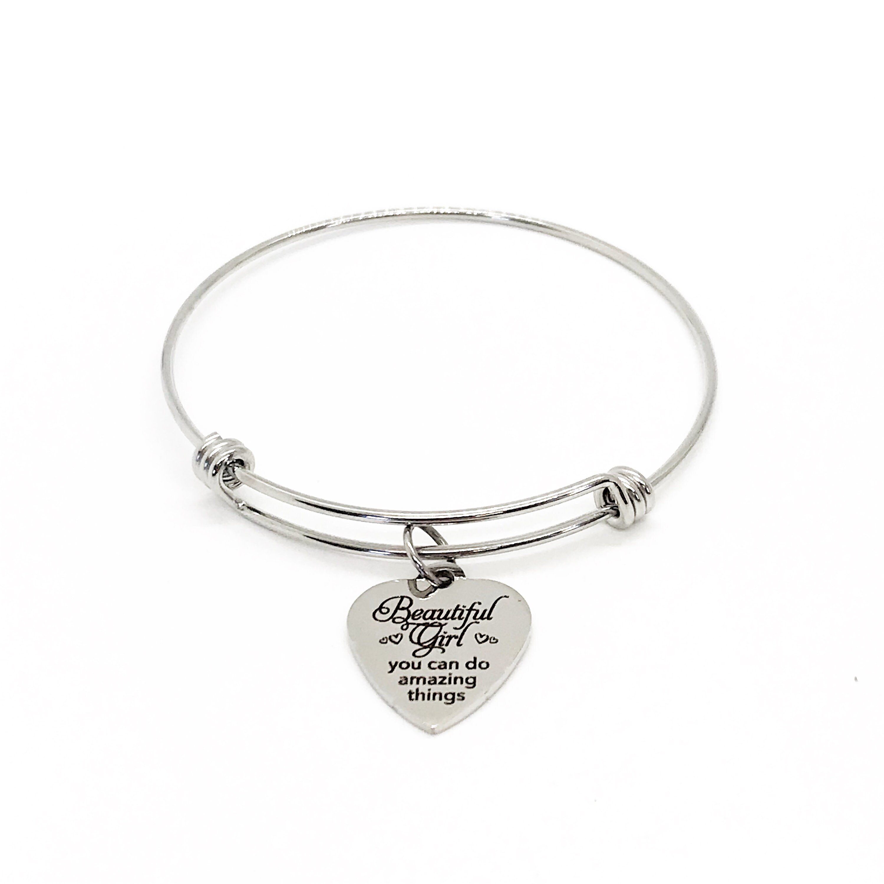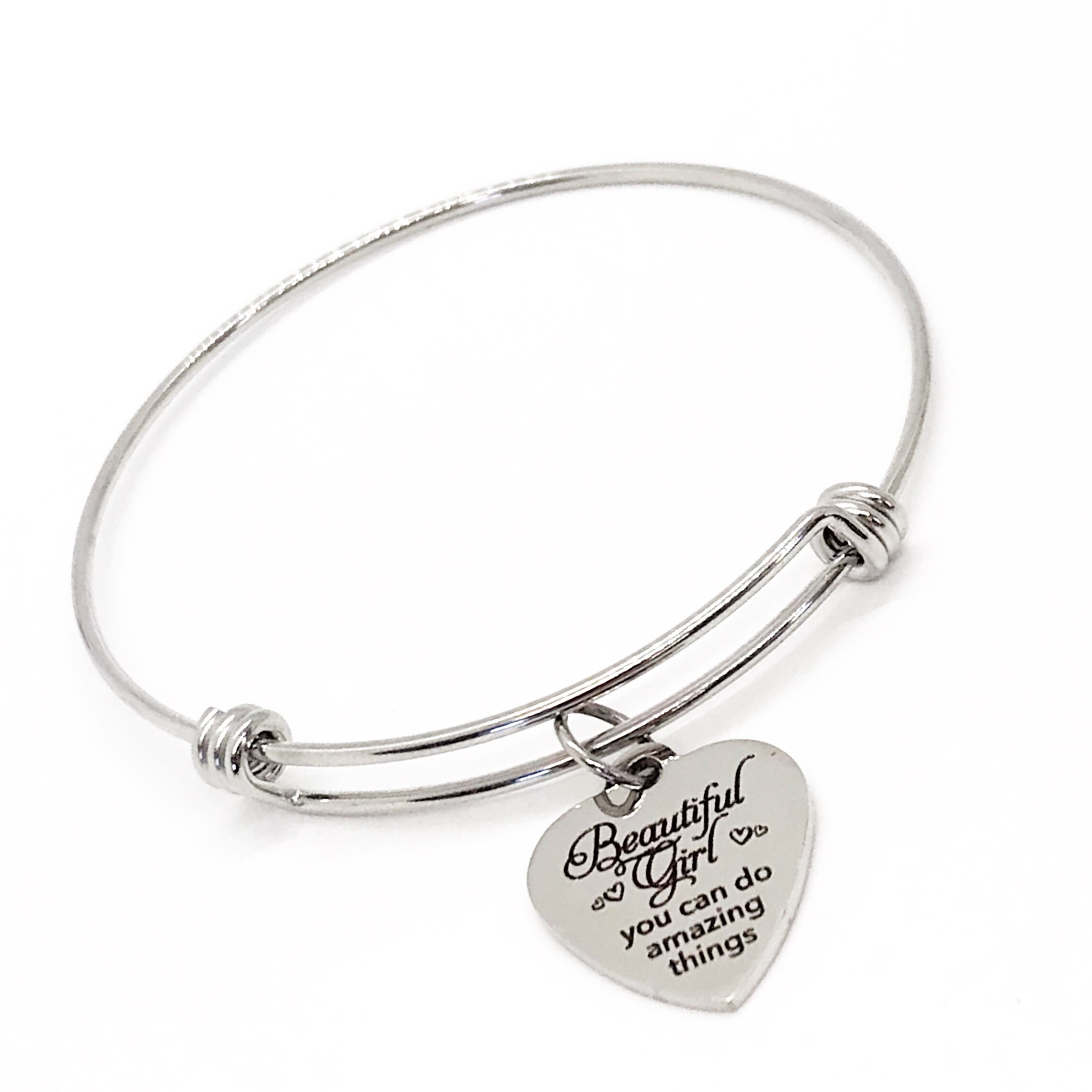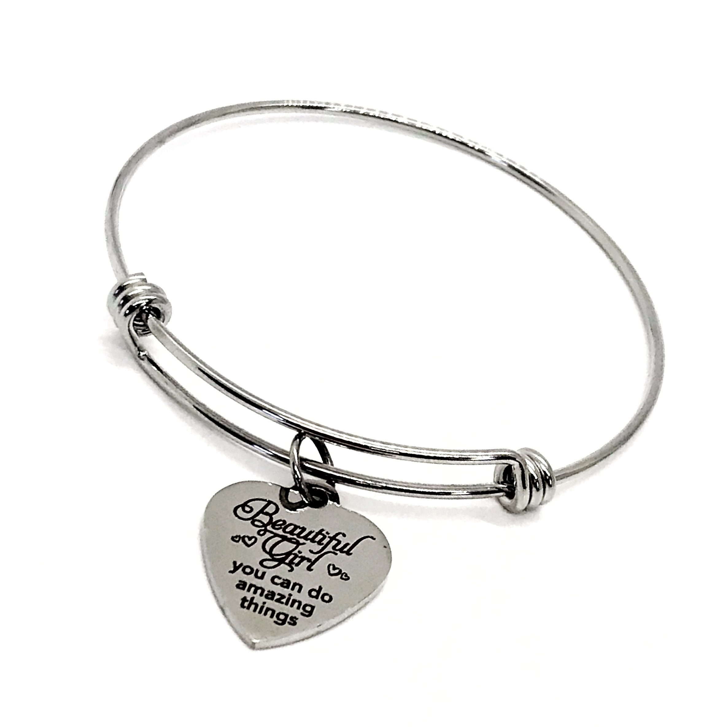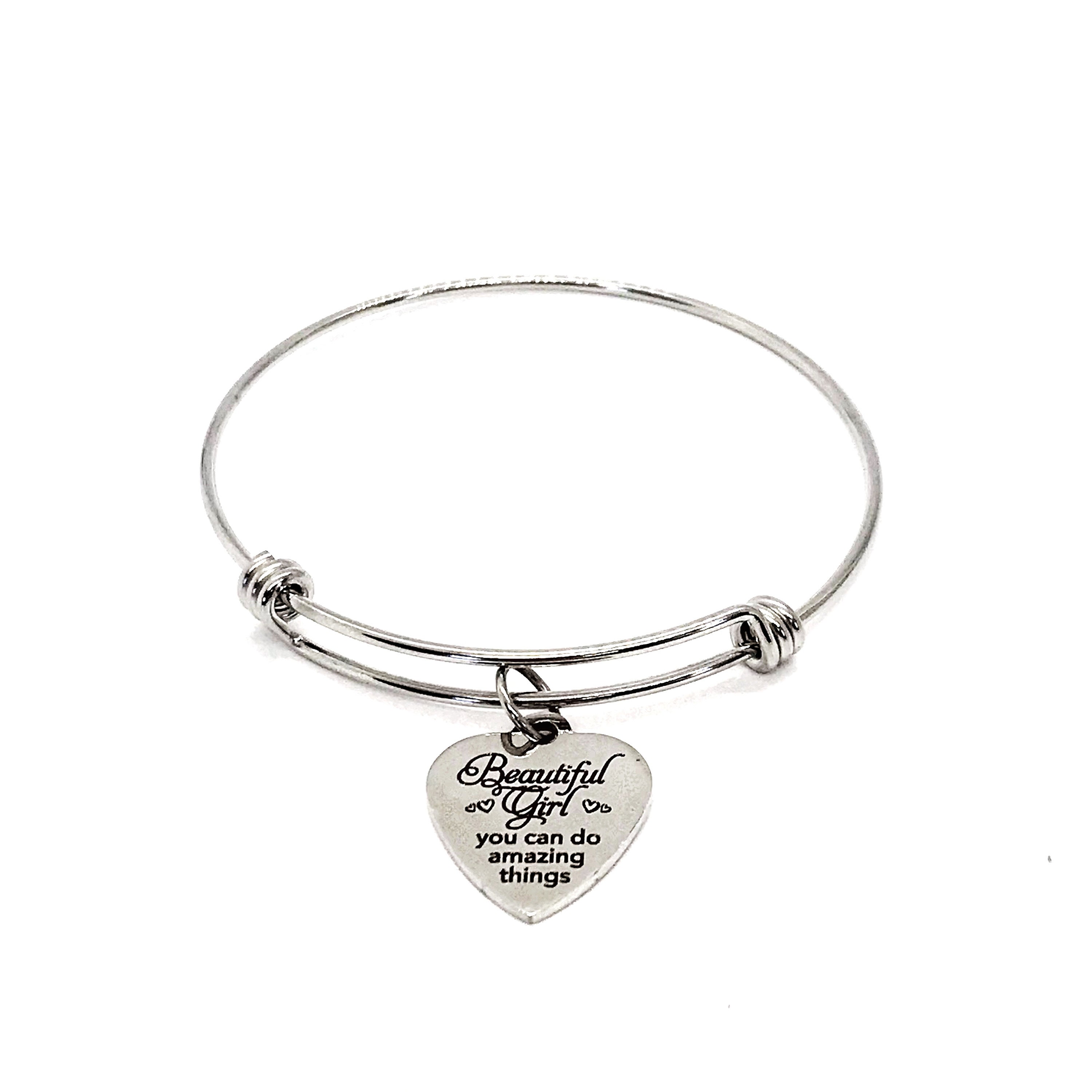 This is a beautiful bangle bracelet with a laser engraved stainless steel charm that has “Beautiful Girl you can do amazing things” on it.