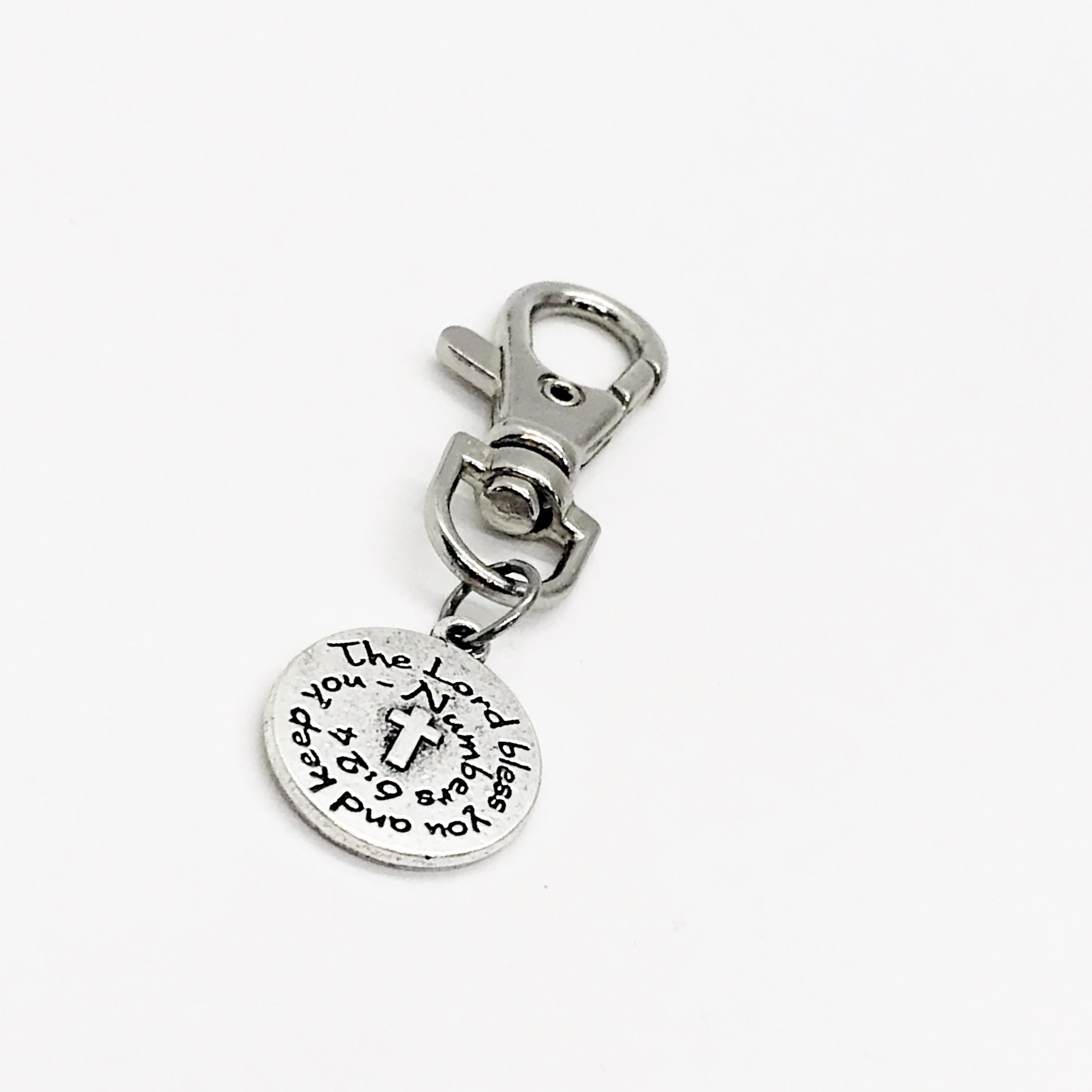 This is a great zipper pull or bag charm or keychain clip-on charm with “The Lord bless you and keep you” from Numbers 6:24 on it.