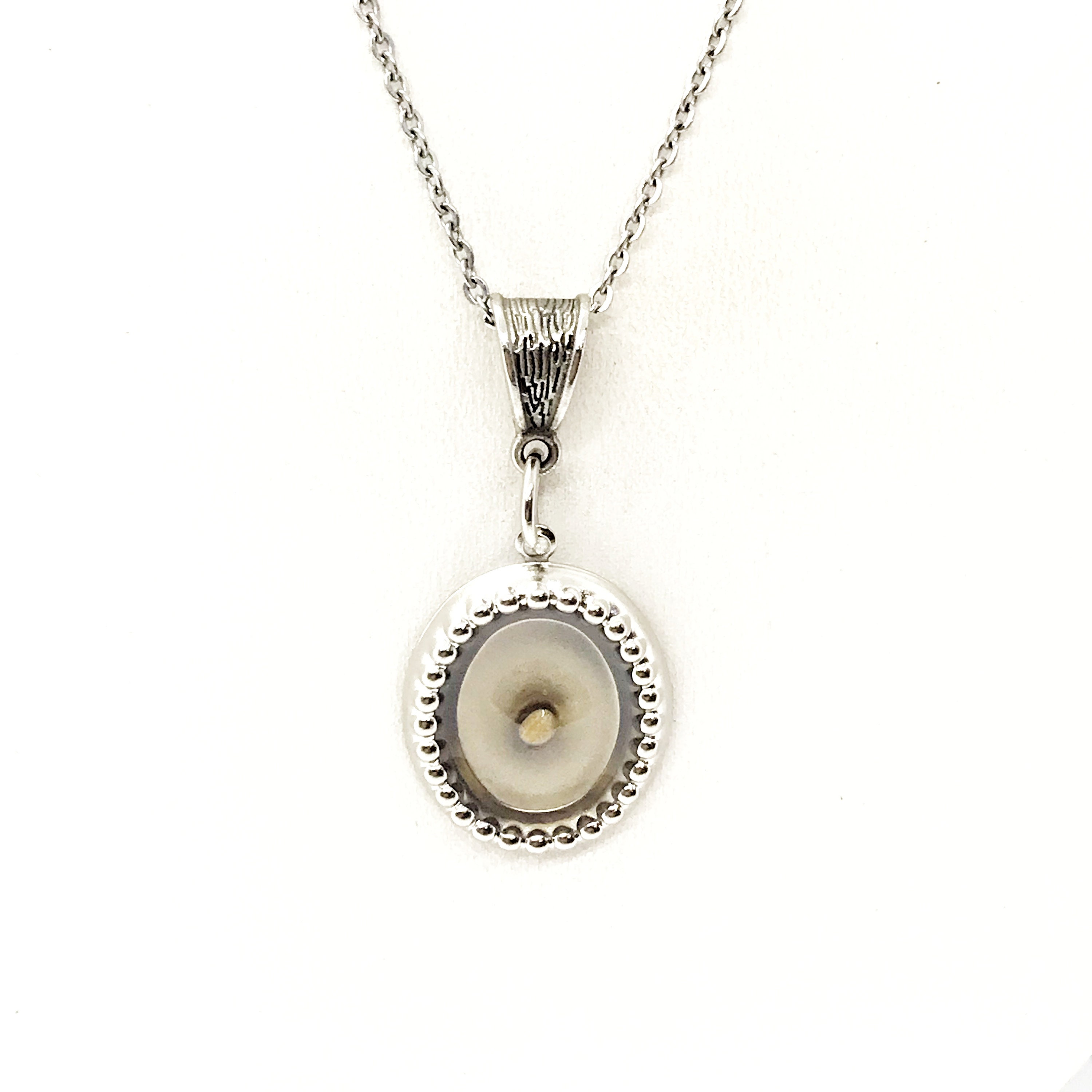 This beautiful necklace would make wonderful gift to remind someone that with faith the size of a mustard seed, we can move mountains. It is a silver-tone mustard seed pendant on it with a silver-tone bail on a stainless steel necklace.