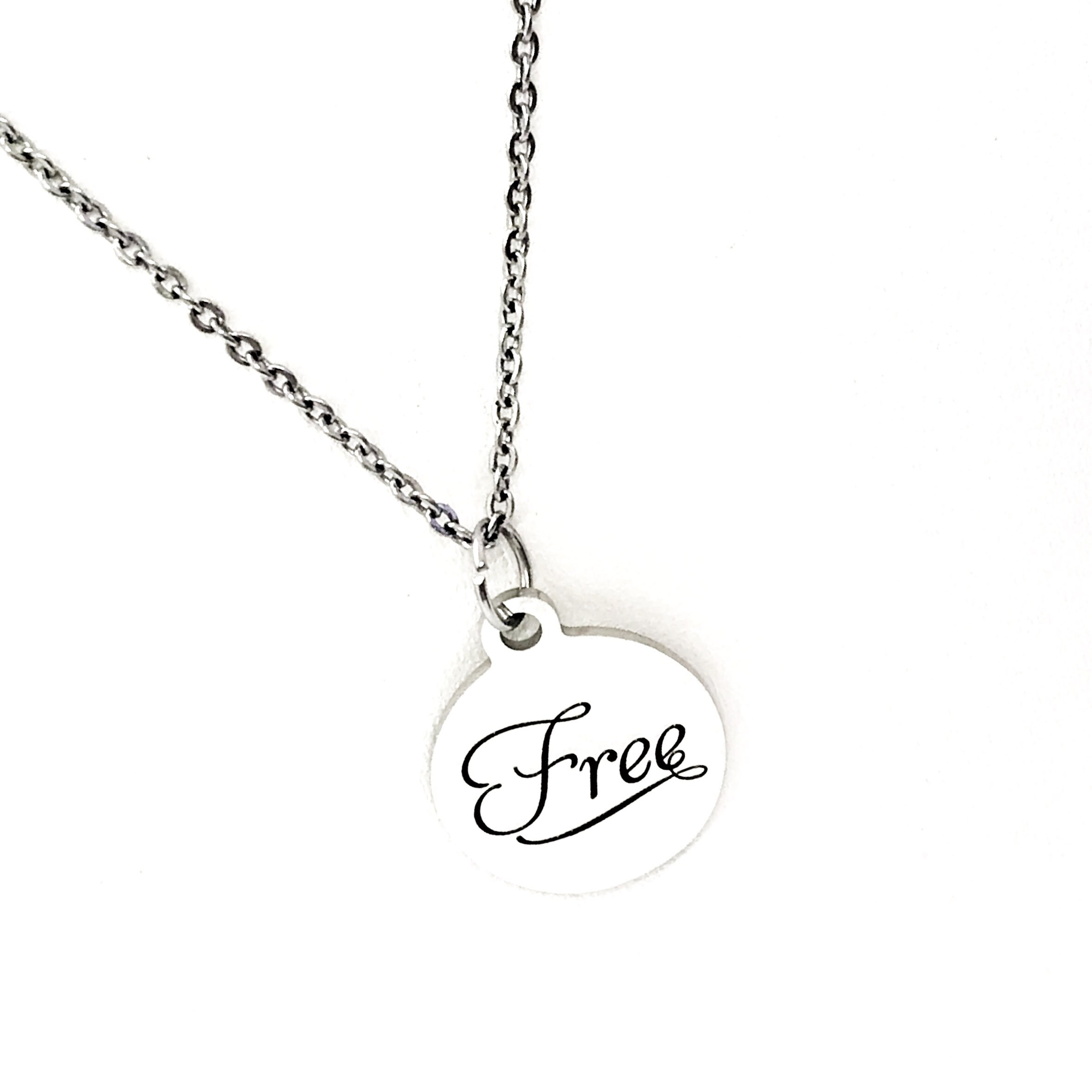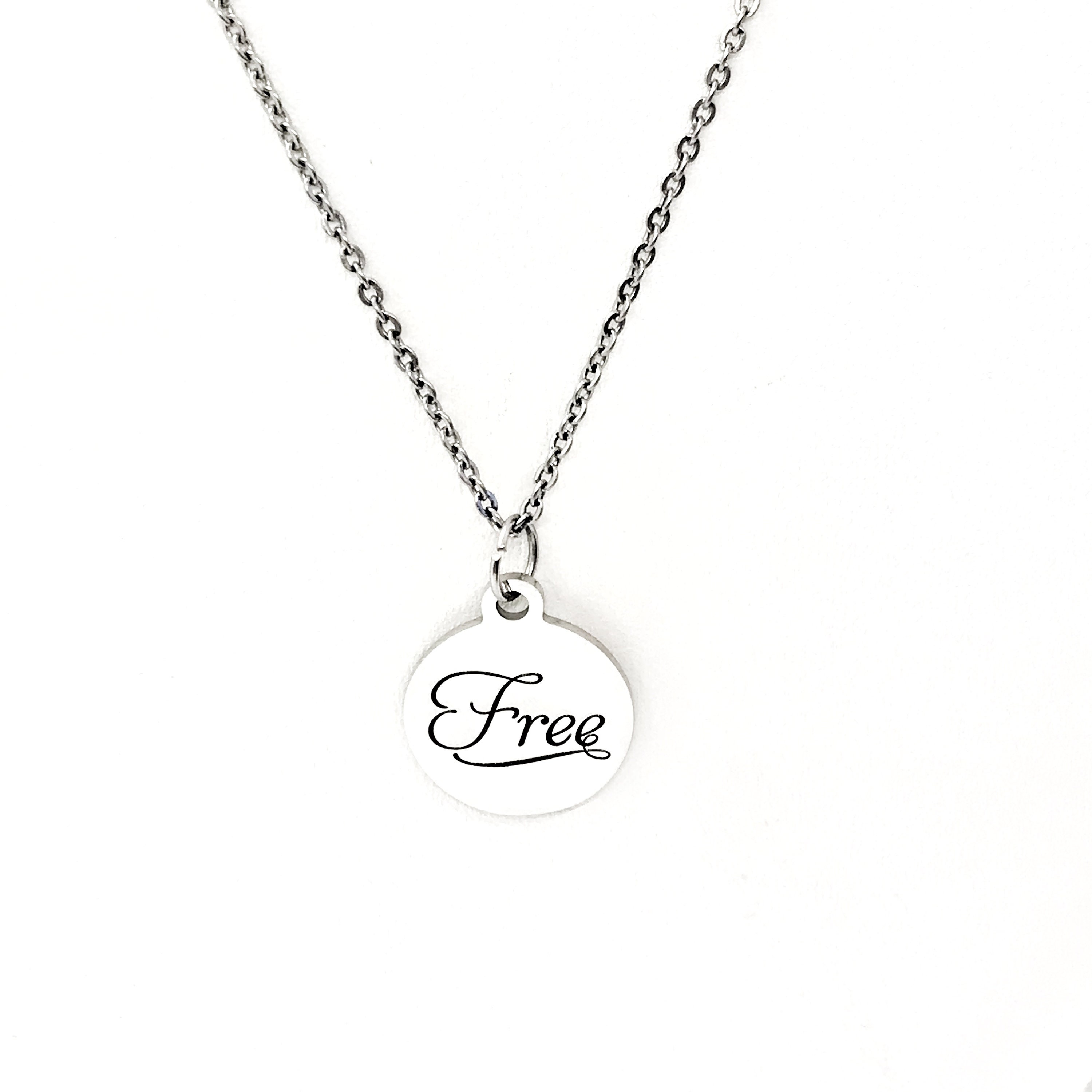 This is a simple but classic motivating gift pendant necklace. The pendant is a stainless steel laser engraved charm that has “Free” on it. This pendant is available on your choice of 16, 18, 20, 22, 24, 26, 28 or 30 inch chain. The pendant is also available for individual purchase if you have another chain on which you would like to wear it. The pendant measures approx. 3/4 inch across.