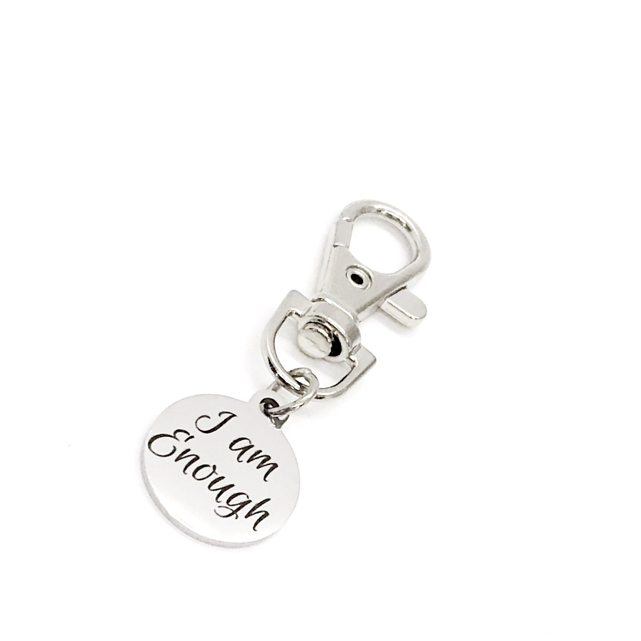 This is a great zipper pull or bag charm or keychain clip-on charm with “I am Enough” on it.