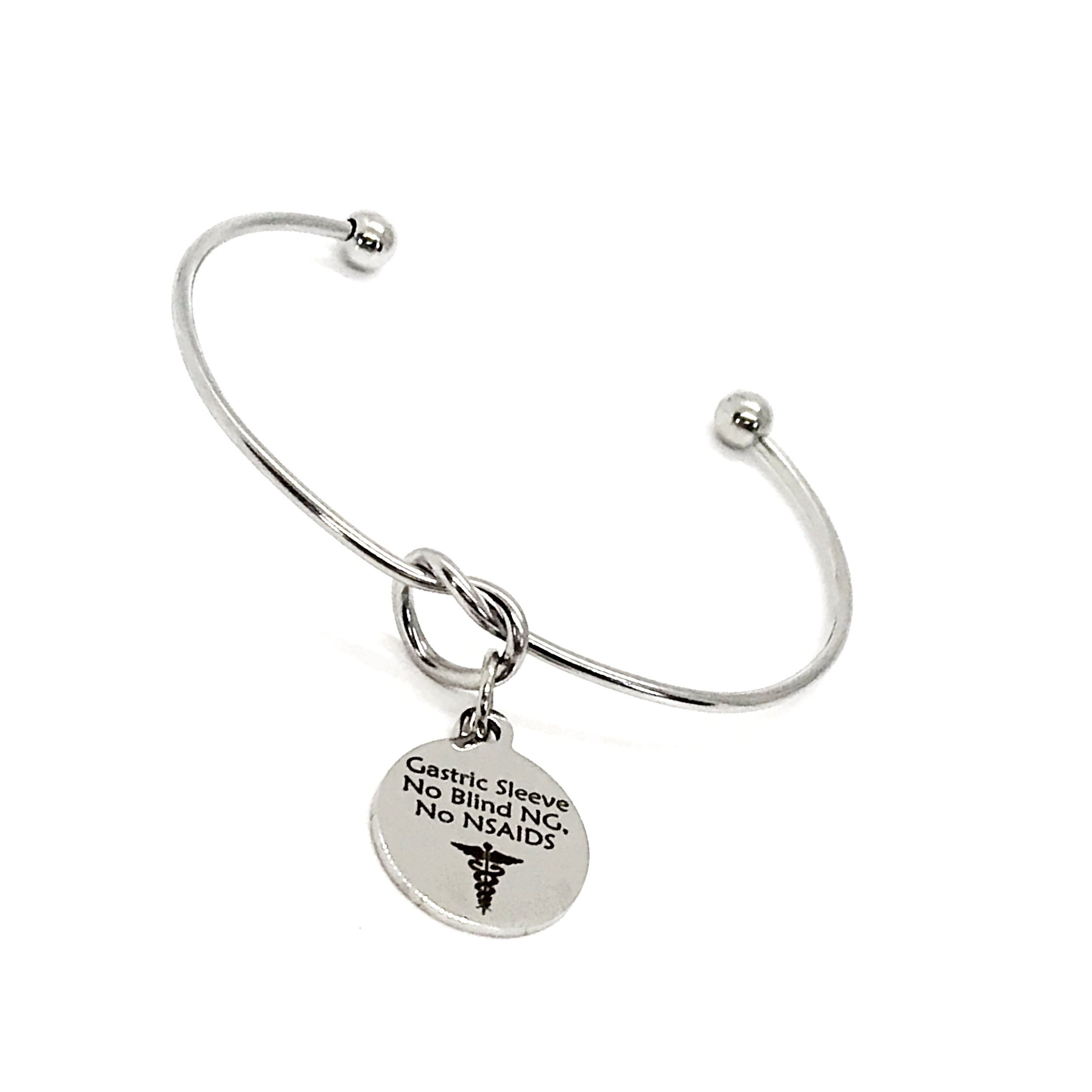 This is a beautiful knotted cuff bracelet with an engraved charm with “Gastric Sleeve, No Blind NG, No NSAIDS” on it. The charm measures approx. 3/4 in across.