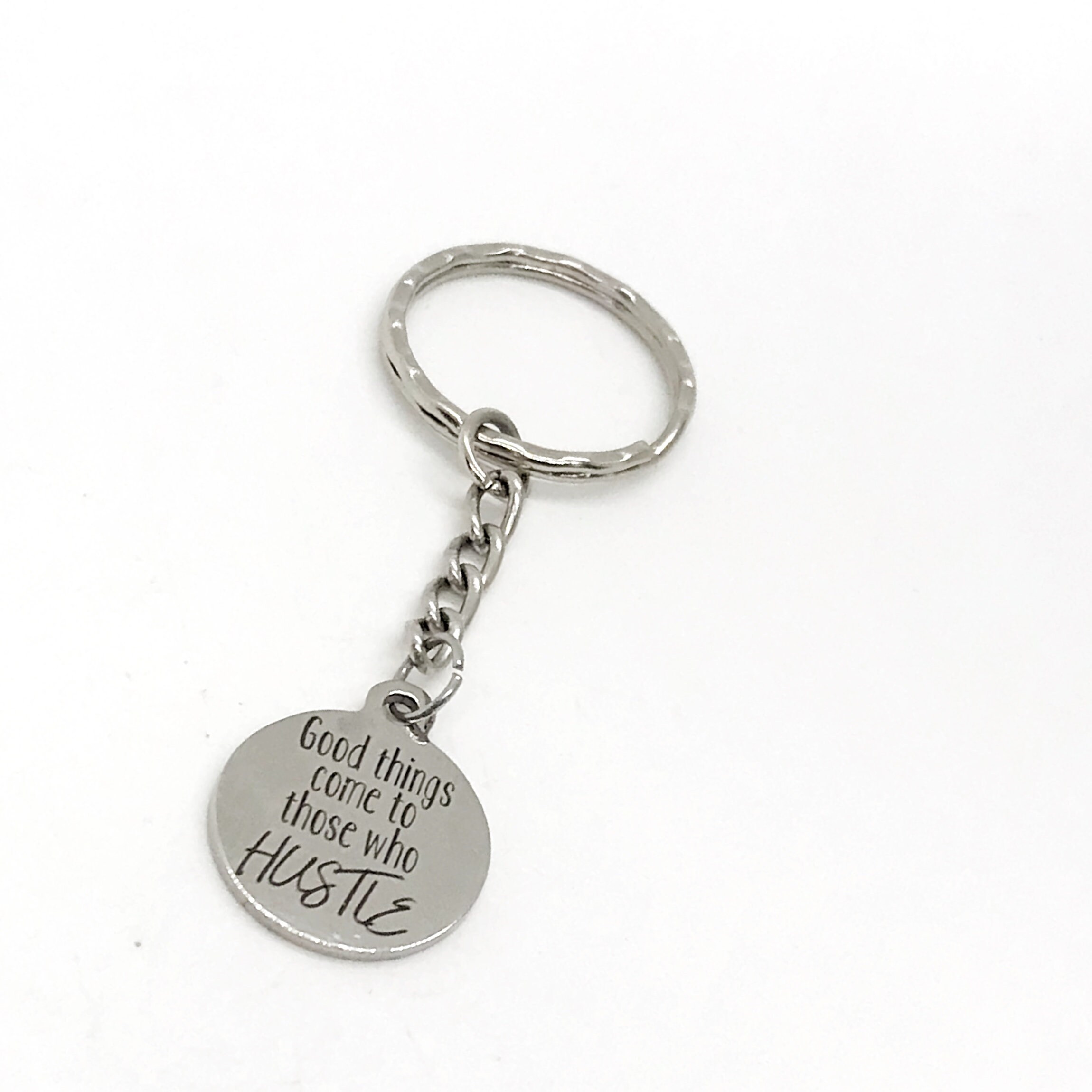 This is a great keychain gift with a stainless steel laser engraved charm with “Good things come to those who hustle” on one side and “Make it happen” on the other.