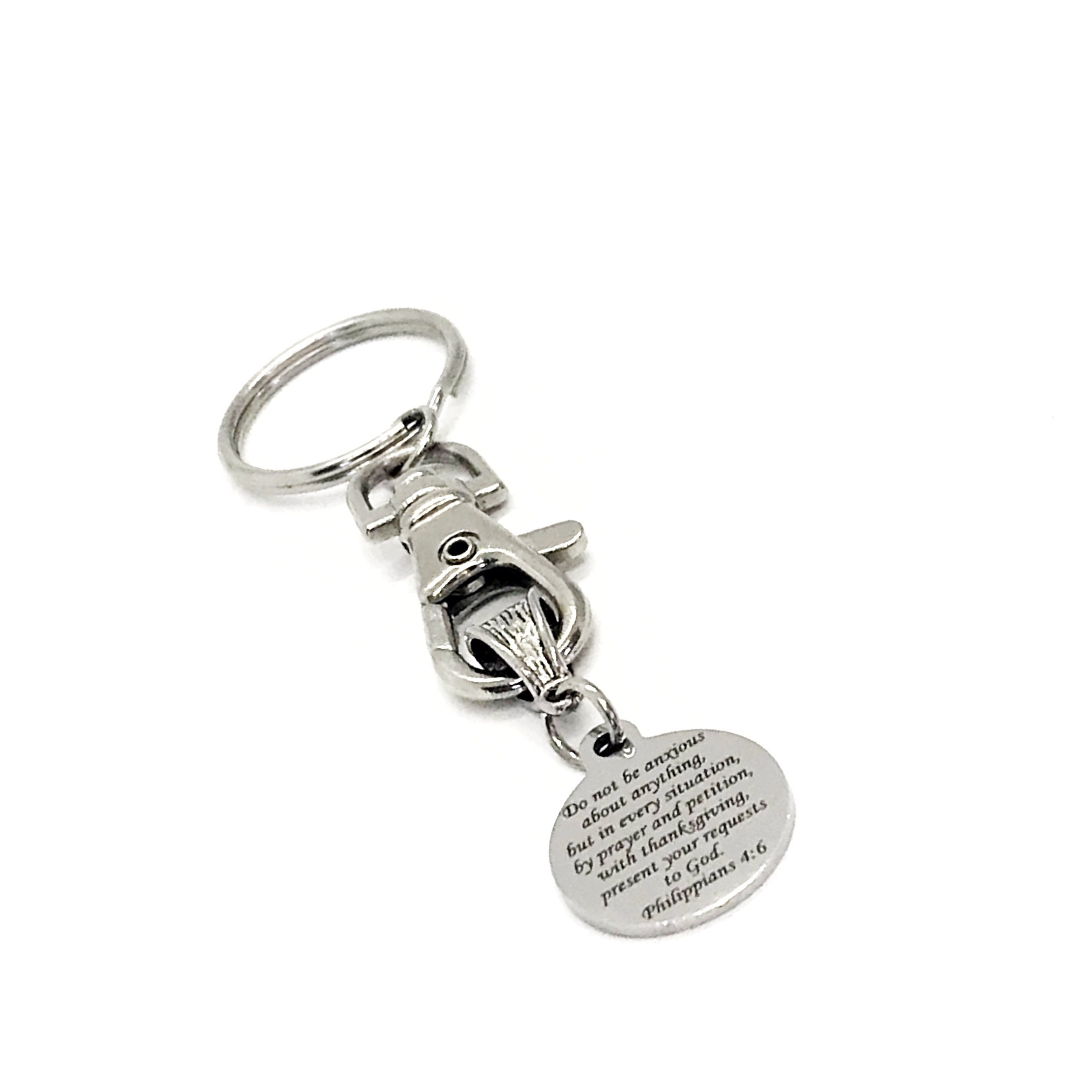 This keychain gift would make a great Christian keychain gift. It has a stainless steel laser engraved charm with “Do not be anxious about anything but in every situation, by prayer and petition, with thanksgiving, present your requests to God.” from Philippians 4:6 on it.