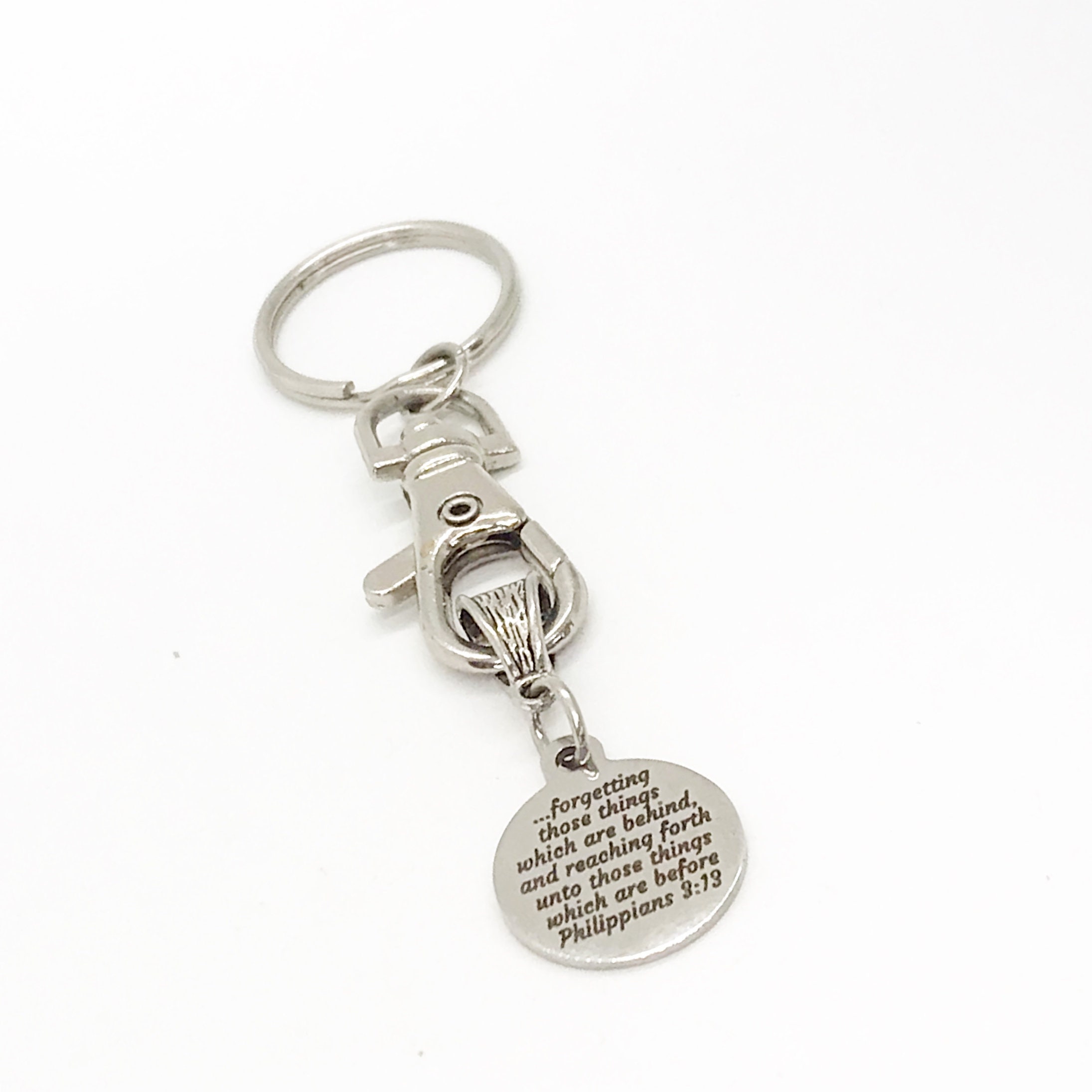 This keychain gift would make a great keychain gift. It has a stainless steel laser engraved charm with “ ...forgetting those things which are behind, and reaching forth unto those things which are before” from Philippians 3:13 on it.